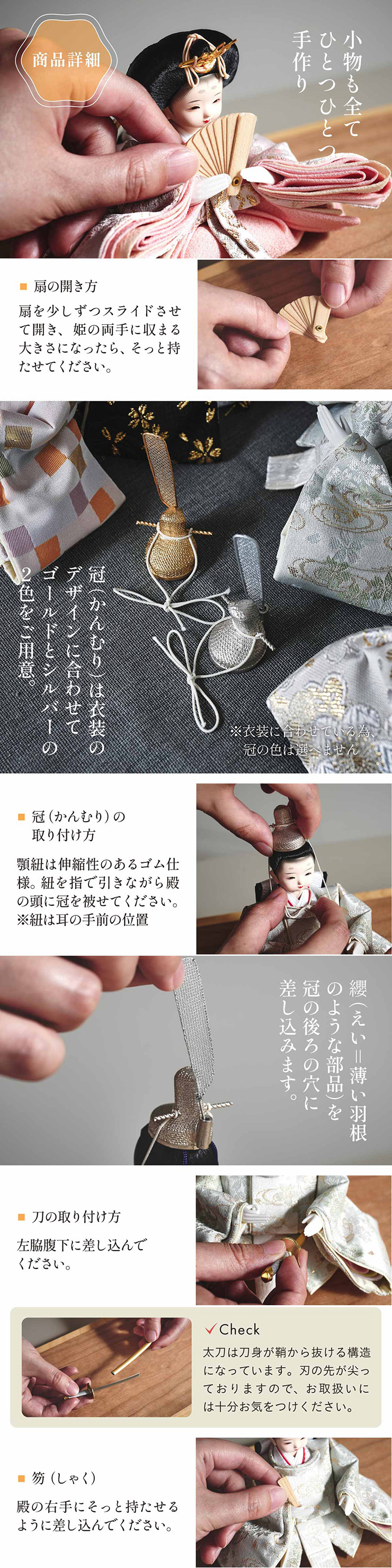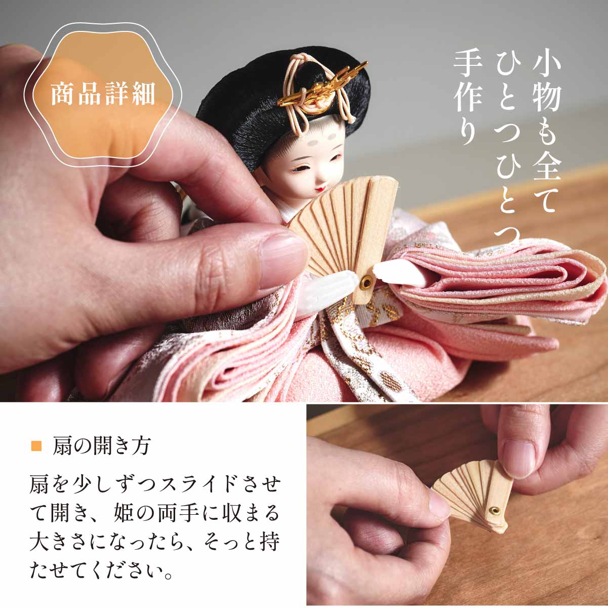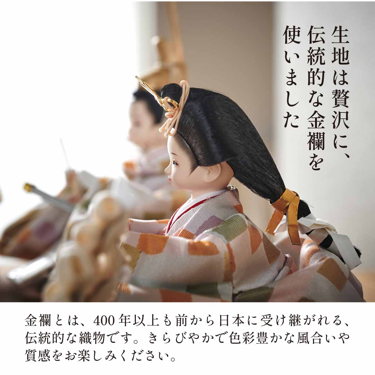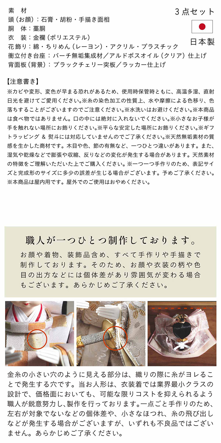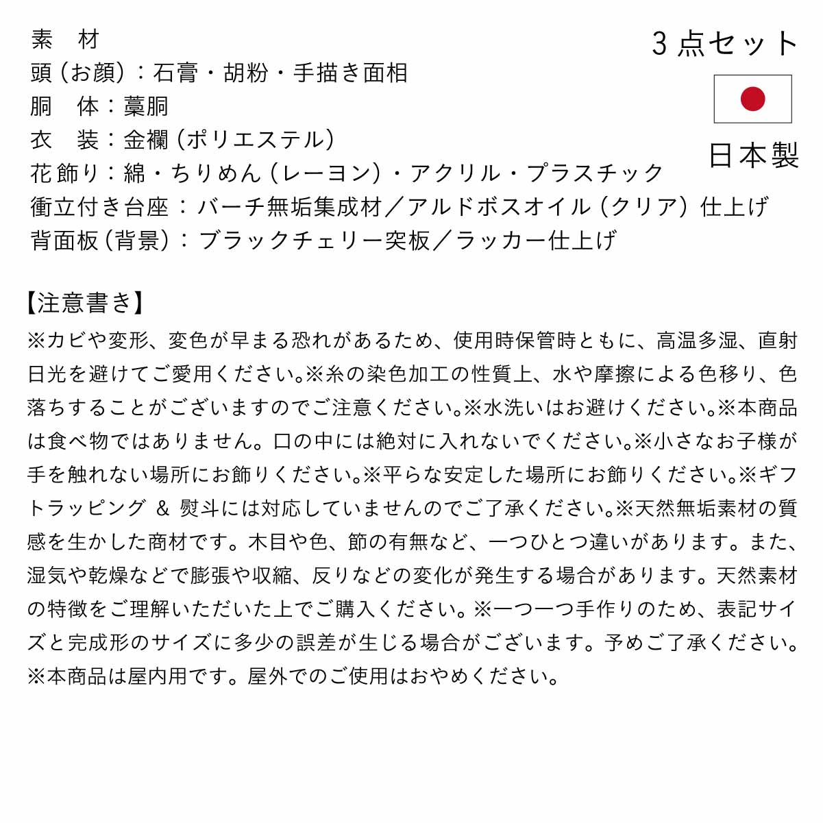 | 材質・素材 | 頭(お顔):石膏・胡粉・手描き面相 胴体:藁胴 衣装:金襴(ポリエステル) 花飾り:綿・ちりめん(レーヨン)・アクリル・プラスチック 衝立付き台座:バーチ無垢集成材・アルドボスオイル(クリア)仕上げ 背面板:ブラックチェリー突板・ラッカー仕上げ |