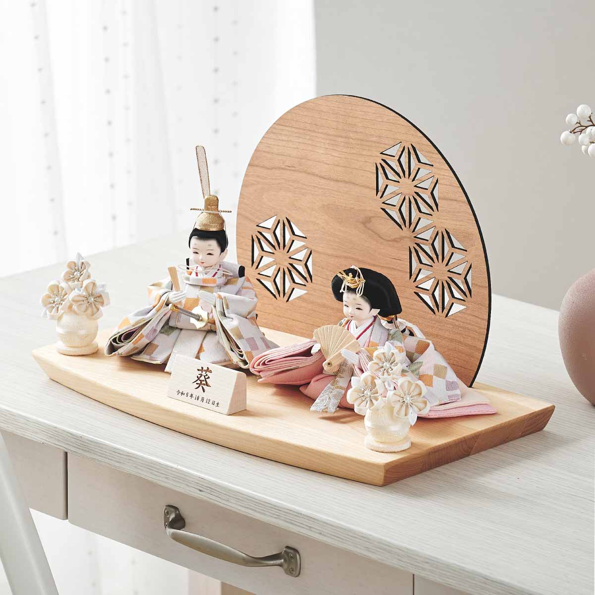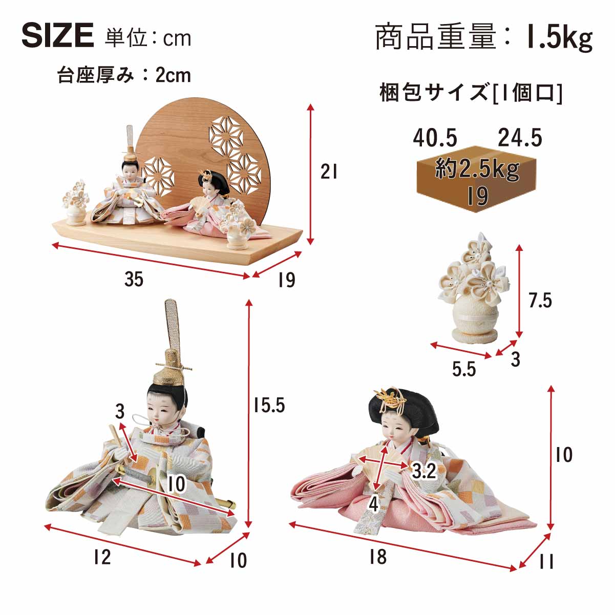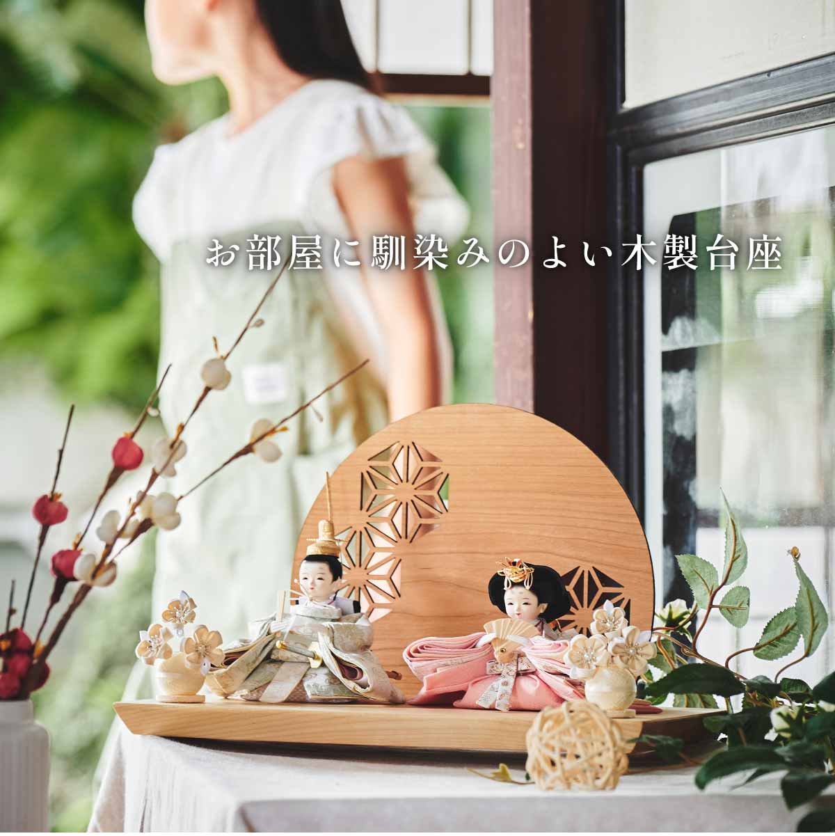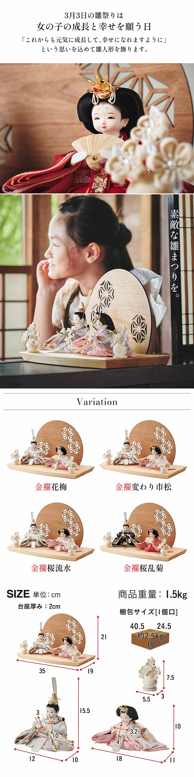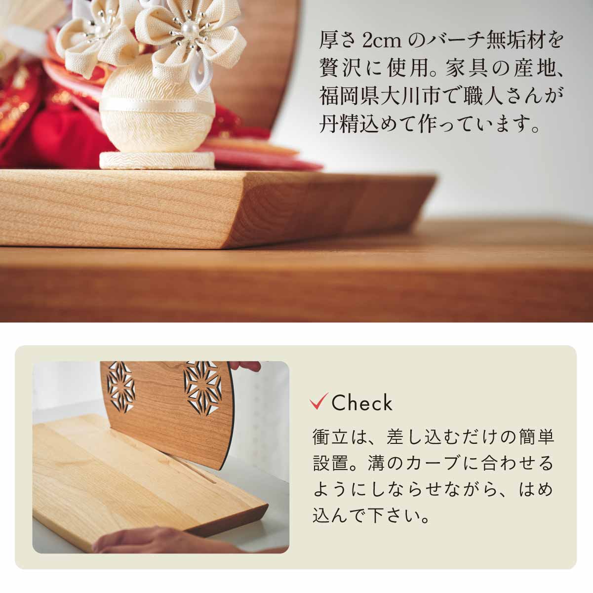 | 材質・素材 | 頭(お顔):石膏・胡粉・手描き面相 胴体:藁胴 衣装:金襴(ポリエステル) 花飾り:綿・ちりめん(レーヨン)・アクリル・プラスチック 衝立付き台座:バーチ無垢集成材・アルドボスオイル(クリア)仕上げ 背面板:ブラックチェリー突板・ラッカー仕上げ |