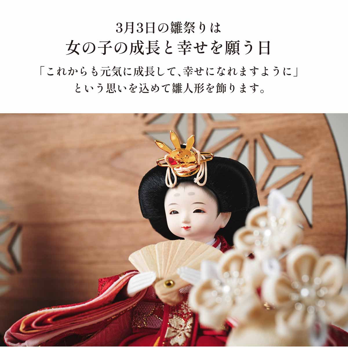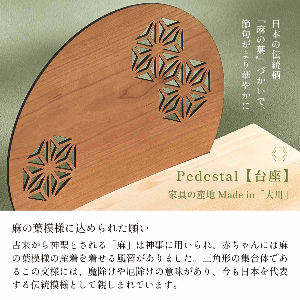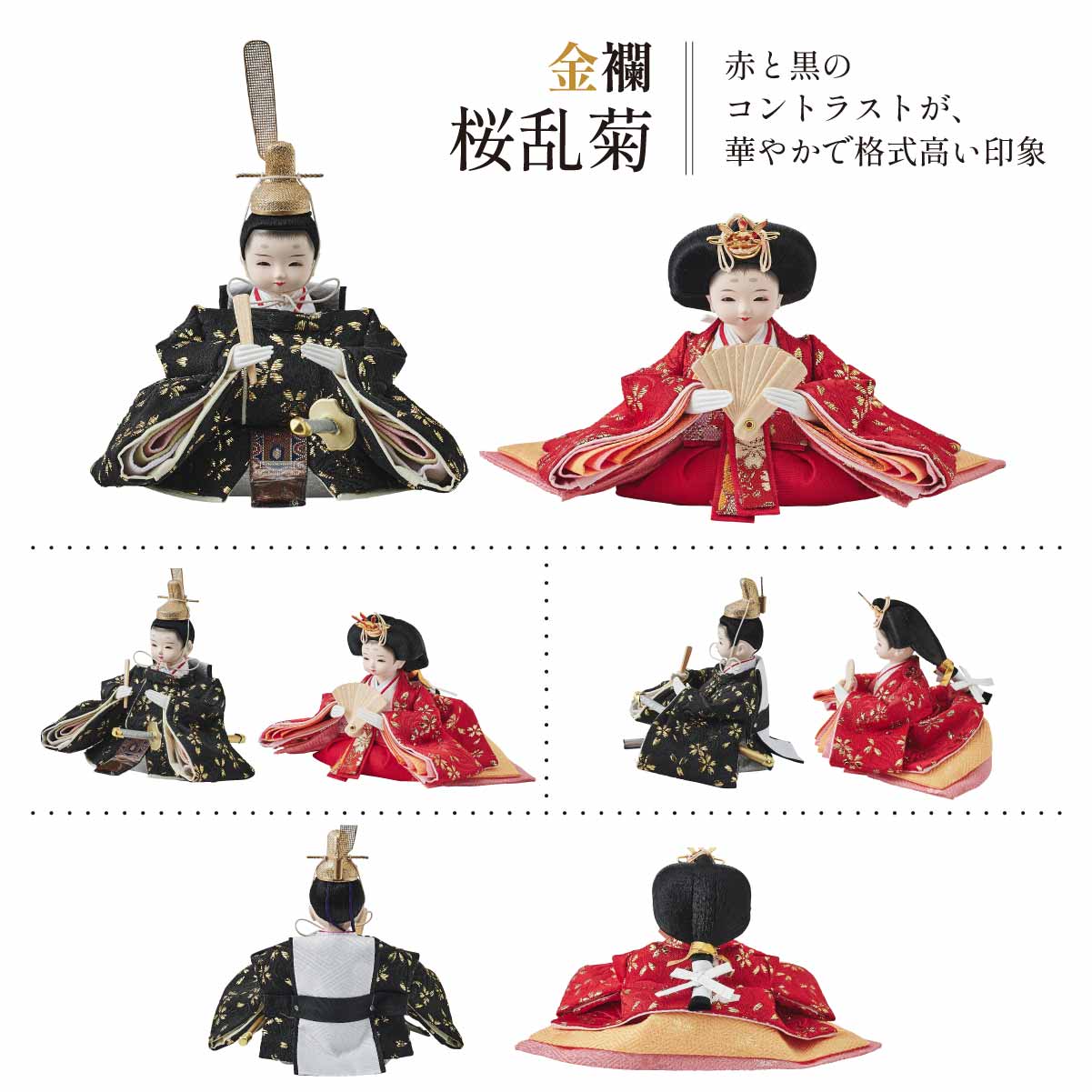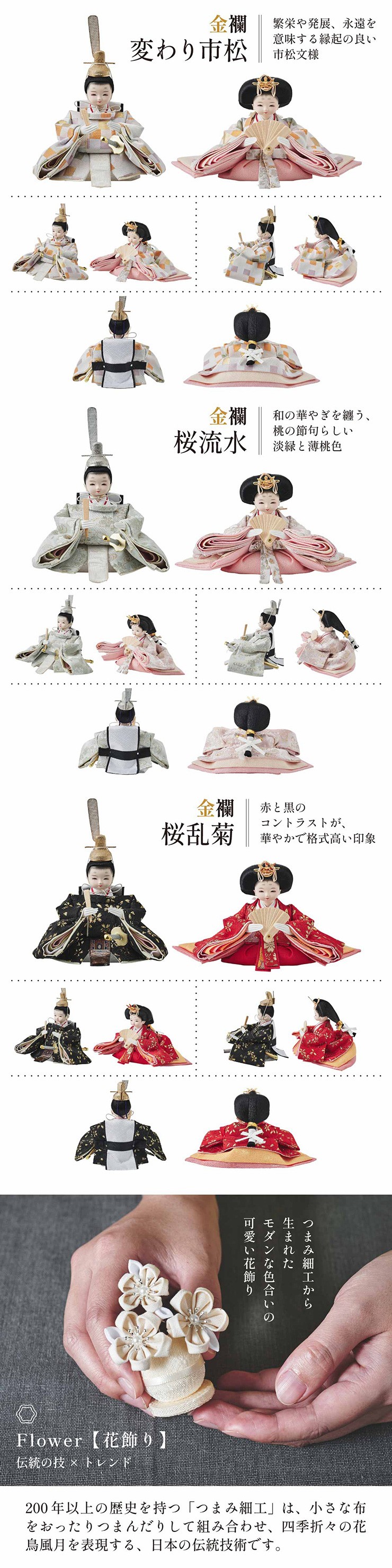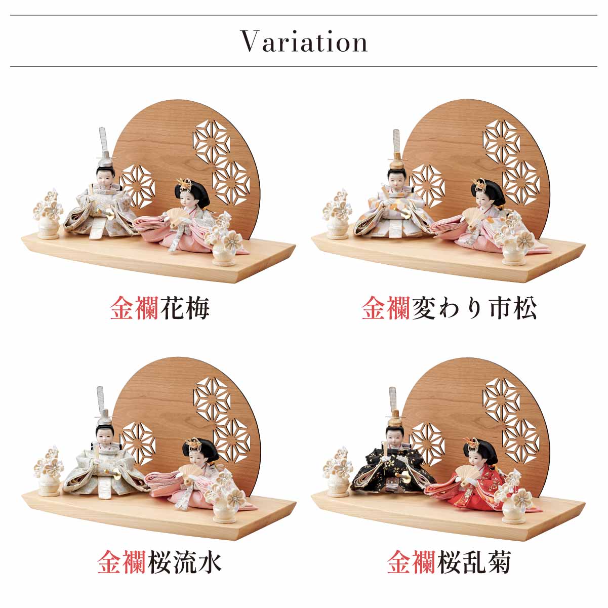| 材質・素材 | 頭(お顔):石膏・胡粉・手描き面相 胴体:藁胴 衣装:金襴(ポリエステル) 花飾り:綿・ちりめん(レーヨン)・アクリル・プラスチック 衝立付き台座:バーチ無垢集成材・アルドボスオイル(クリア)仕上げ 背面板:ブラックチェリー突板・ラッカー仕上げ |