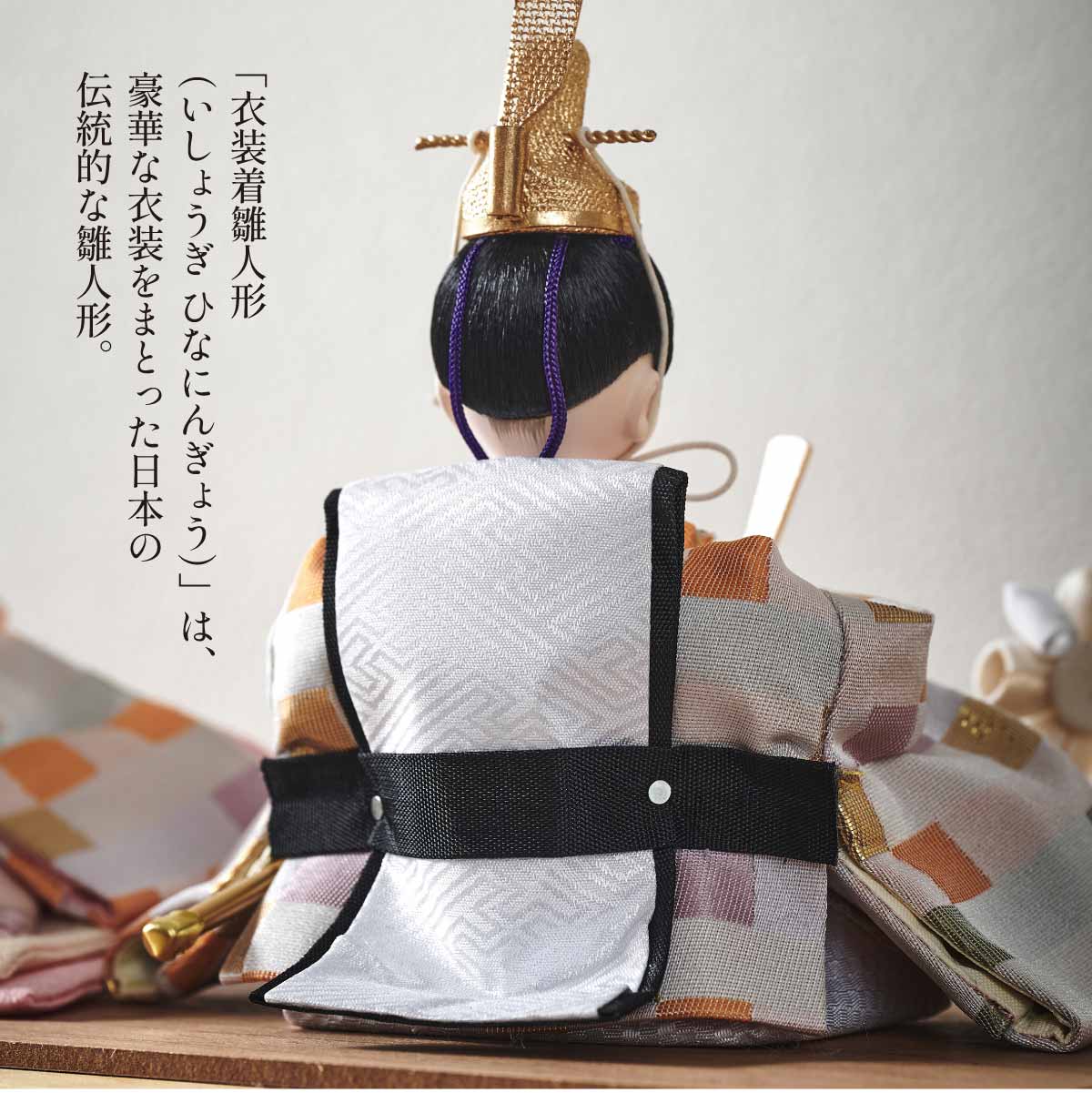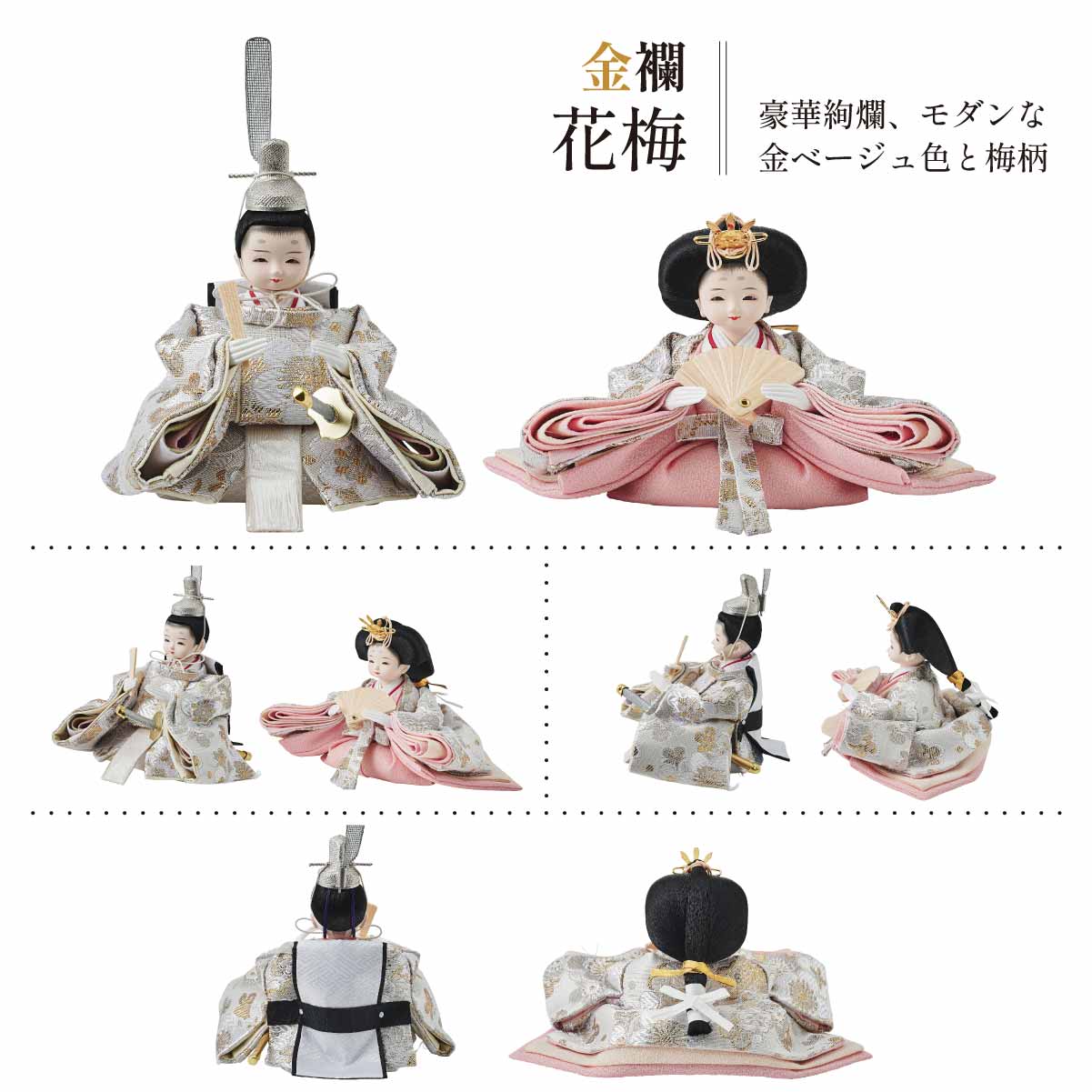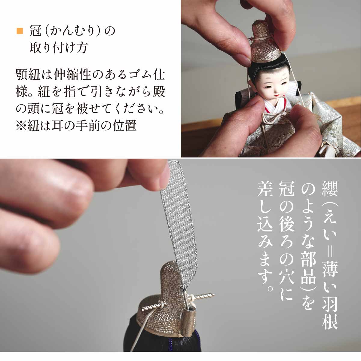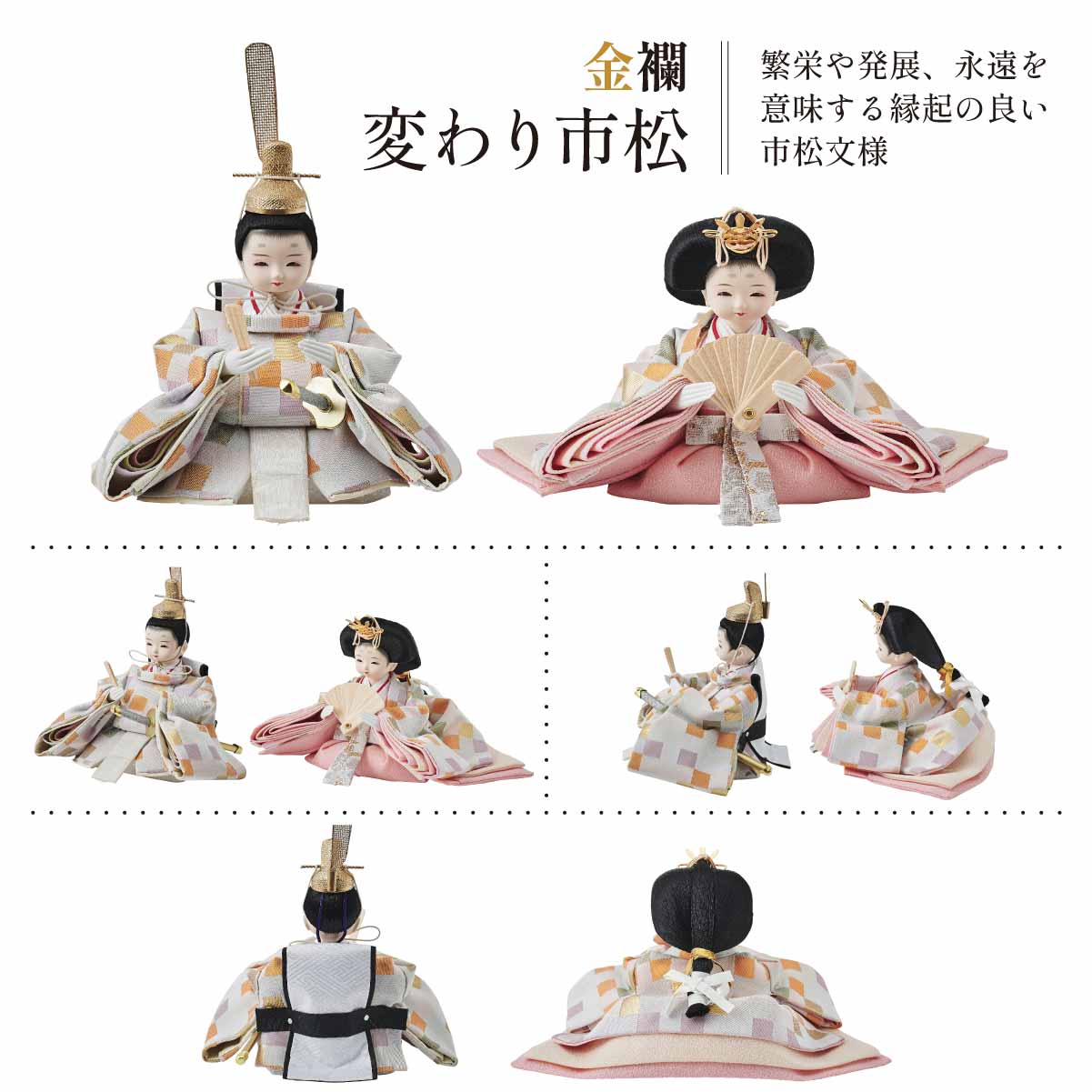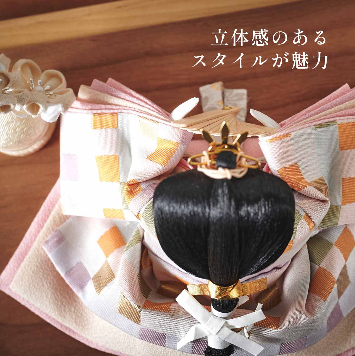 | 材質・素材 | 頭(お顔):石膏・胡粉・手描き面相 胴体:藁胴 衣装:金襴(ポリエステル) 花飾り:綿・ちりめん(レーヨン)・アクリル・プラスチック 衝立付き台座:バーチ無垢集成材・アルドボスオイル(クリア)仕上げ 背面板:ブラックチェリー突板・ラッカー仕上げ |