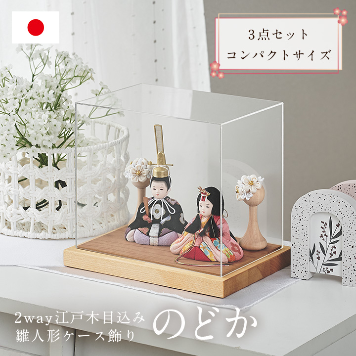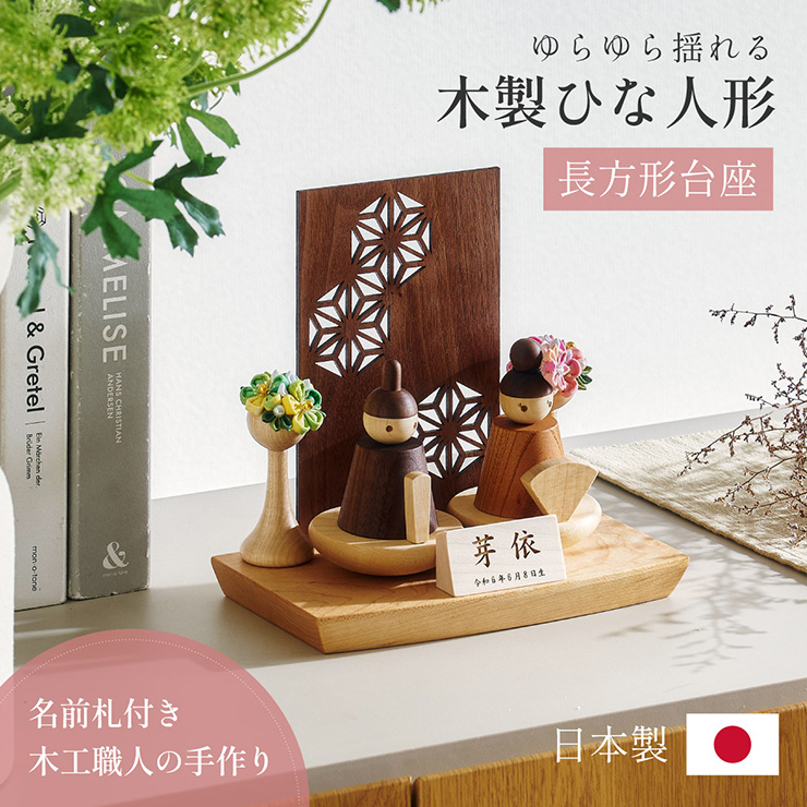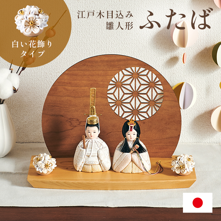 | 材質・素材 | 頭(お顔):石膏・胡粉・手描き面相 胴体:藁胴 衣装:金襴(ポリエステル) 花飾り:綿・ちりめん(レーヨン)・アクリル・プラスチック 衝立付き台座:バーチ無垢集成材・アルドボスオイル(クリア)仕上げ 背面板:ブラックチェリー突板・ラッカー仕上げ |