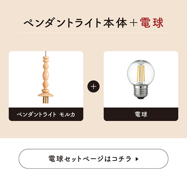 | LED電球専用 ペンダントライト Molka(モルカ) 毎日の時間をやさしく照らす、木の灯り 素材の表情を活かした、趣のあるアンティークなペンダントライト。 灯りをつけるたびに、ほっとする。日々のくらしにあたたかさをくれる、唯一無二の存在感です。 ■無垢材のぬくもちが映える 天然木で削りだされた形状でナチュラルインテリアにぴったり。木の質感がそのまま感じられるので、優しい印象になります。 ■コードの長さを調節可能 コード長さを自由に調節できるから、天井の高さに合わせてベストな配置が可能 ■LED電球で省エネ LED電球専用ライトだから、あかるさを確保しながら電気代も抑えられます。 ■クラシカルx北欧風デザイン ゴールドのソケットと天然木の組み合わせが、レトロさと北欧っぽさを両立。シンプルながら存在感があり、空間のおしゃれなアクセントに。 ■電球 ・口金:E26 ・定格消費電力:13W以下(※明るさ60W相当以下) ・定格電圧:100V ・この器具はLED電球専用です。 ・白熱電球や蛍光灯電球は使用できません。 ・電球は付属しておりません。 ・電球をご購入される前に、必ずロ金・ワット数のご確認をお願いいたします。 ・調光調色機能付き電球やリモコン付き電球などは対応可能です。 ■引掛けシーリング 一般的なご家庭に設置されている、下記のいずれかのシーリングがあれば、特別な工具や工事なしで簡単に取り付けが可能です。 ・角型引掛けシーリング ・丸型引掛けシーリング ・丸型フル引掛けシーリング ・フル引掛けシーリング ・引掛け埋込ローゼット ※シーリングが設置されていない場合は、別途電気工事が必要になります。 ※種類によっては、シーリングカバー内に完全に収まらない場合があります。ご了承ください。 ■取り付け場所 次のような天井には取り付けないでください。 ・突出部のある天井 ・たわみやすい天井、補強のない薄い天井(ベニヤ板、石膏ボードなど) ・傾斜した天井 ・凸凹のある天井 ※指定以外の場所に取り付けると、火災・落下などの原因になります。 調光機能がついた壁スイッチには取り付けできません。 ※火災の原因になるため、一般のスイッチに交換する取り付けないでください。 ■ダクトレールでもご使用可能〇 ダクトレールとダクトレール専用の変換プラグは別途ご用意ください。 ※電球は付属しておりません。 ※電気用品安全法(PSE法)および日本の安全規格に適合した製品です。 ※本製品は天然木を使用しているため、木目や色味には個体差があり、また、木材の性質上、幹の節目などにより小さな黒い点や筋が見られる場合がございます。これらは天然素材ならではの風合いであり、品質には問題ございません。世界に一つだけの、天然木が持つ個性としてお楽しみいただければ幸いです。 | |