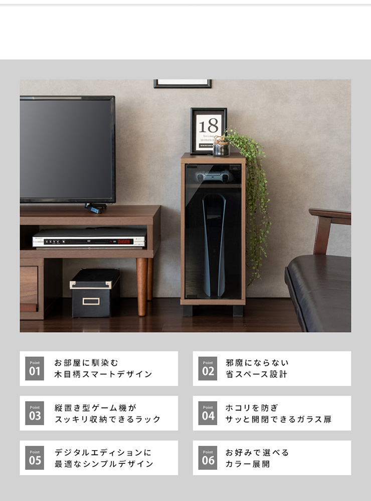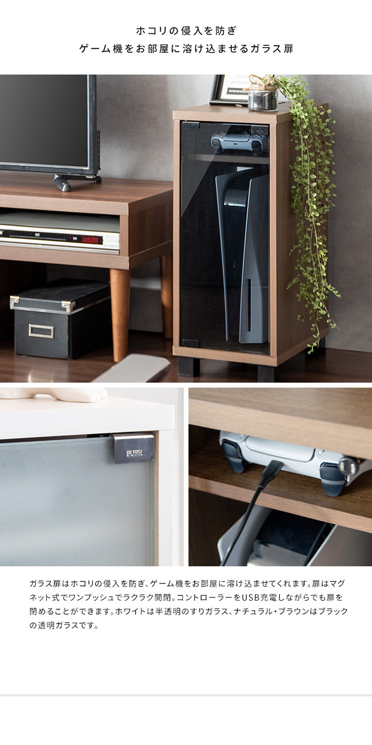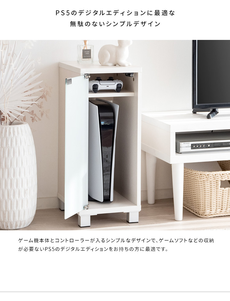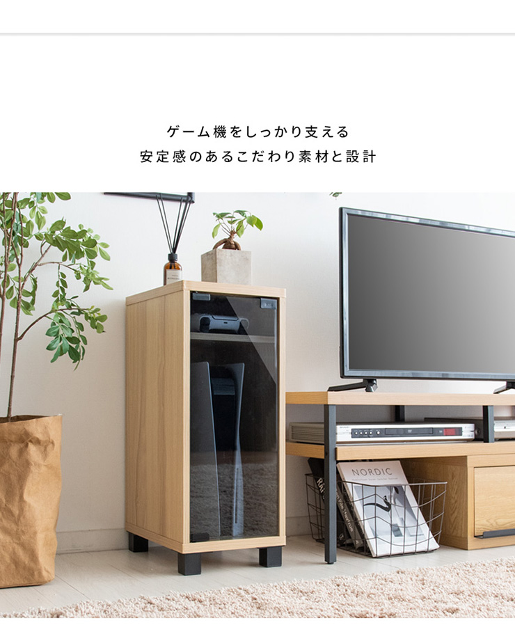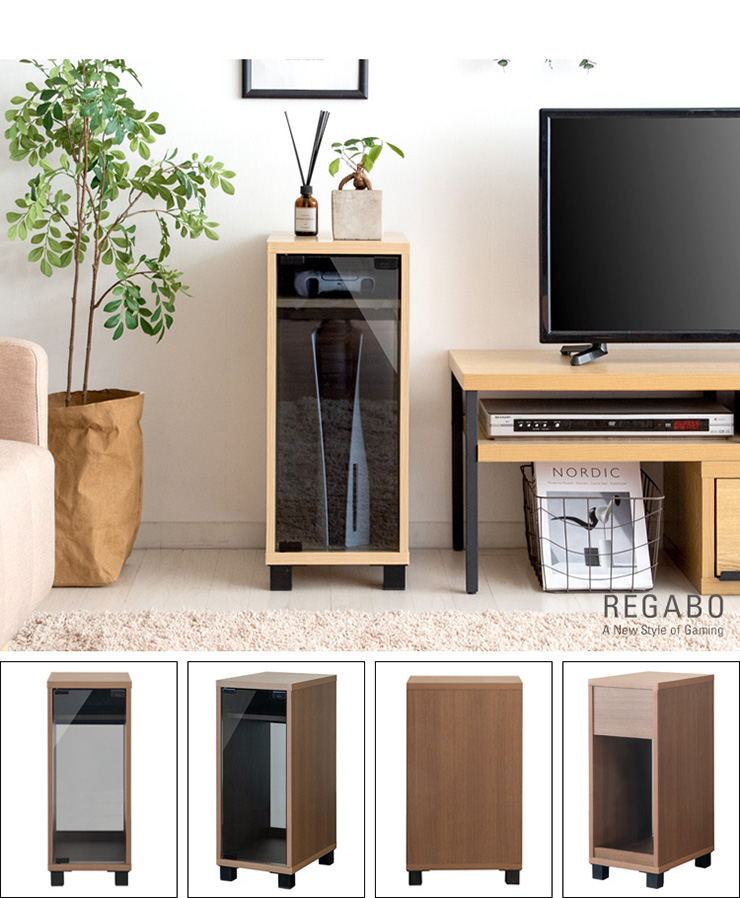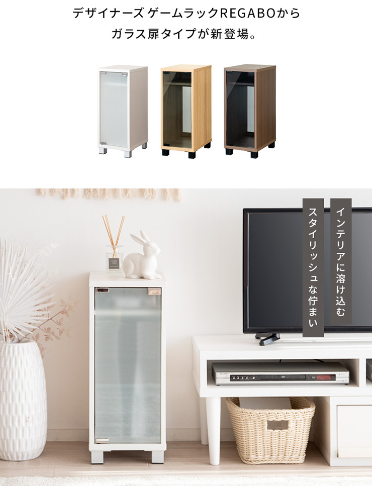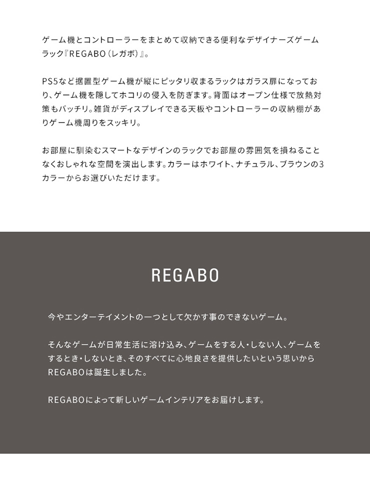 | デザイナーズゲームラック REGABO(レガボ) ゲーム機やコントローラー、ゲームソフトをまとめて収納できる便利なデザイナーズゲームラック『REGABO(レガボ)』。 PS5など据置型ゲーム機が縦にピッタリ収まるラックはガラス扉になっており、ゲーム機を隠してホコリの侵入を防ぎます。 背面はオープン仕様で放熱対策もバッチリ。雑貨がディスプレイできる天板やコントローラーの収納棚、ゲームソフトが最大20枚収納できる引き出し付きでゲーム機周りをスッキリ。 お部屋に馴染むスマートなデザインのラックでお部屋の雰囲気を損ねることなくおしゃれな空間を演出します。 ■お部屋になじむスマートデザイン インテリアから浮きがちなゲーム機やコントローラーをまとめて収納して統一感のあるお部屋に魅せてくれる木製ゲーム機ラック。 ゲーム機上の空いた空間を有効活用できます。 ■リビングやデスク周りで邪魔にならない省スペースサイズ テレビ台横や空いたすき間に置けて邪魔にならない省スペースサイズ。一人暮らしのお部屋やワンルームでも設置できます。 ■PS5とコントローラーがまとめて収納できる縦型ラック PS5がスタンドごと収まるサイズのラックです。 上部にはコントローラーが二台置ける収納棚付き。背面オープン仕様でコード配線や放熱対策もバッチリ。落下防止のストッパーがあり安心です。 ■ホコリの侵入を防ぎゲーム機をお部屋に溶け込ませるガラス扉 ガラス扉はホコリの侵入を防ぎ、ゲーム機をお部屋に溶け込ませてくれます。扉はマグネット式でワンプッシュでらくらく開閉。 コントローラーをUSB充電しながらでも扉を閉める事ができます。ホワイトは半透明のすりガラス、ナチュラル・ブラウンはブラックの透明ガラスです。 ■PS5のデジタルエディションに最適な無駄のないシンプルデザイン ゲーム機本体とコントローラーが入るシンプルなデザインで、ゲームソフトなどの収納が必要ないPS5のデジタルエディションをお持ちの方に最適です。 ■お気に入りの雑貨や、ディフューザーが飾れる天板 リビングやデスク周りでお気に入りの雑貨やディフューザー、写真立てなどを飾ればお部屋を華やかに演出できます。NintendoSwitchも置けます。 ■安定感のあるこだわり素材と設計 ・安定感のある脚付きデザインでゲーム機をしっかり支えます。 ・木板は傷に強い合成樹脂貼りの素材でゲーム機を安心して置けます。 ※こちらの商品はお客様組み立てとなります。組み立て時間:約20分 ※この製品は株式会社ソニー及び任天堂株式会社のライセンス商品ではありません。 ※PS5は株式会社ソニー・インタラクティブエンタティンメントの商標、SwitchはNintendoSwitchは任天堂の商標です。 ※本製品は収納ラックのみです。ゲーム本体やコントローラーなどは含まれておりません。 ※若干の個体差によって、表記サイズと完成形のサイズに多少の誤差が生じる場合がございます。 | |