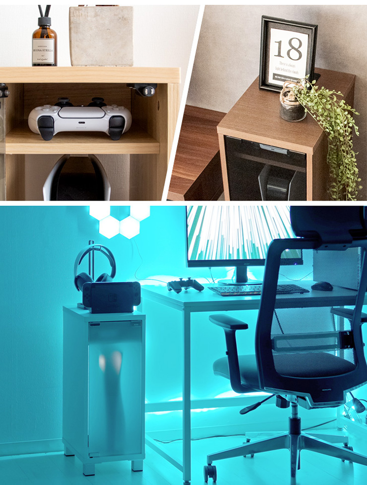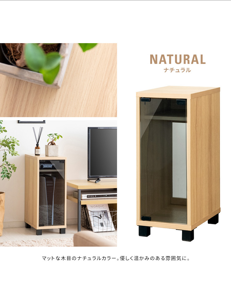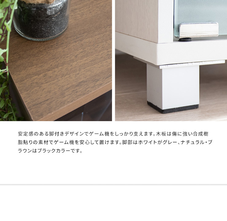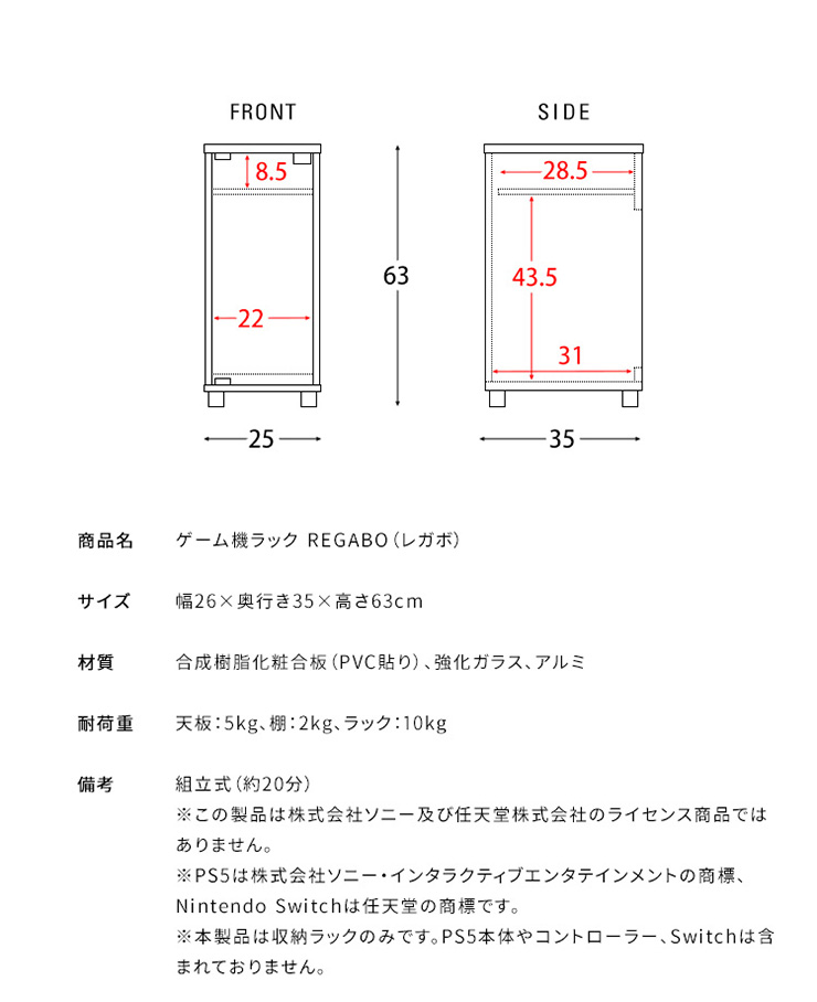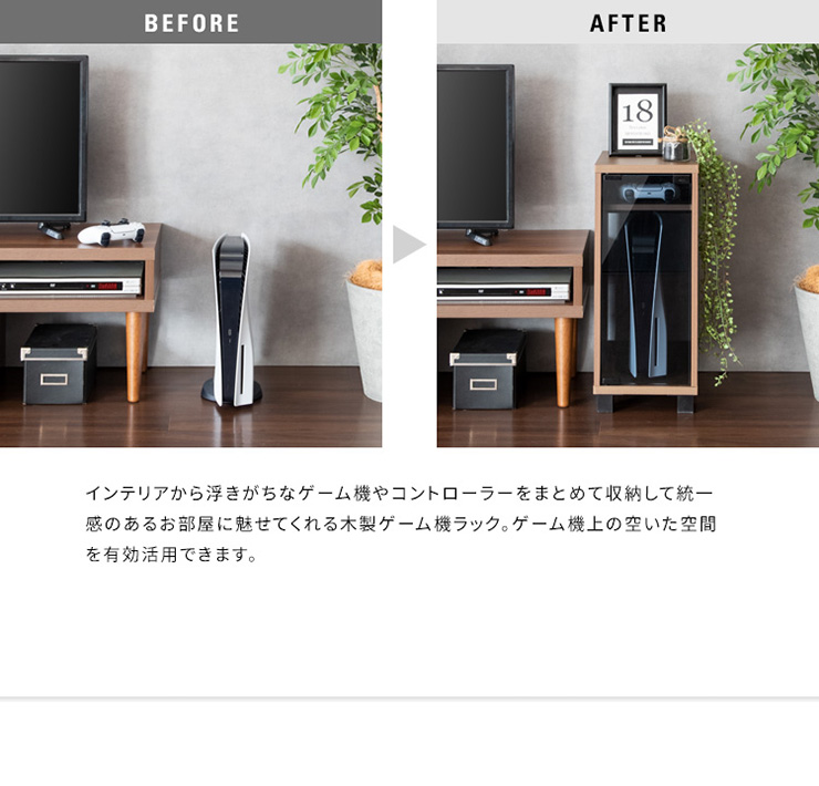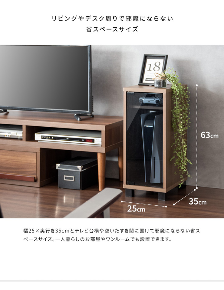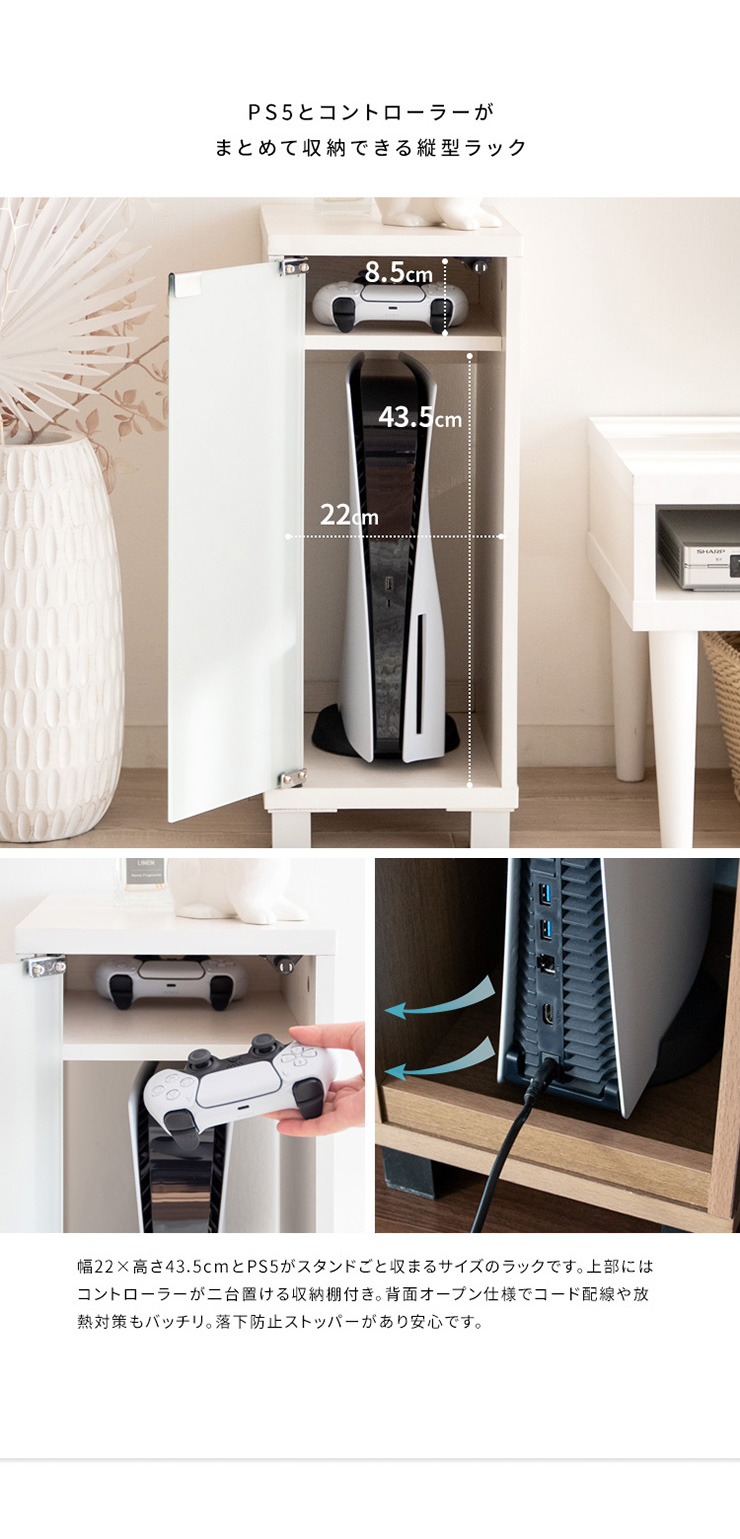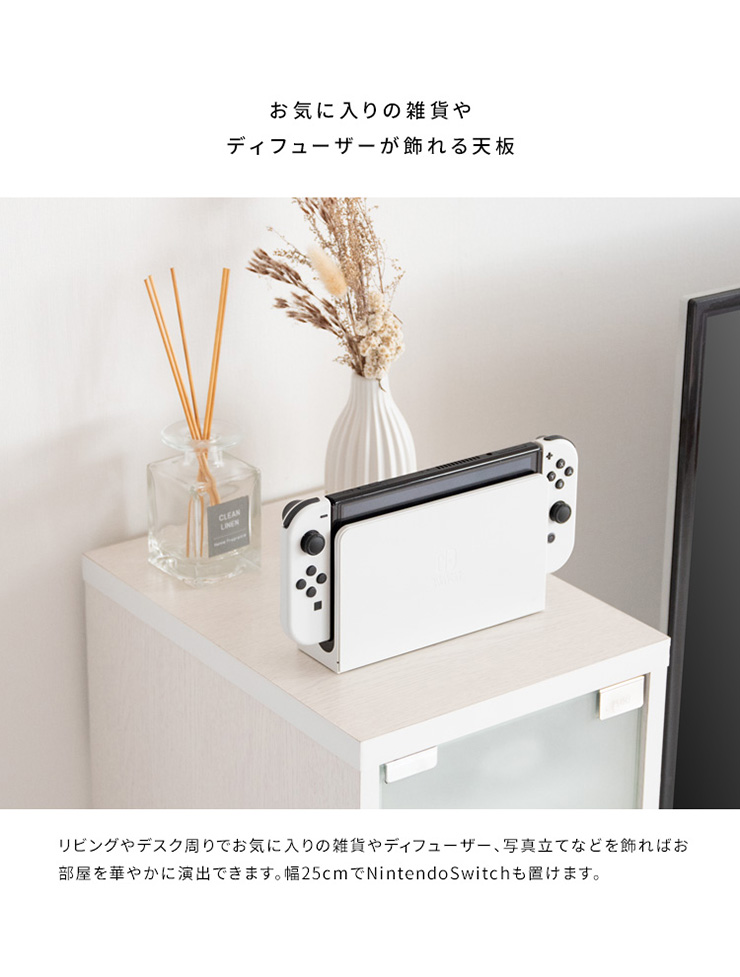 | デザイナーズゲームラック REGABO(レガボ) ゲーム機やコントローラー、ゲームソフトをまとめて収納できる便利なデザイナーズゲームラック『REGABO(レガボ)』。 PS5など据置型ゲーム機が縦にピッタリ収まるラックはガラス扉になっており、ゲーム機を隠してホコリの侵入を防ぎます。 背面はオープン仕様で放熱対策もバッチリ。雑貨がディスプレイできる天板やコントローラーの収納棚、ゲームソフトが最大20枚収納できる引き出し付きでゲーム機周りをスッキリ。 お部屋に馴染むスマートなデザインのラックでお部屋の雰囲気を損ねることなくおしゃれな空間を演出します。 ■お部屋になじむスマートデザイン インテリアから浮きがちなゲーム機やコントローラーをまとめて収納して統一感のあるお部屋に魅せてくれる木製ゲーム機ラック。 ゲーム機上の空いた空間を有効活用できます。 ■リビングやデスク周りで邪魔にならない省スペースサイズ テレビ台横や空いたすき間に置けて邪魔にならない省スペースサイズ。一人暮らしのお部屋やワンルームでも設置できます。 ■PS5とコントローラーがまとめて収納できる縦型ラック PS5がスタンドごと収まるサイズのラックです。 上部にはコントローラーが二台置ける収納棚付き。背面オープン仕様でコード配線や放熱対策もバッチリ。落下防止のストッパーがあり安心です。 ■ホコリの侵入を防ぎゲーム機をお部屋に溶け込ませるガラス扉 ガラス扉はホコリの侵入を防ぎ、ゲーム機をお部屋に溶け込ませてくれます。扉はマグネット式でワンプッシュでらくらく開閉。 コントローラーをUSB充電しながらでも扉を閉める事ができます。ホワイトは半透明のすりガラス、ナチュラル・ブラウンはブラックの透明ガラスです。 ■PS5のデジタルエディションに最適な無駄のないシンプルデザイン ゲーム機本体とコントローラーが入るシンプルなデザインで、ゲームソフトなどの収納が必要ないPS5のデジタルエディションをお持ちの方に最適です。 ■お気に入りの雑貨や、ディフューザーが飾れる天板 リビングやデスク周りでお気に入りの雑貨やディフューザー、写真立てなどを飾ればお部屋を華やかに演出できます。NintendoSwitchも置けます。 ■安定感のあるこだわり素材と設計 ・安定感のある脚付きデザインでゲーム機をしっかり支えます。 ・木板は傷に強い合成樹脂貼りの素材でゲーム機を安心して置けます。 ※こちらの商品はお客様組み立てとなります。組み立て時間:約20分 ※この製品は株式会社ソニー及び任天堂株式会社のライセンス商品ではありません。 ※PS5は株式会社ソニー・インタラクティブエンタティンメントの商標、SwitchはNintendoSwitchは任天堂の商標です。 ※本製品は収納ラックのみです。ゲーム本体やコントローラーなどは含まれておりません。 ※若干の個体差によって、表記サイズと完成形のサイズに多少の誤差が生じる場合がございます。 | |