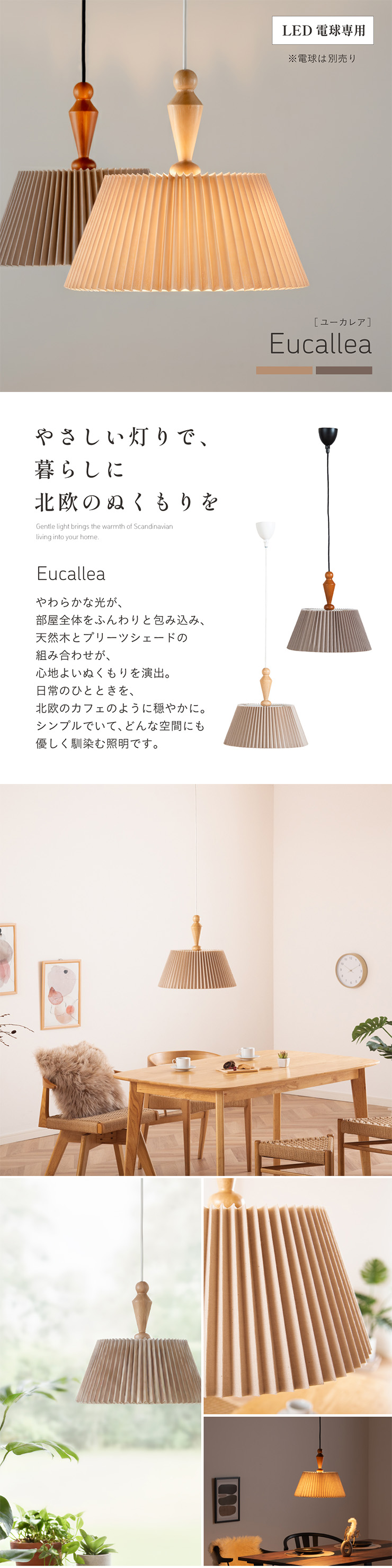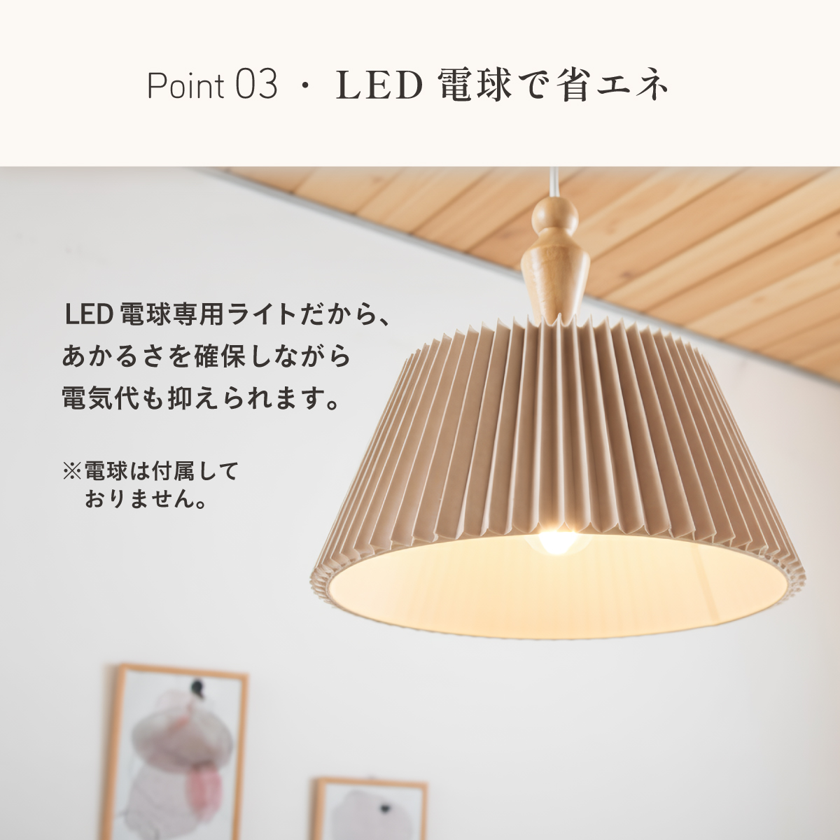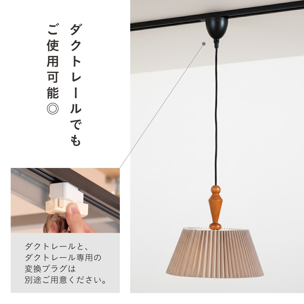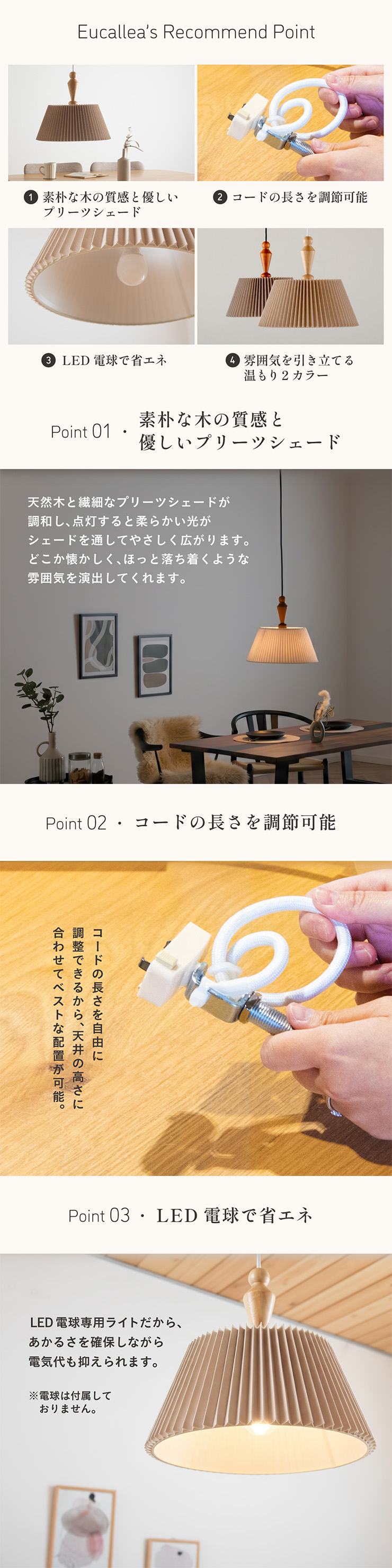 | LED電球専用 ペンダントライト Eucallea(ユーカレア) やさしい灯りで、暮らしに北欧のぬくもりを やわらかな光が、部屋全体をふんわりと包み込み、天然木とプリーツシェードの組み合わせが、心地よいぬくもりを演出。 日常のひとときを、北欧のカフェのように穏やかに。シンプルでいて、どんな空間にも優しく馴染む照明です。 ■素朴な木の質感と優しいプリーツシェード 天然木と些細なプリーツシェードが調和し、点灯すると柔らかい光がシェードを通してやさしく広がります。 どこか懐かしく、ほっと落ち着くような雰囲気を演出してくれます。 ■コードの長さを調節可能 コード長さを自由に調節できるから、天井の高さに合わせてベストな配置が可能 ■LED電球で省エネ LED電球専用ライトだから、あかるさを確保しながら電気代も抑えられます。 ■電球 ・口金:E26 ・定格消費電力:13W以下(※明るさ60W相当以下) ・定格電圧:100V ・この器具はLED電球専用です。 ・白熱電球や蛍光灯電球は使用できません。 ・電球は付属しておりません。 ・電球をご購入される前に、必ずロ金・ワット数のご確認をお願いいたします。 ・調光調色機能付き電球やリモコン付き電球などは対応可能です。 ■引掛けシーリング 一般的なご家庭に設置されている、下記のいずれかのシーリングがあれば、特別な工具や工事なしで簡単に取り付けが可能です。 ・角型引掛けシーリング ・丸型引掛けシーリング ・丸型フル引掛けシーリング ・フル引掛けシーリング ・引掛け埋込ローゼット ※シーリングが設置されていない場合は、別途電気工事が必要になります。 ※種類によっては、シーリングカバー内に完全に収まらない場合があります。ご了承ください。 ■取り付け場所 次のような天井には取り付けないでください。 ・突出部のある天井 ・たわみやすい天井、補強のない薄い天井(ベニヤ板、石膏ボードなど) ・傾斜した天井 ・凸凹のある天井 ※指定以外の場所に取り付けると、火災・落下などの原因になります。 調光機能がついた壁スイッチには取り付けできません。 ※火災の原因になるため、一般のスイッチに交換する取り付けないでください。 ■ダクトレールでもご使用可能〇 ダクトレールとダクトレール専用の変換プラグは別途ご用意ください。 ※電球は付属しておりません。 ※電気用品安全法(PSE法)および日本の安全規格に適合した製品です。 ※本商品のシェードは、風合いを活かしたファブリック(布)を使用しています。繊維の小さな節や色ムラ、わずかな点のような斑点が見られる場合があります。生産工程上の個体差となりますので、不良ではございません。素材本来の質感を生かしたデザインとしてお楽しみください。 | |
