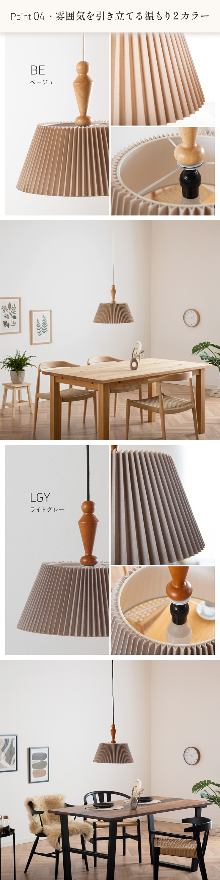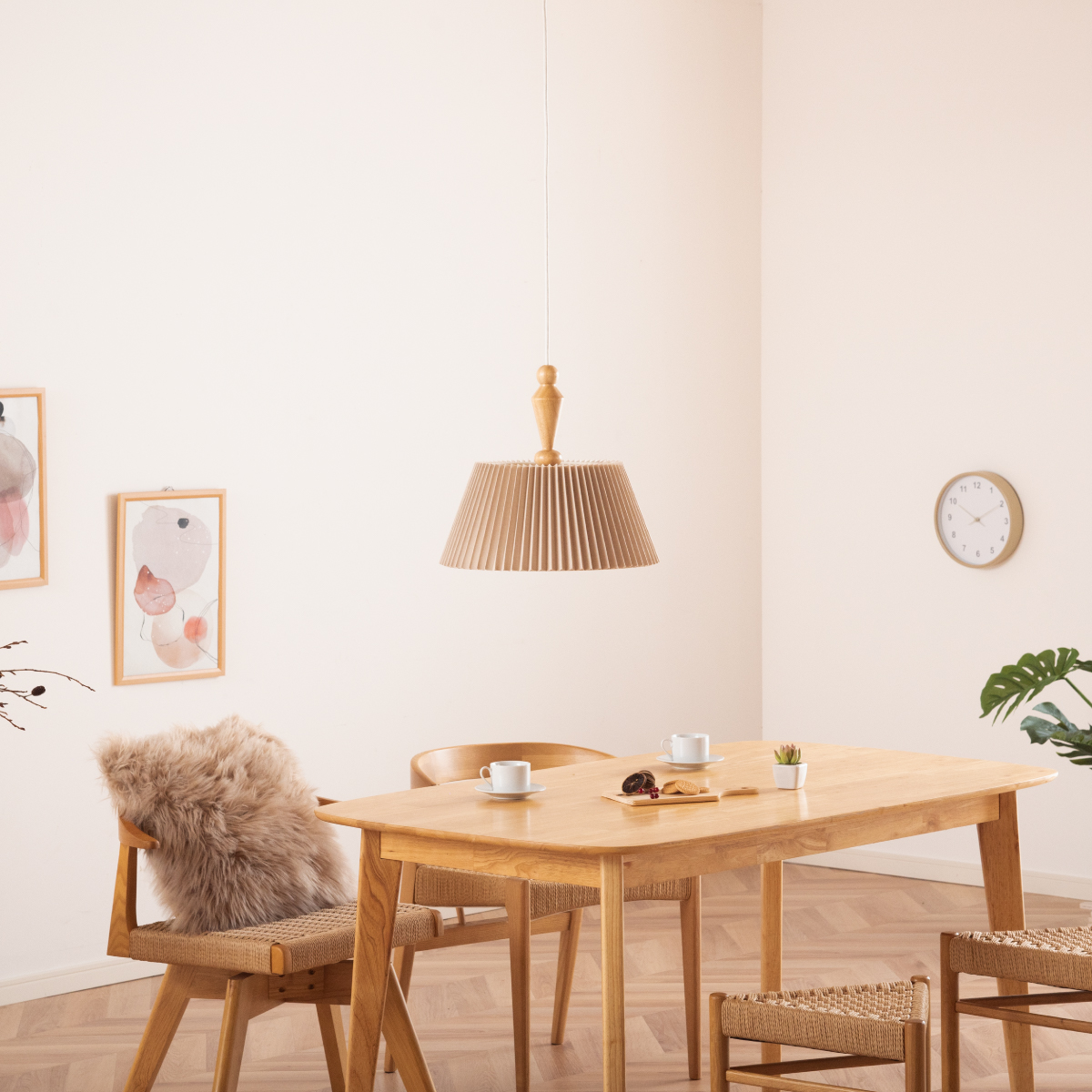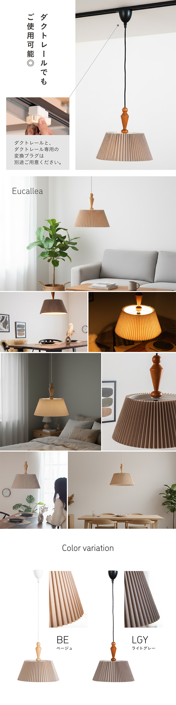 | LED電球専用 ペンダントライト Eucallea(ユーカレア) やさしい灯りで、暮らしに北欧のぬくもりを やわらかな光が、部屋全体をふんわりと包み込み、天然木とプリーツシェードの組み合わせが、心地よいぬくもりを演出。 日常のひとときを、北欧のカフェのように穏やかに。シンプルでいて、どんな空間にも優しく馴染む照明です。 ■素朴な木の質感と優しいプリーツシェード 天然木と些細なプリーツシェードが調和し、点灯すると柔らかい光がシェードを通してやさしく広がります。 どこか懐かしく、ほっと落ち着くような雰囲気を演出してくれます。 ■コードの長さを調節可能 コード長さを自由に調節できるから、天井の高さに合わせてベストな配置が可能 ■LED電球で省エネ LED電球専用ライトだから、あかるさを確保しながら電気代も抑えられます。 ■電球 ・口金:E26 ・定格消費電力:13W以下(※明るさ60W相当以下) ・定格電圧:100V ・この器具はLED電球専用です。 ・白熱電球や蛍光灯電球は使用できません。 ・電球は付属しておりません。 ・電球をご購入される前に、必ずロ金・ワット数のご確認をお願いいたします。 ・調光調色機能付き電球やリモコン付き電球などは対応可能です。 ■引掛けシーリング 一般的なご家庭に設置されている、下記のいずれかのシーリングがあれば、特別な工具や工事なしで簡単に取り付けが可能です。 ・角型引掛けシーリング ・丸型引掛けシーリング ・丸型フル引掛けシーリング ・フル引掛けシーリング ・引掛け埋込ローゼット ※シーリングが設置されていない場合は、別途電気工事が必要になります。 ※種類によっては、シーリングカバー内に完全に収まらない場合があります。ご了承ください。 ■取り付け場所 次のような天井には取り付けないでください。 ・突出部のある天井 ・たわみやすい天井、補強のない薄い天井(ベニヤ板、石膏ボードなど) ・傾斜した天井 ・凸凹のある天井 ※指定以外の場所に取り付けると、火災・落下などの原因になります。 調光機能がついた壁スイッチには取り付けできません。 ※火災の原因になるため、一般のスイッチに交換する取り付けないでください。 ■ダクトレールでもご使用可能〇 ダクトレールとダクトレール専用の変換プラグは別途ご用意ください。 ※電球は付属しておりません。 ※電気用品安全法(PSE法)および日本の安全規格に適合した製品です。 ※本商品のシェードは、風合いを活かしたファブリック(布)を使用しています。繊維の小さな節や色ムラ、わずかな点のような斑点が見られる場合があります。生産工程上の個体差となりますので、不良ではございません。素材本来の質感を生かしたデザインとしてお楽しみください。 | |
