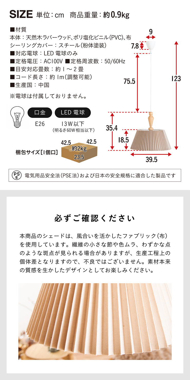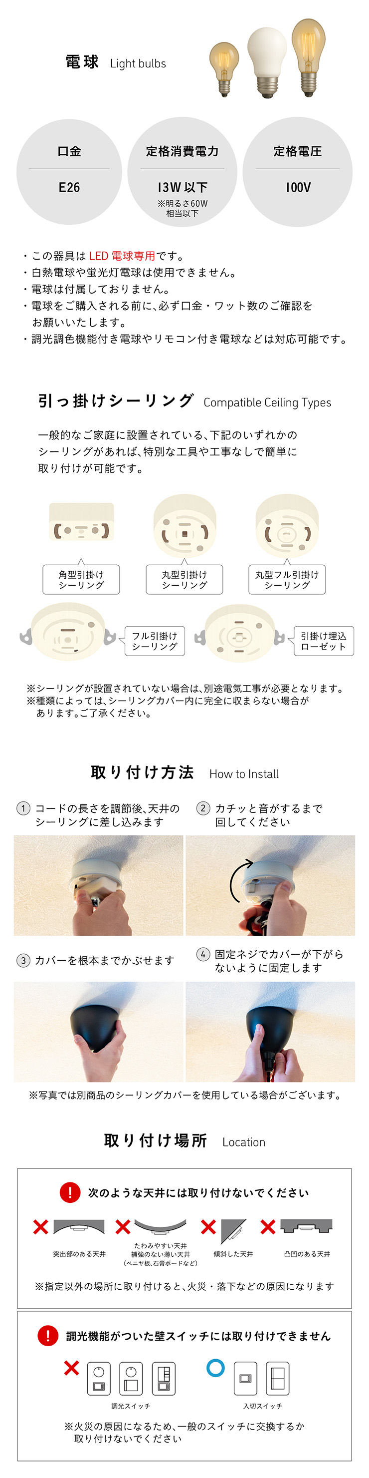 | 材質・素材 | 本体:天然木ラバーウッド・ポリ塩化ビニル(PVC)・布 シーリングカバー:スチール(粉体塗装) 対応電球:LED電球のみ 定格電圧:AC100V 定格周波数:50/60Hz 目安対応畳数:約1~2畳 コードの長さ:約1m(調節可能) |