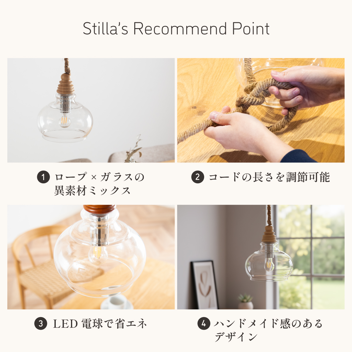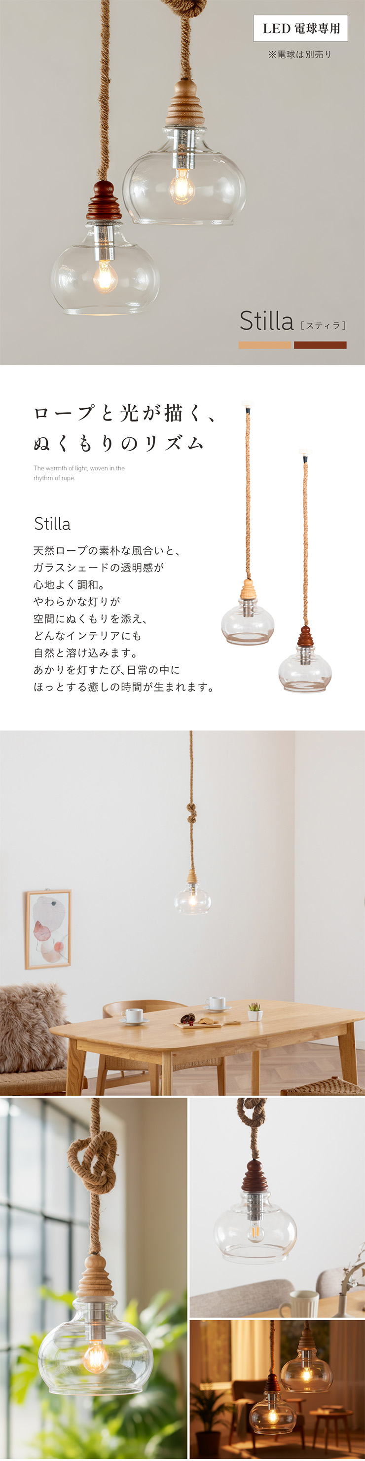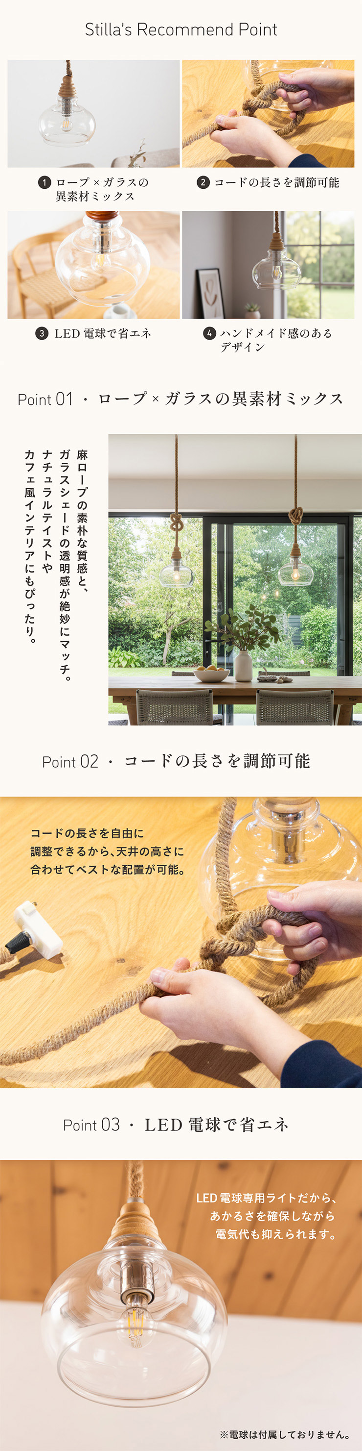 | LED電球専用 ペンダントライト Stilla(スティラ) ロープと光が描く、ぬくもりのリズム 天然ロープの素朴な風合いと、ガラスシェードの透明感が心地よく調和。 やわらかな灯りが空間にぬくもりを添え、どんなインテリアにも自然と溶け込みます。あかりを灯すたび、日常の中にほっとする癒しの時間が生まれます。 ■ロープxガラスの異素材ミックス 麻ロープの素朴な質感と、ガラスシェードの透明感が絶妙にマッチ。 ナチュラルテイストやカフェ風インテリアにもぴったり ■コードの長さを調節可能 コード長さを自由に調節できるから、天井の高さに合わせてベストな配置が可能 ■LED電球で省エネ LED電球専用ライトだから、あかるさを確保しながら電気代も抑えられます。 ■ハンドメイド感のあるデザイン ハンドメイド感のあるロープの結び目が、一点一点違う“味”を出し、空間に個性を与えてくれます。 ■電球 ・口金:E17 ・定格消費電力:8W以下(※明るさ40W相当以下) ・定格電圧:100V ・この器具はLED電球専用です。 ・白熱電球や蛍光灯電球は使用できません。 ・電球は付属しておりません。 ・電球をご購入される前に、必ずロ金・ワット数のご確認をお願いいたします。 ・調光調色機能付き電球やリモコン付き電球などは対応可能です。 ■引掛けシーリング 一般的なご家庭に設置されている、下記のいずれかのシーリングがあれば、特別な工具や工事なしで簡単に取り付けが可能です。 ・角型引掛けシーリング ・丸型引掛けシーリング ・丸型フル引掛けシーリング ・フル引掛けシーリング ・引掛け埋込ローゼット ※シーリングが設置されていない場合は、別途電気工事が必要になります。 ※種類によっては、シーリングカバー内に完全に収まらない場合があります。ご了承ください。 ■取り付け場所 次のような天井には取り付けないでください。 ・突出部のある天井 ・たわみやすい天井、補強のない薄い天井(ベニヤ板、石膏ボードなど) ・傾斜した天井 ・凸凹のある天井 ※指定以外の場所に取り付けると、火災・落下などの原因になります。 調光機能がついた壁スイッチには取り付けできません。 ※火災の原因になるため、一般のスイッチに交換する取り付けないでください。 ■ダクトレールでもご使用可能〇 ダクトレールとダクトレール専用の変換プラグは別途ご用意ください。 ※電球は付属しておりません。 ※電気用品安全法(PSE法)および日本の安全規格に適合した製品です。 ※本製品のガラス部分には、製造工程上、小さな気泡やゆがみが生じる場合がございます。こちらはガラス製品特有の風合いであり、不良品ではございません。一点ずつ異なる表情をお楽しみいただければ幸いです。 | |