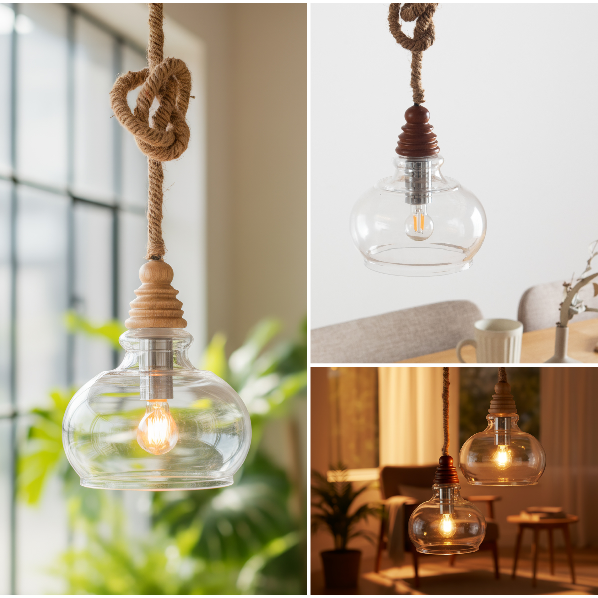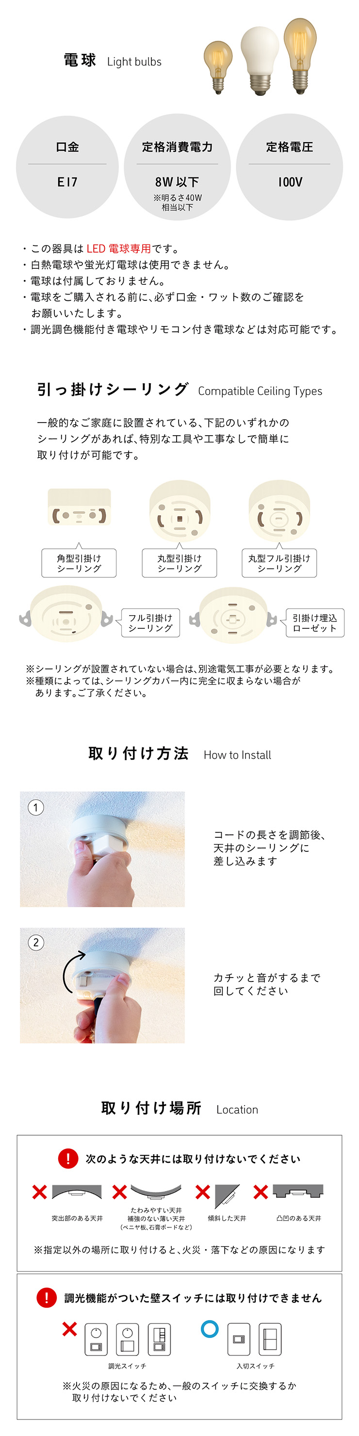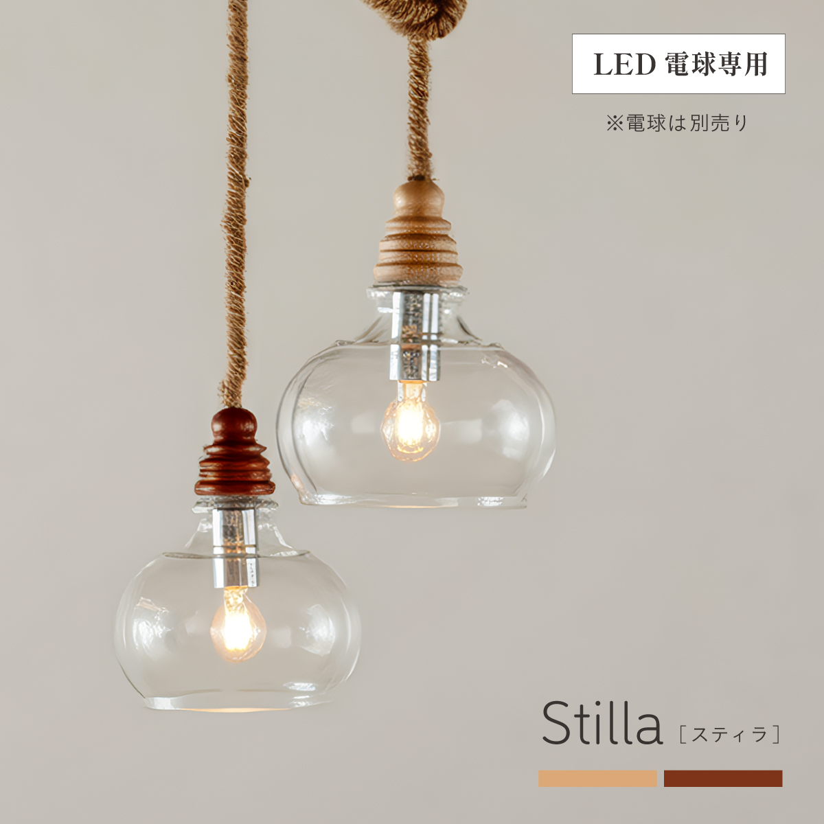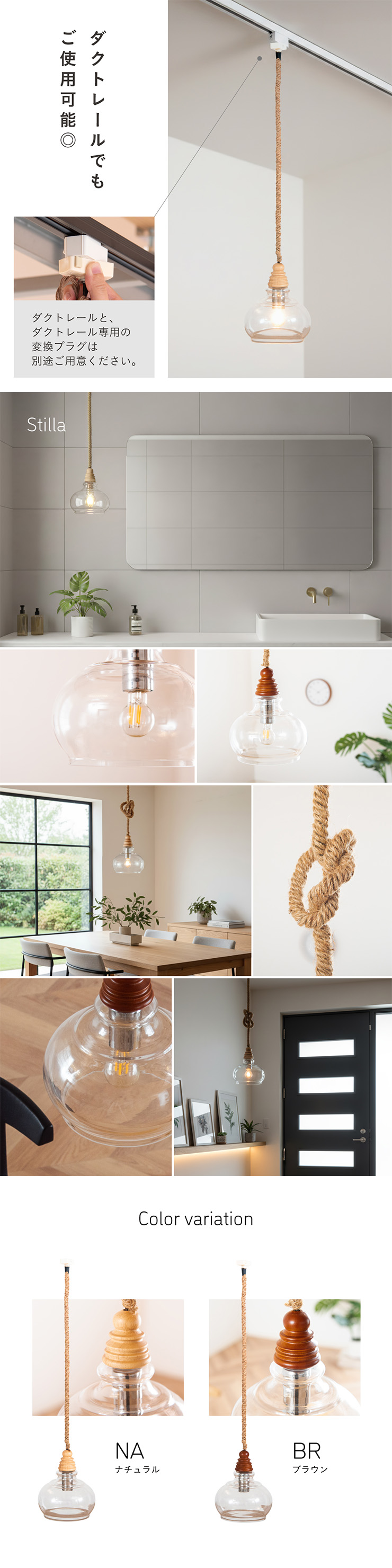 | LED電球専用 ペンダントライト Stilla(スティラ) ロープと光が描く、ぬくもりのリズム 天然ロープの素朴な風合いと、ガラスシェードの透明感が心地よく調和。 やわらかな灯りが空間にぬくもりを添え、どんなインテリアにも自然と溶け込みます。あかりを灯すたび、日常の中にほっとする癒しの時間が生まれます。 ■ロープxガラスの異素材ミックス 麻ロープの素朴な質感と、ガラスシェードの透明感が絶妙にマッチ。 ナチュラルテイストやカフェ風インテリアにもぴったり ■コードの長さを調節可能 コード長さを自由に調節できるから、天井の高さに合わせてベストな配置が可能 ■LED電球で省エネ LED電球専用ライトだから、あかるさを確保しながら電気代も抑えられます。 ■ハンドメイド感のあるデザイン ハンドメイド感のあるロープの結び目が、一点一点違う“味”を出し、空間に個性を与えてくれます。 ■電球 ・口金:E17 ・定格消費電力:8W以下(※明るさ40W相当以下) ・定格電圧:100V ・この器具はLED電球専用です。 ・白熱電球や蛍光灯電球は使用できません。 ・電球は付属しておりません。 ・電球をご購入される前に、必ずロ金・ワット数のご確認をお願いいたします。 ・調光調色機能付き電球やリモコン付き電球などは対応可能です。 ■引掛けシーリング 一般的なご家庭に設置されている、下記のいずれかのシーリングがあれば、特別な工具や工事なしで簡単に取り付けが可能です。 ・角型引掛けシーリング ・丸型引掛けシーリング ・丸型フル引掛けシーリング ・フル引掛けシーリング ・引掛け埋込ローゼット ※シーリングが設置されていない場合は、別途電気工事が必要になります。 ※種類によっては、シーリングカバー内に完全に収まらない場合があります。ご了承ください。 ■取り付け場所 次のような天井には取り付けないでください。 ・突出部のある天井 ・たわみやすい天井、補強のない薄い天井(ベニヤ板、石膏ボードなど) ・傾斜した天井 ・凸凹のある天井 ※指定以外の場所に取り付けると、火災・落下などの原因になります。 調光機能がついた壁スイッチには取り付けできません。 ※火災の原因になるため、一般のスイッチに交換する取り付けないでください。 ■ダクトレールでもご使用可能〇 ダクトレールとダクトレール専用の変換プラグは別途ご用意ください。 ※電球は付属しておりません。 ※電気用品安全法(PSE法)および日本の安全規格に適合した製品です。 ※本製品のガラス部分には、製造工程上、小さな気泡やゆがみが生じる場合がございます。こちらはガラス製品特有の風合いであり、不良品ではございません。一点ずつ異なる表情をお楽しみいただければ幸いです。 | |