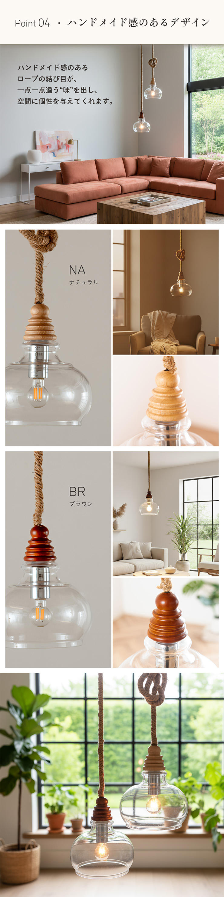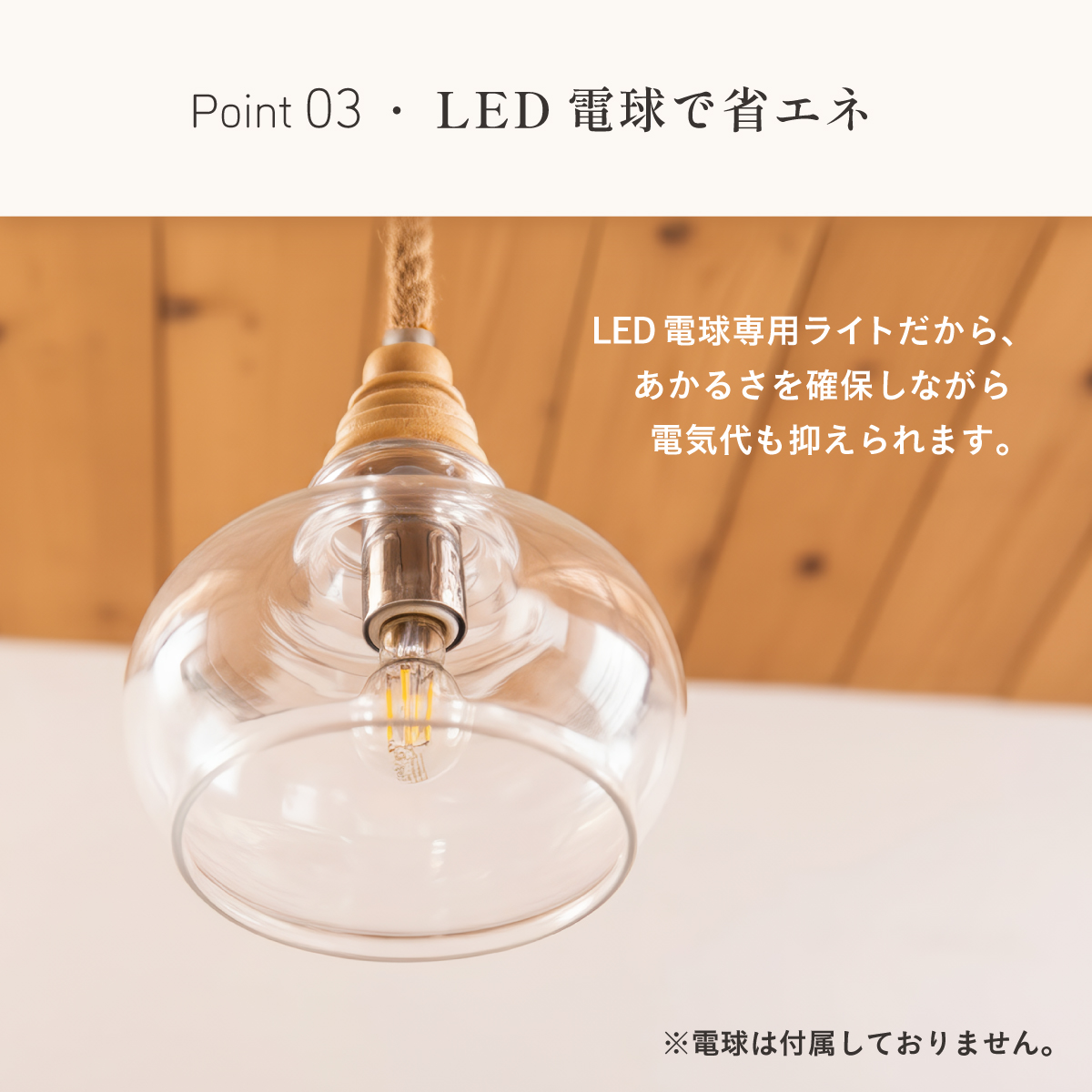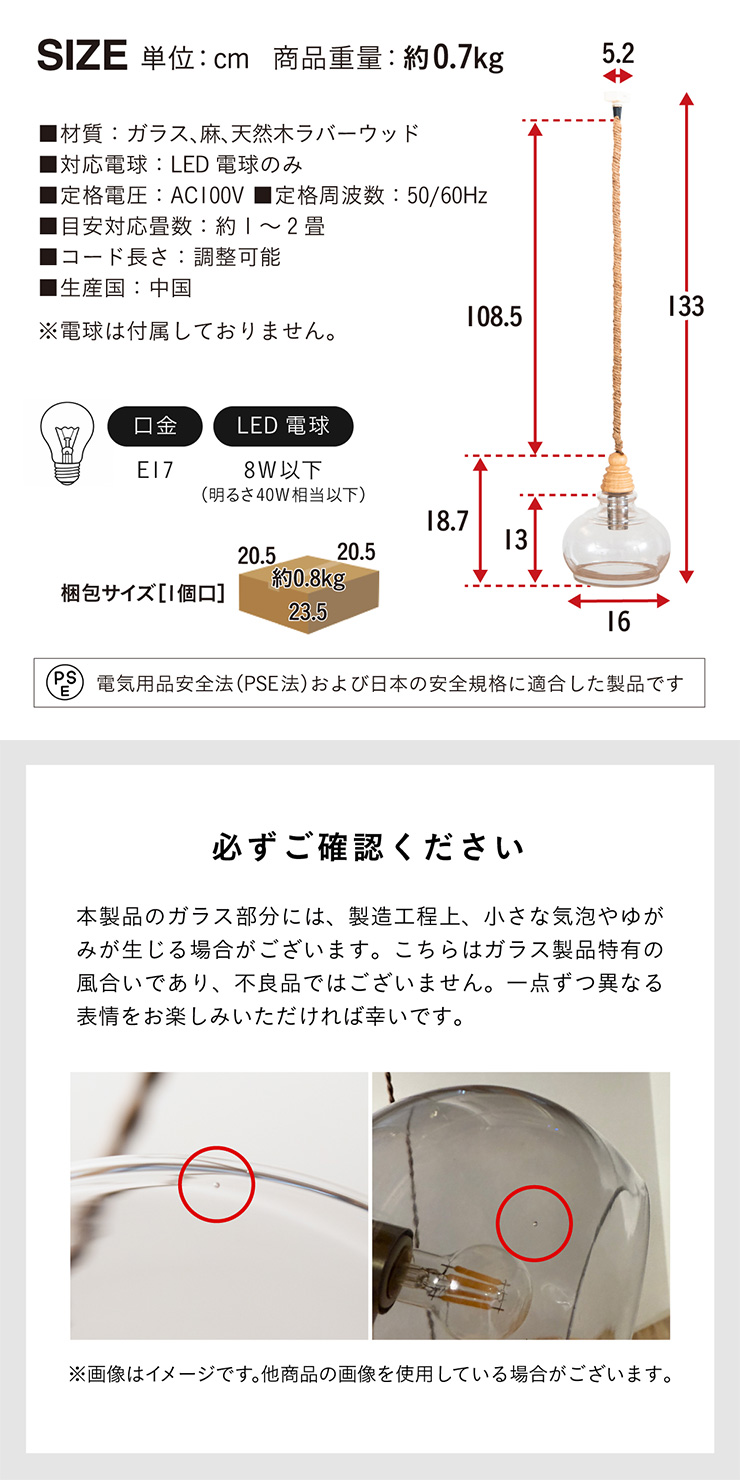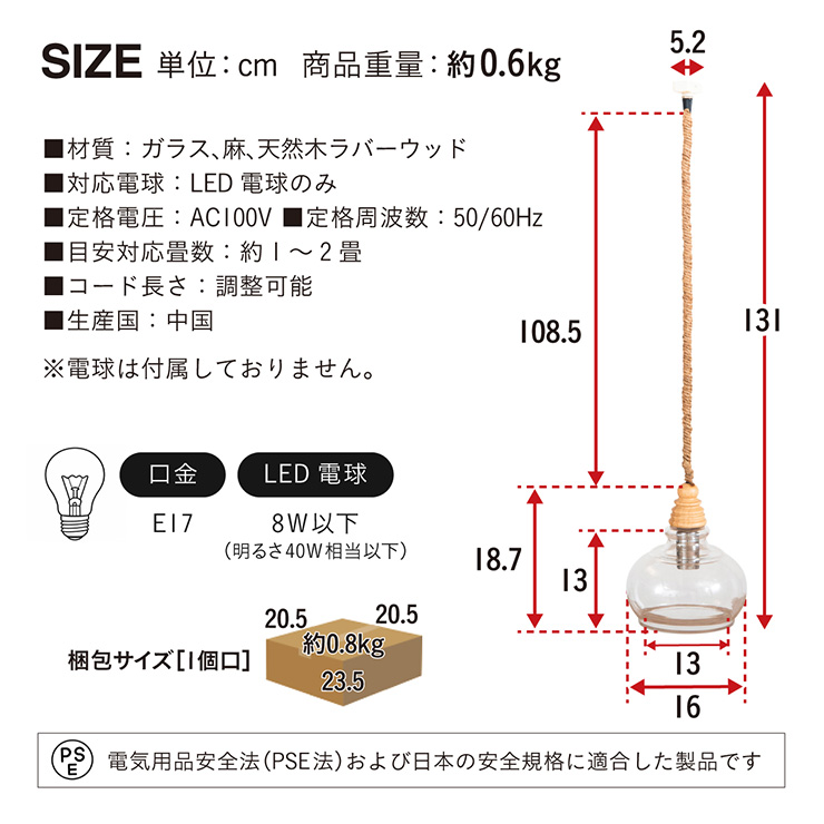 | 材質・素材 | 本体:ガラス・麻・天然木ラバーウッド 対応電球:LED電球のみ 定格電圧:AC100V 定格周波数:50/60Hz 目安対応畳数:約1~2畳 コードの長さ:調節可能 |