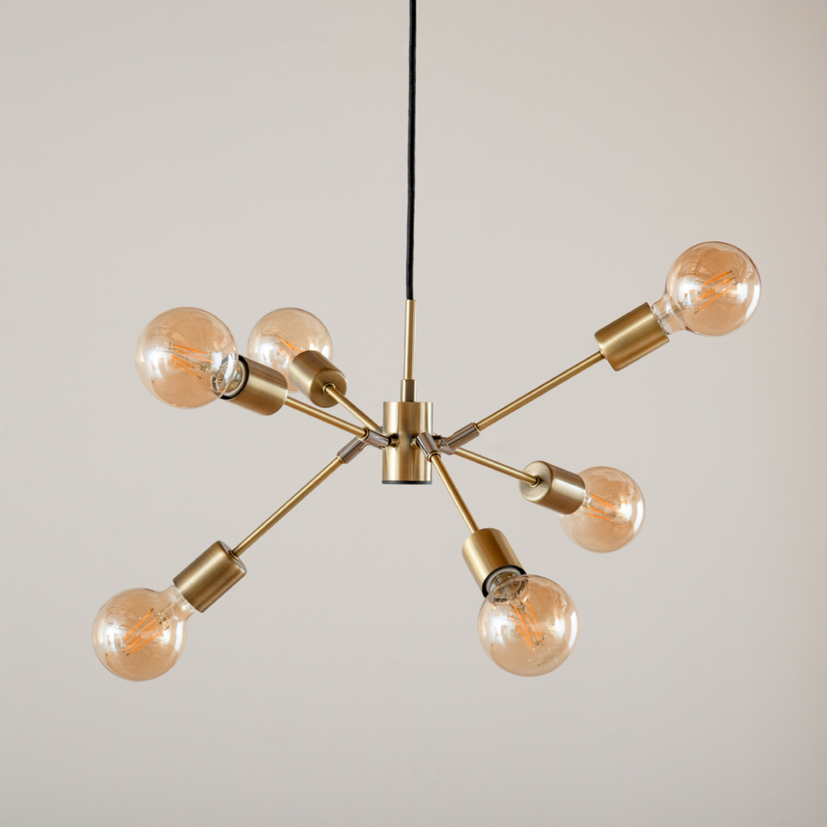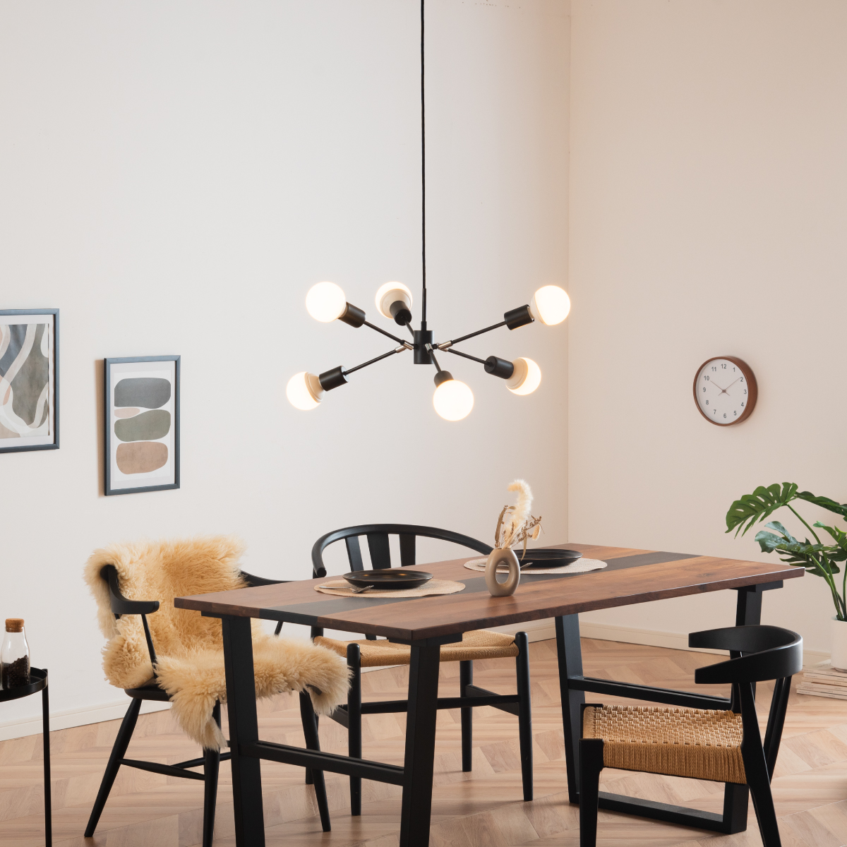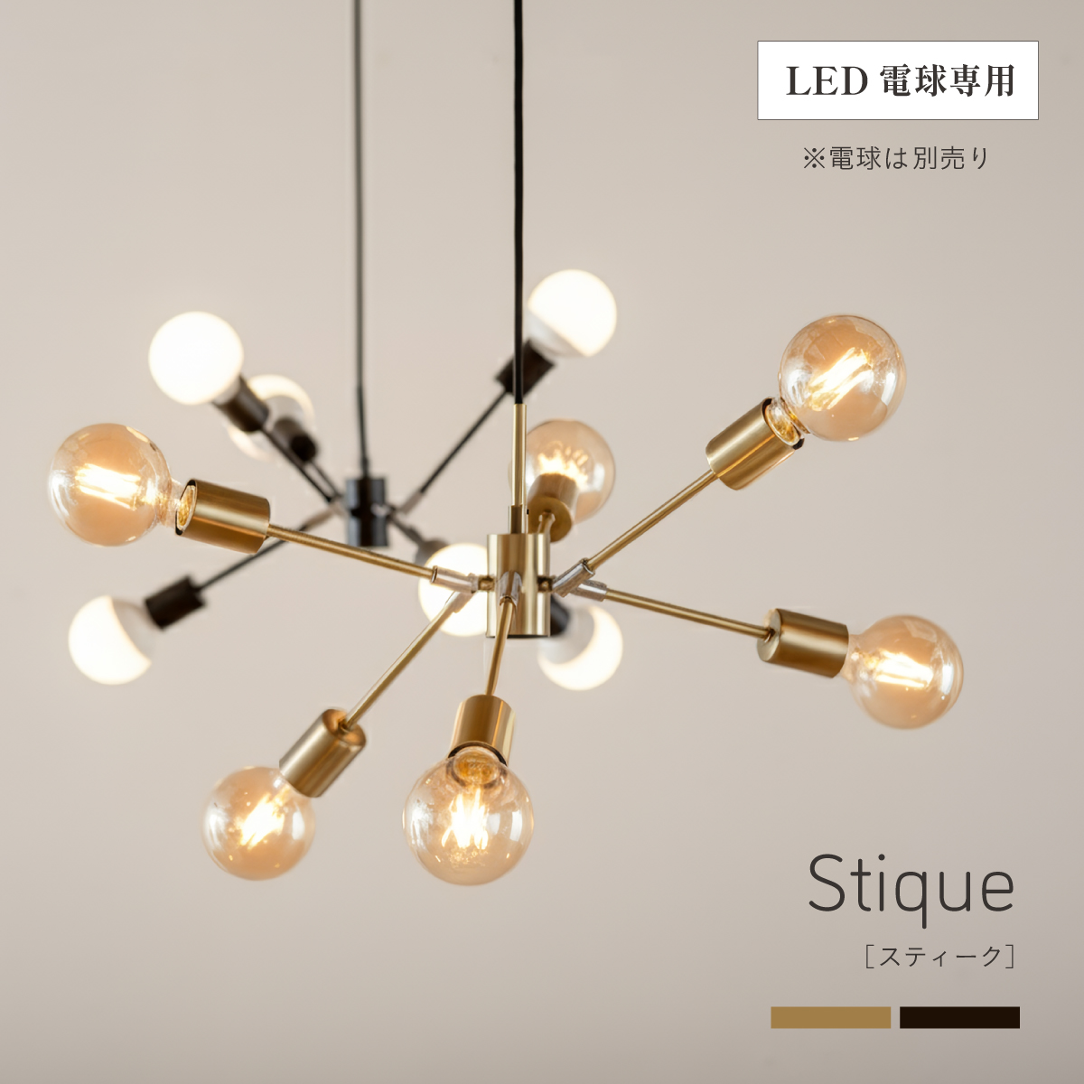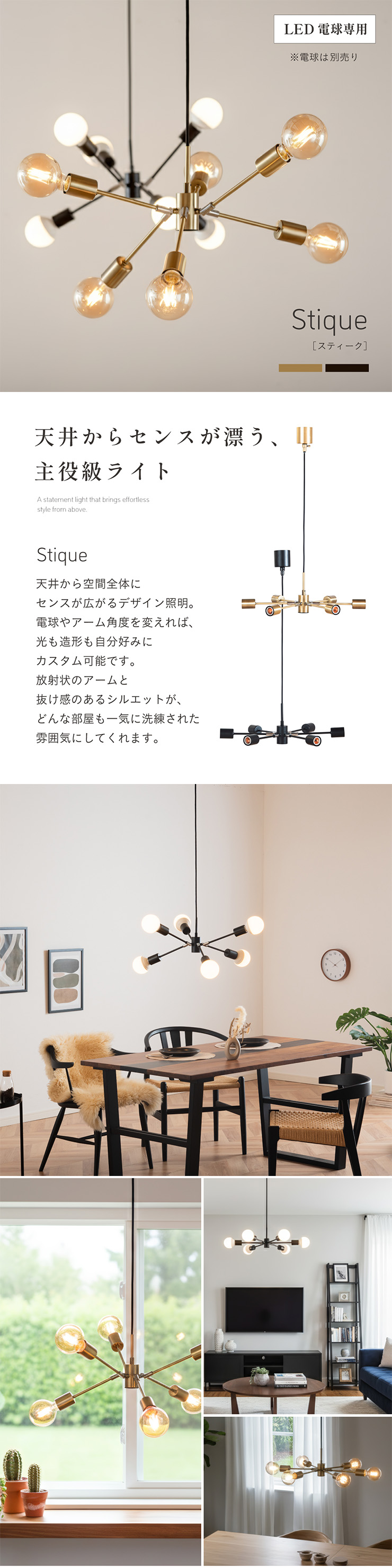 | LED電球専用 ペンダントライト Stique(スティーク) 天井からセンスが漂う、主役級ライト 天井から空間全体にセンスが広がるデザイン照明。電球やアーム角度を変えれば、光も造形も自分好みにカスタム可能です。 放射状のアームと抜け感のあるシルエットが、どんな部屋も一気に洗練された雰囲気にしてくれます。 ■アームの角度を変えて“自分だけのデザイン”に 全部水平にしてミニマルな印象にしたり、互い違いにして立体感を出したり、アームを調整して好きな形にデザインが可能です。 ■コードの長さを調節可能 コード長さを自由に調節できるから、天井の高さに合わせてベストな配置が可能 ■LED電球で省エネ LED電球専用ライトだから、あかるさを確保しながら電気代も抑えられます。 ■飾るだけで海外インテリア風に 洗練されたフォルムと立体的なデザインが、いつもの空間を一瞬でドラマチックに変えてくれます。 ■電球 ・口金:E26 ・定格消費電力:13W以下(※明るさ60W相当以下) ・定格電圧:100V ・この器具はLED電球専用です。 ・白熱電球や蛍光灯電球は使用できません。 ・電球は付属しておりません。 ・電球をご購入される前に、必ずロ金・ワット数のご確認をお願いいたします。 ・調光調色機能付き電球やリモコン付き電球などは対応可能です。 ■引掛けシーリング 一般的なご家庭に設置されている、下記のいずれかのシーリングがあれば、特別な工具や工事なしで簡単に取り付けが可能です。 ・角型引掛けシーリング ・丸型引掛けシーリング ・丸型フル引掛けシーリング ・フル引掛けシーリング ・引掛け埋込ローゼット ※シーリングが設置されていない場合は、別途電気工事が必要になります。 ※種類によっては、シーリングカバー内に完全に収まらない場合があります。ご了承ください。 ■取り付け場所 次のような天井には取り付けないでください。 ・突出部のある天井 ・たわみやすい天井、補強のない薄い天井(ベニヤ板、石膏ボードなど) ・傾斜した天井 ・凸凹のある天井 ※指定以外の場所に取り付けると、火災・落下などの原因になります。 調光機能がついた壁スイッチには取り付けできません。 ※火災の原因になるため、一般のスイッチに交換する取り付けないでください。 ■ダクトレールでもご使用可能〇 ダクトレールとダクトレール専用の変換プラグは別途ご用意ください。 ※電球は付属しておりません。 ※電気用品安全法(PSE法)および日本の安全規格に適合した製品です。 | |