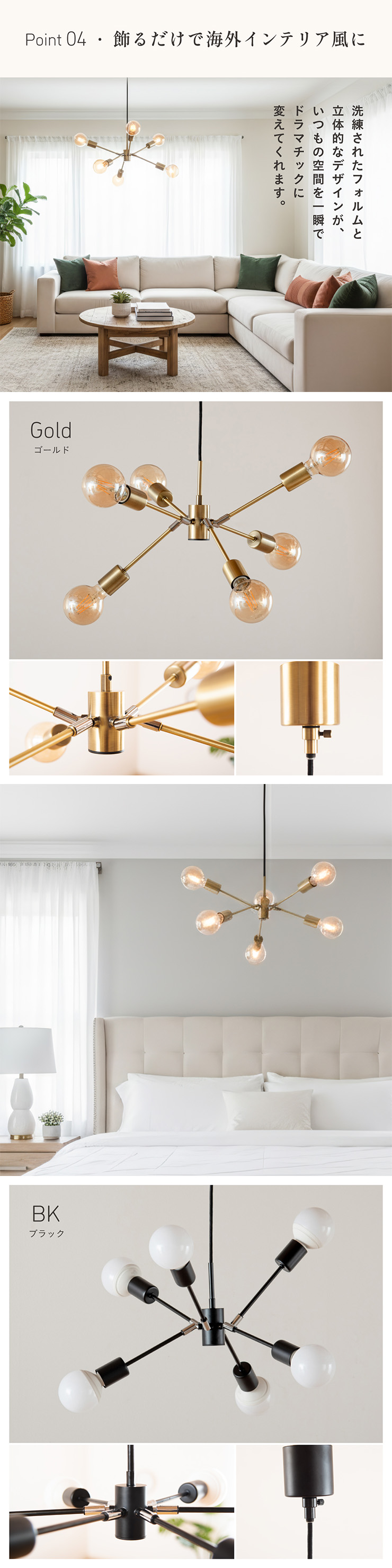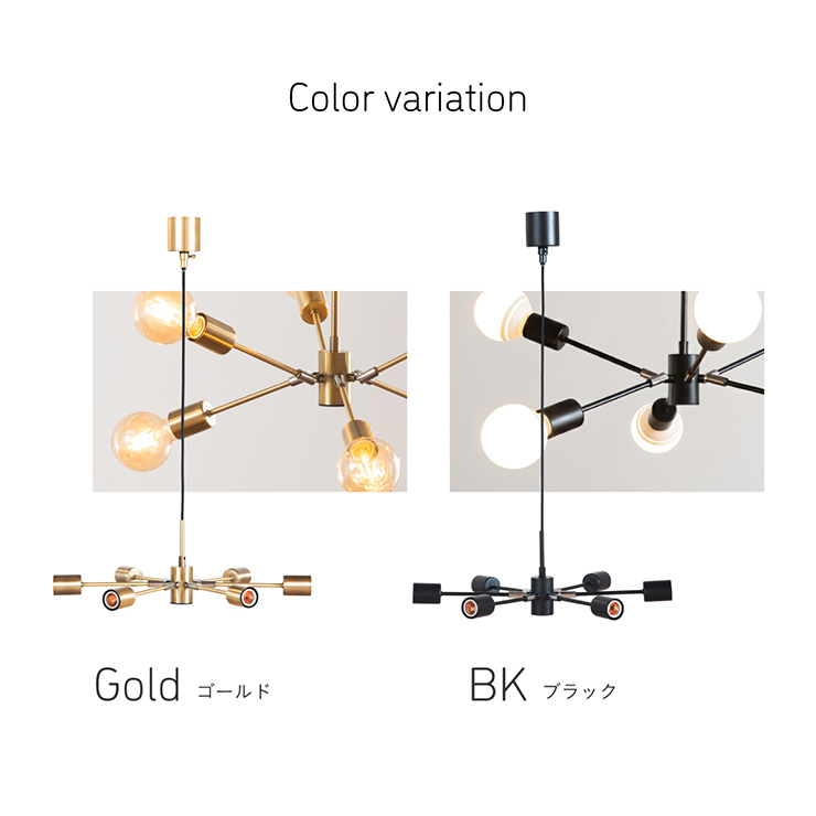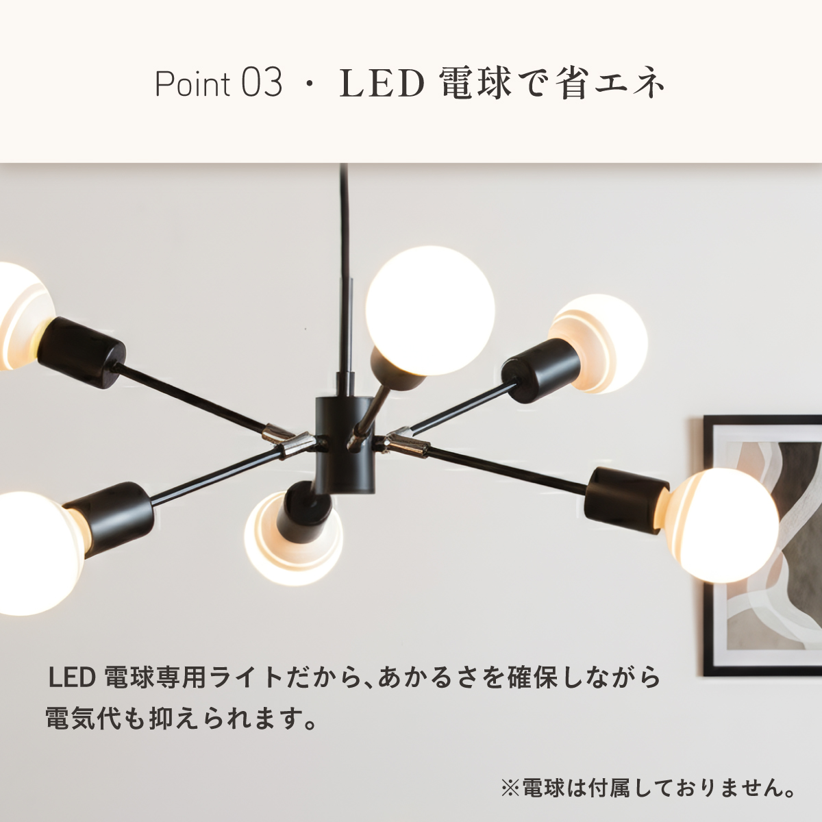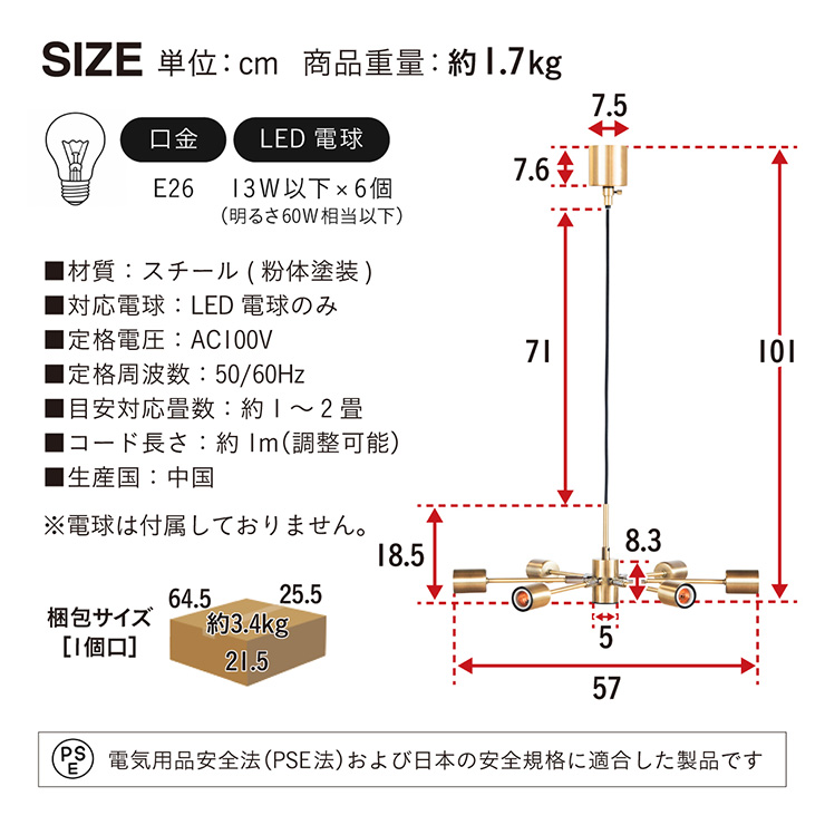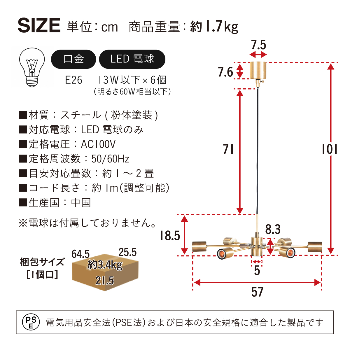 | 材質・素材 | 本体:スチール(粉体塗装) 対応電球:LED電球のみ(E26/13W以下x6個) 定格電圧:AC100V 定格周波数:50/60Hz 目安対応畳数:約1~2畳 コードの長さ:調節可能 |