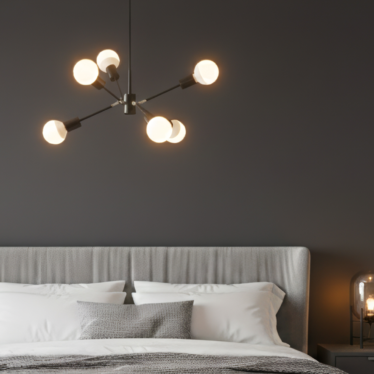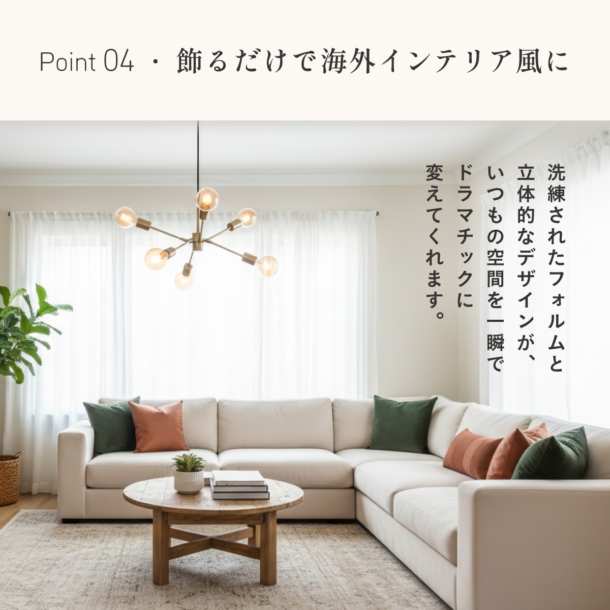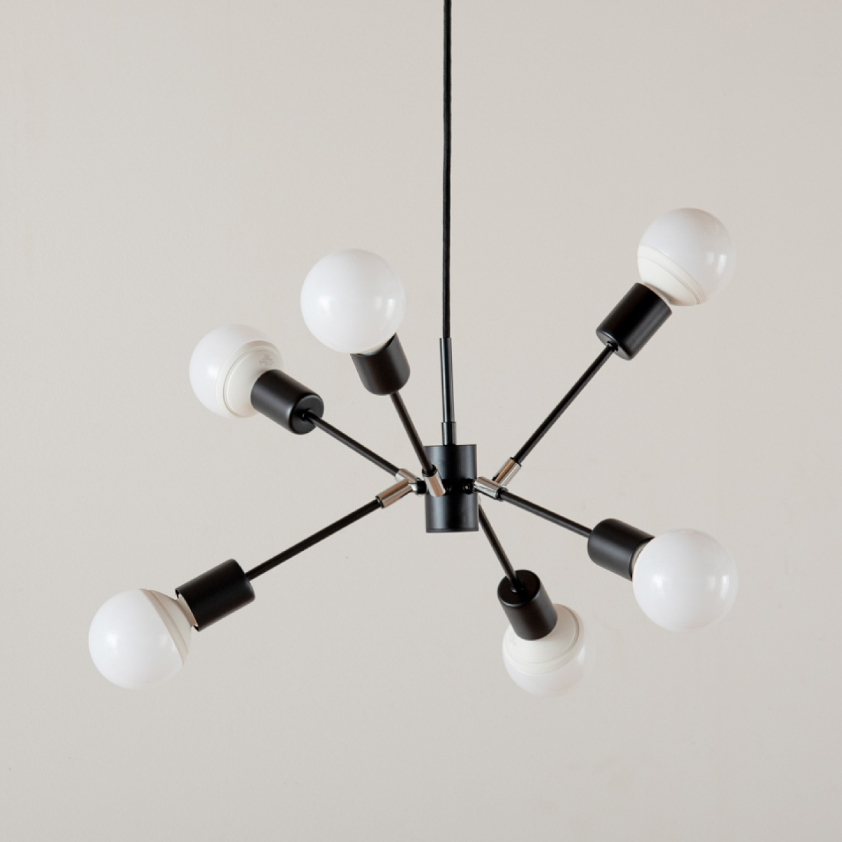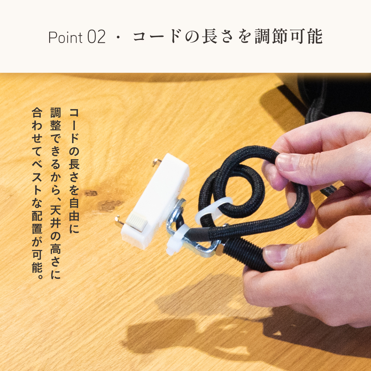 | 材質・素材 | 本体:スチール(粉体塗装) 対応電球:LED電球のみ(E26/13W以下x6個) 定格電圧:AC100V 定格周波数:50/60Hz 目安対応畳数:約1~2畳 コードの長さ:調節可能 |