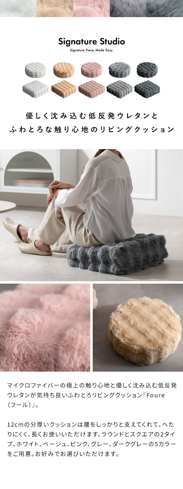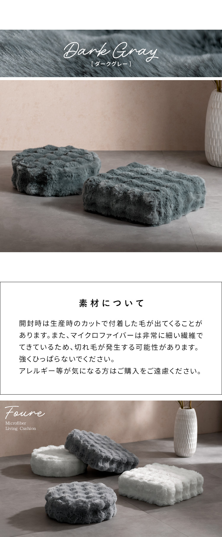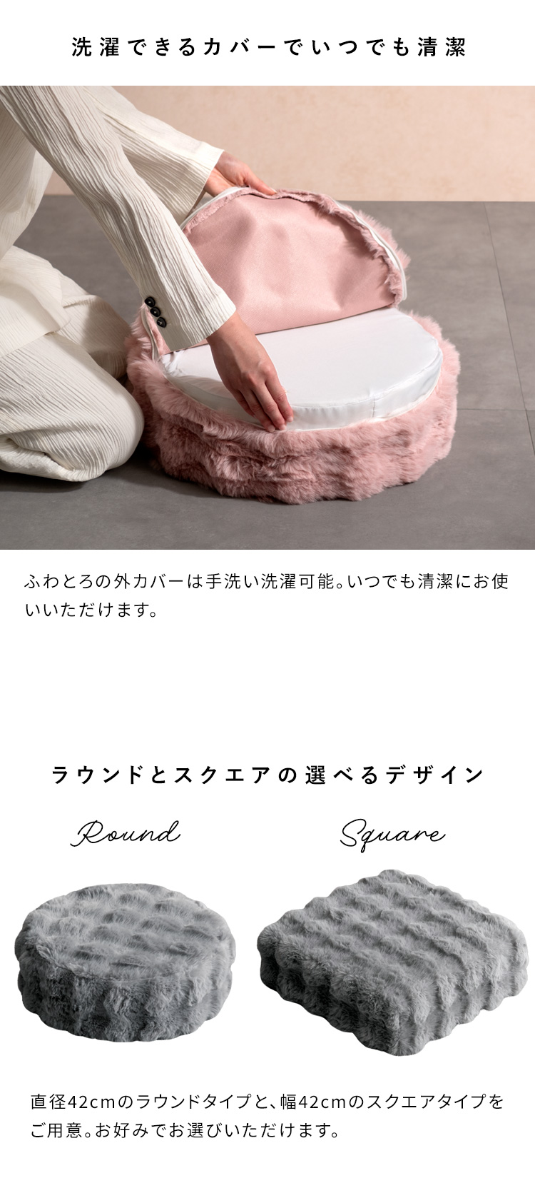 | ふわとろリビングクッション Foure(フール) マイクロファイバーの極上の触り心地と優しく沈み込む低反発ウレタンが気持ち良いふわとろリビングクッション 12cmの分厚いクッションは腰をしっかりと支えてくれて、へたりにくく、長くお使いいただけます。 ■分厚く座り心地の良い柔らかく沈み込む低反発ウレタン ・低反発ウレタン:じんわり柔らかく沈み込んで体圧を分散させ、腰やお尻の負担を軽減してくれる低反発ウレタン ・チップウレタン:へたりにくく耐久性に優れたチップウレタンを低反発ウレタンで挟んだ構造です。 ■使いたい時にサッと持ち運べる軽量&コンパクトサイズ ■おうち時間のいろいろなシーンでリラックスタイムをサポート あぐらクッション・肘置き・背もたれ・オットマンとしてもお使いいただけます。 ■マイクロファイバー生地のふわとろな触り心地 いつまでも触っていたくなるふわとろ張地は極細繊維の高密度なマイクロファイバー素材。さらさらの長い毛足がぽこぽこ凸凹のある可愛い仕上がりで極上の手触りになっております。 ■洗濯できるカバーでいつでも清潔 ふわとろの外カバーは手洗い洗濯可能。いつでも清潔にお使いいただけます。 ■ラウンドとスクエアの選べるデザイン ※開封時は生産時のカットで付着した毛が出てくることがあります。 ※マイクロファイバーは非常に細い繊維でできているため、切れ毛が発生する可能性があります。アレルギー等が気になる方はご購入をご遠慮ください。 ※カバーのみ手洗い洗濯可能です。 | |