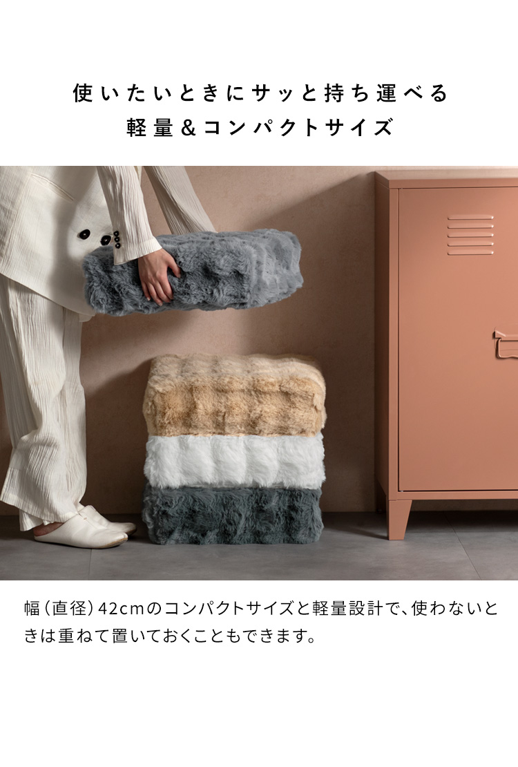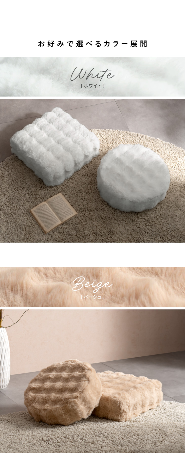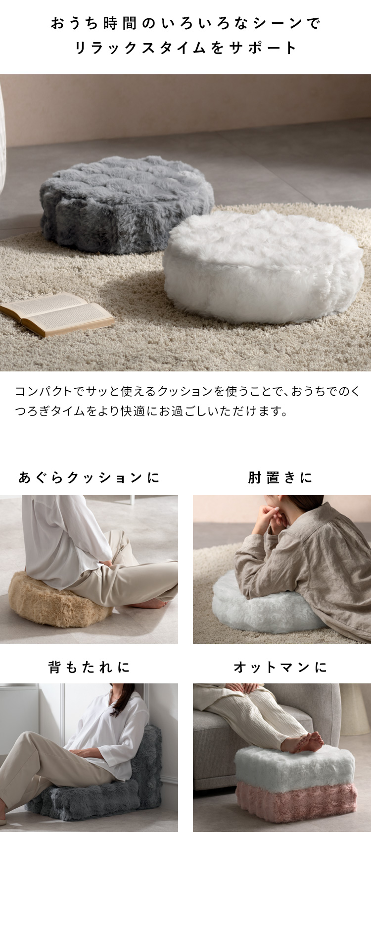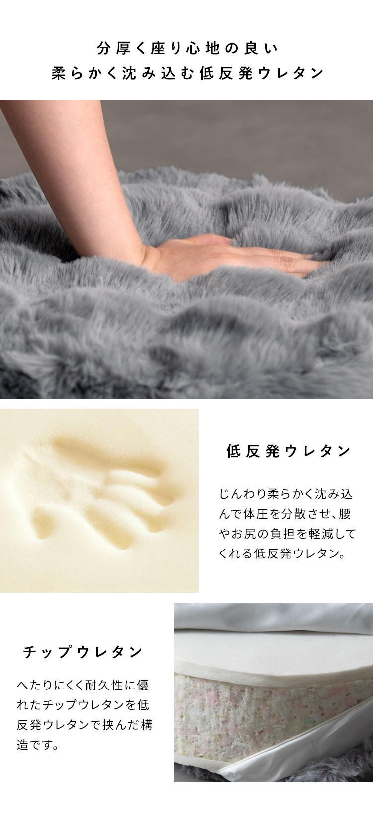 | ふわとろリビングクッション Foure(フール) マイクロファイバーの極上の触り心地と優しく沈み込む低反発ウレタンが気持ち良いふわとろリビングクッション 12cmの分厚いクッションは腰をしっかりと支えてくれて、へたりにくく、長くお使いいただけます。 ■分厚く座り心地の良い柔らかく沈み込む低反発ウレタン ・低反発ウレタン:じんわり柔らかく沈み込んで体圧を分散させ、腰やお尻の負担を軽減してくれる低反発ウレタン ・チップウレタン:へたりにくく耐久性に優れたチップウレタンを低反発ウレタンで挟んだ構造です。 ■使いたい時にサッと持ち運べる軽量&コンパクトサイズ ■おうち時間のいろいろなシーンでリラックスタイムをサポート あぐらクッション・肘置き・背もたれ・オットマンとしてもお使いいただけます。 ■マイクロファイバー生地のふわとろな触り心地 いつまでも触っていたくなるふわとろ張地は極細繊維の高密度なマイクロファイバー素材。さらさらの長い毛足がぽこぽこ凸凹のある可愛い仕上がりで極上の手触りになっております。 ■洗濯できるカバーでいつでも清潔 ふわとろの外カバーは手洗い洗濯可能。いつでも清潔にお使いいただけます。 ■ラウンドとスクエアの選べるデザイン ※開封時は生産時のカットで付着した毛が出てくることがあります。 ※マイクロファイバーは非常に細い繊維でできているため、切れ毛が発生する可能性があります。アレルギー等が気になる方はご購入をご遠慮ください。 ※カバーのみ手洗い洗濯可能です。 | |