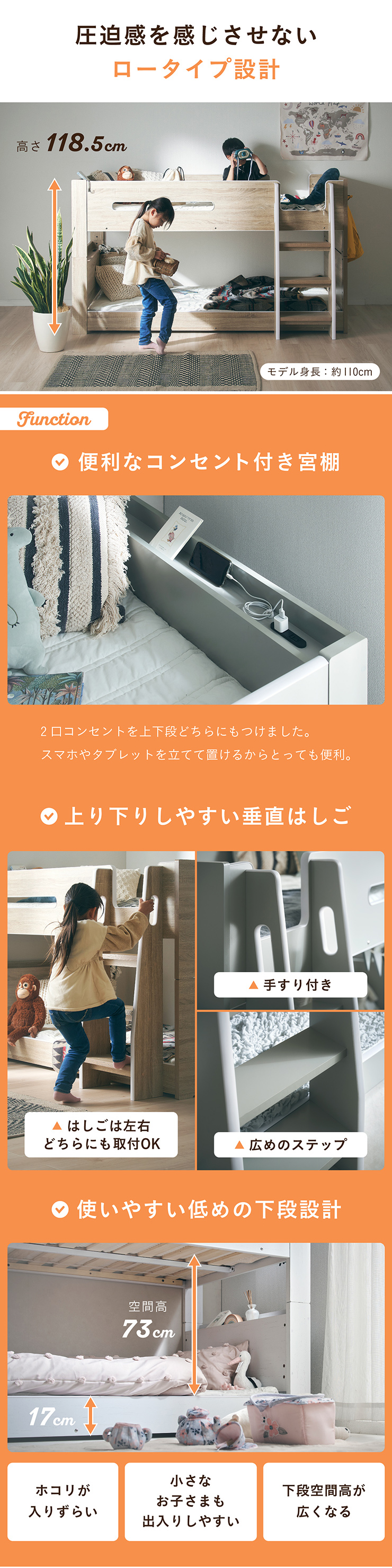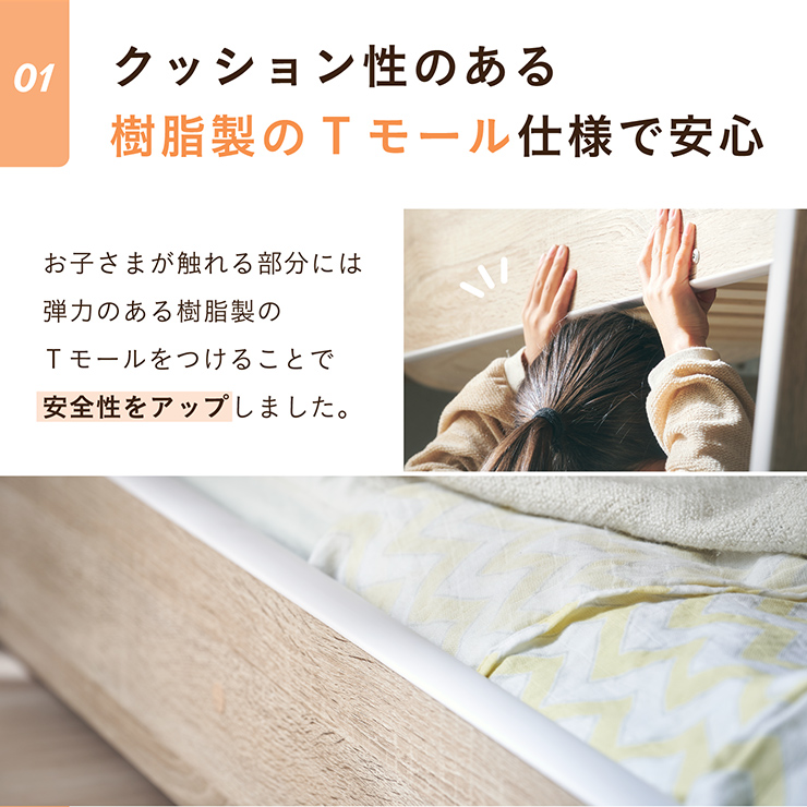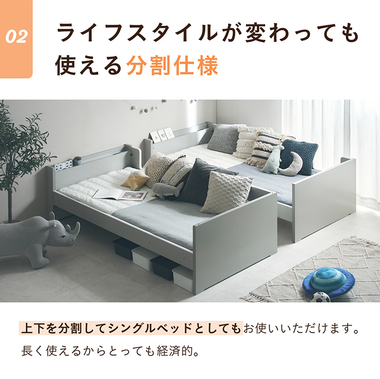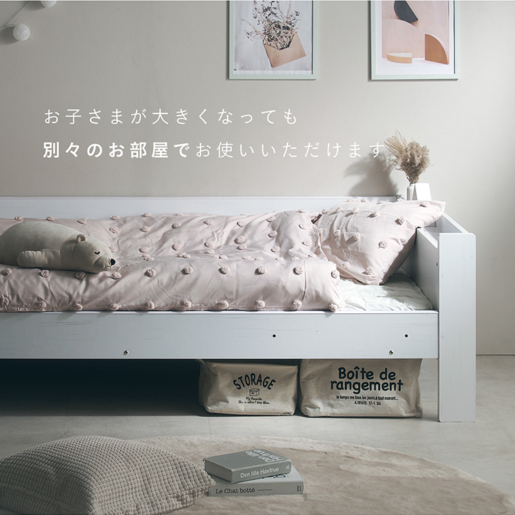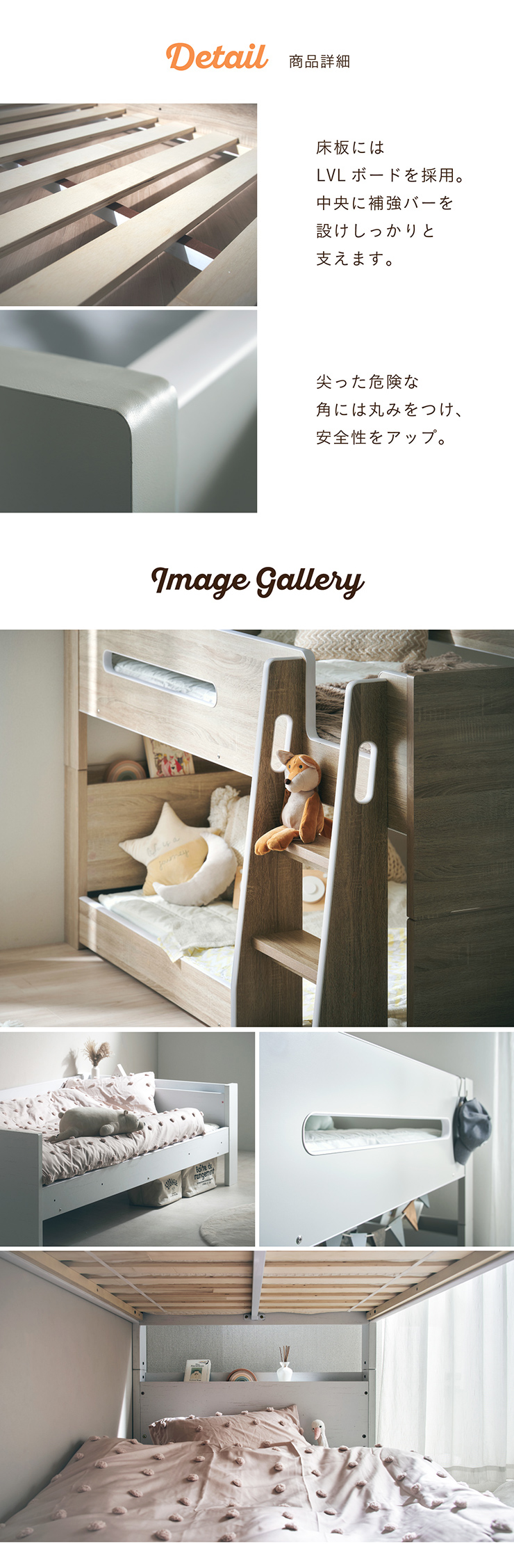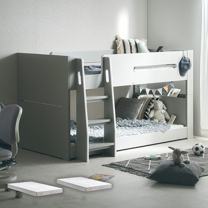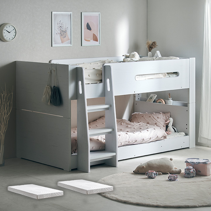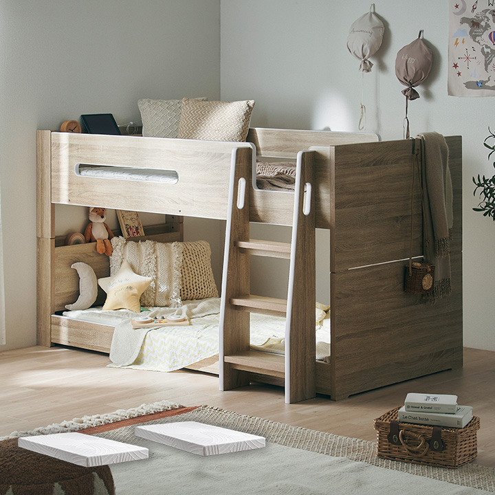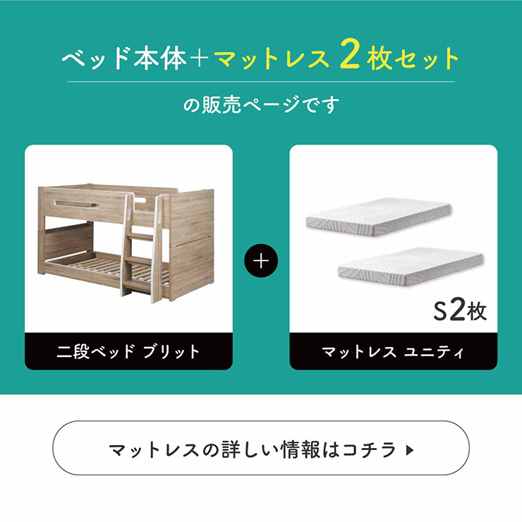 | 2段ベッド Britt(ブリット)+Unity(ユニティ) コンパクトで使いやすい2段ベッド Bunk bed Britt(ブリット)+Unity(ユニティ)2枚セット ■クッション性のある樹脂製のTモール仕様 お子さまが触れる部分には弾力のある樹脂製のTモールをつけることで安全性をアップしました。 ■ライフスタイルが変わっても使える分割仕様 上下を分割してシングルベッドとしてもお使いいただけます。長く使えるからとっても経済的。 ■2台連結してキングベッドのようにも使える 2人で並んで寝てもOK。隣に顔が見えて安心。 ※中央にフレームがございます ■便利なコンセント付き宮棚 便利な2口コンセントを上下どちらにもつけました。スマホやタブレットを立てて置けるからとっても便利。 ■使いやすい低めの下段設計 ・ホコリが入りずらい ・小さなお子さまも出入りしやすい ・下段空間高が広くなる ※こちらの商品はお客様組み立てとなります。 ※ベッド本体+マットレス2枚セットの販売となります。 ※詳細ページの注意事項を必ずご確認ください。 | |