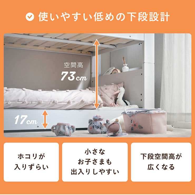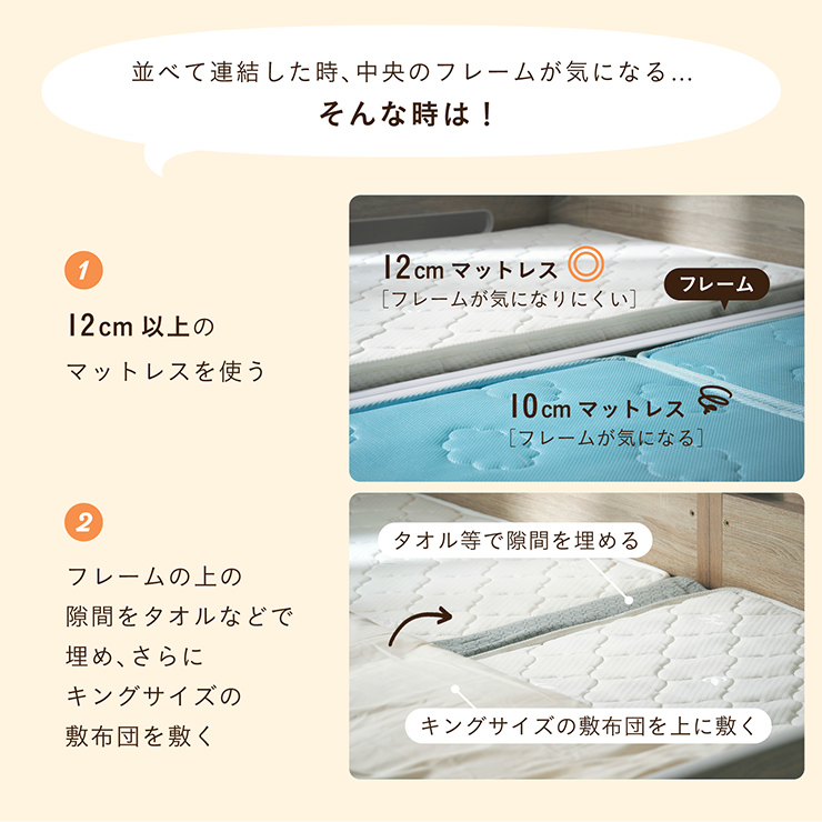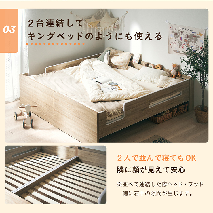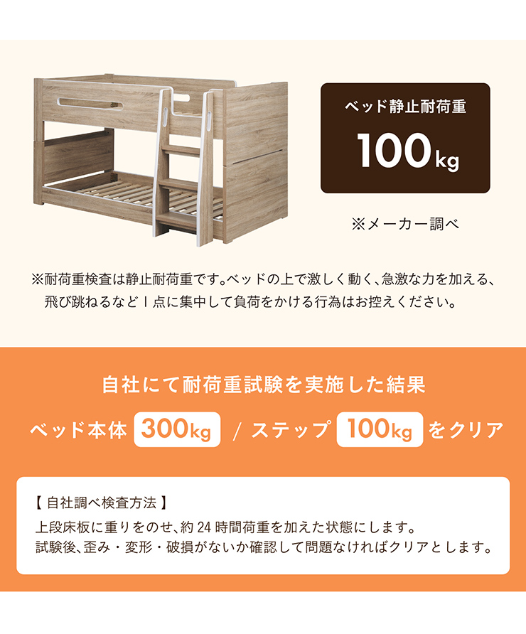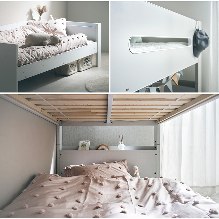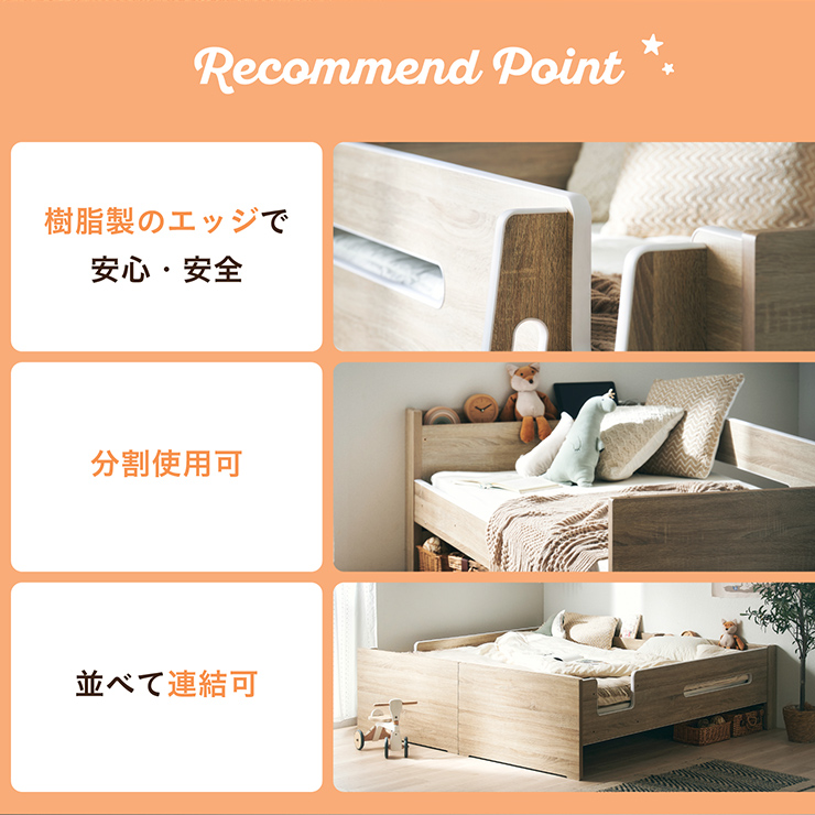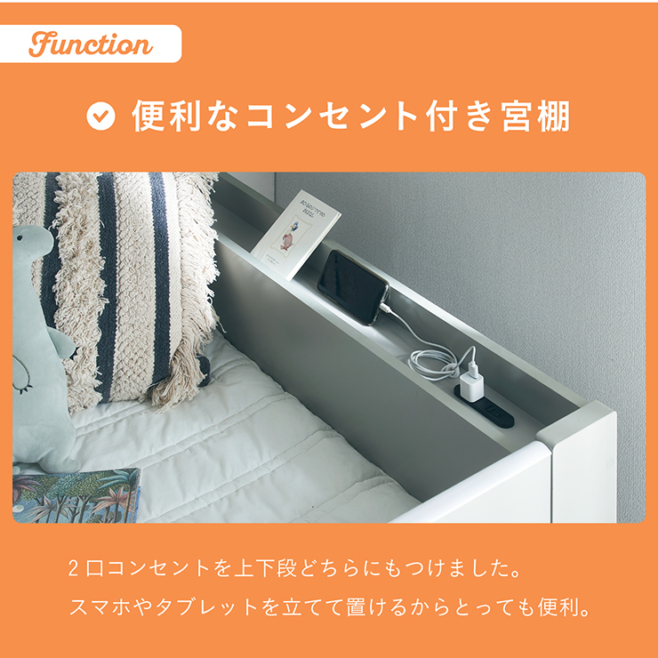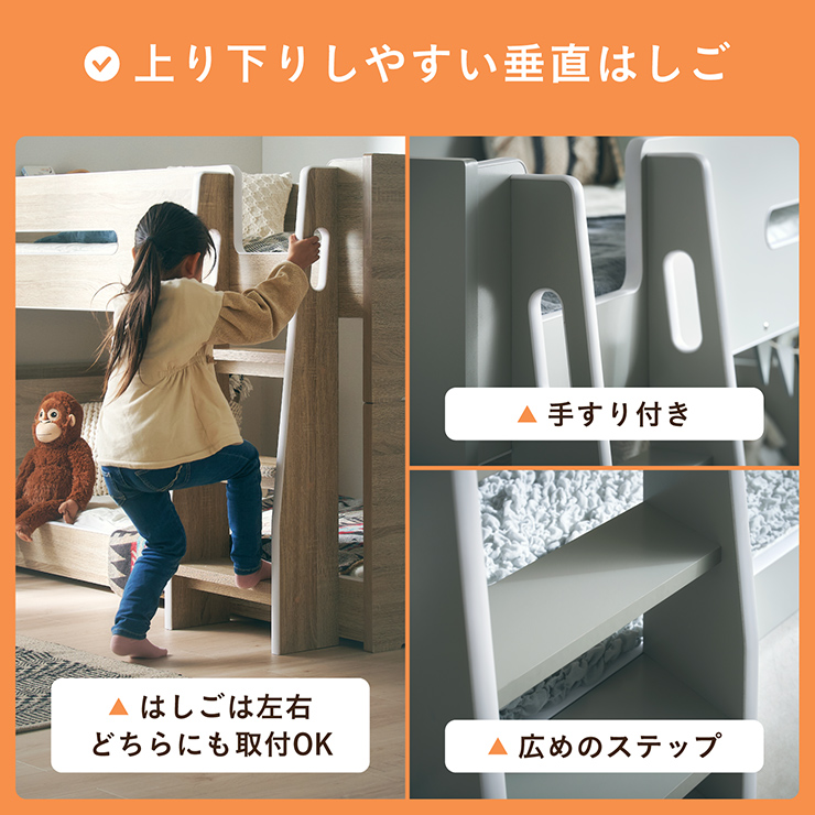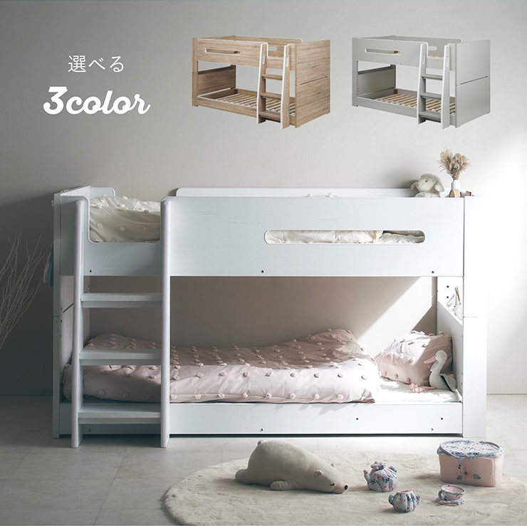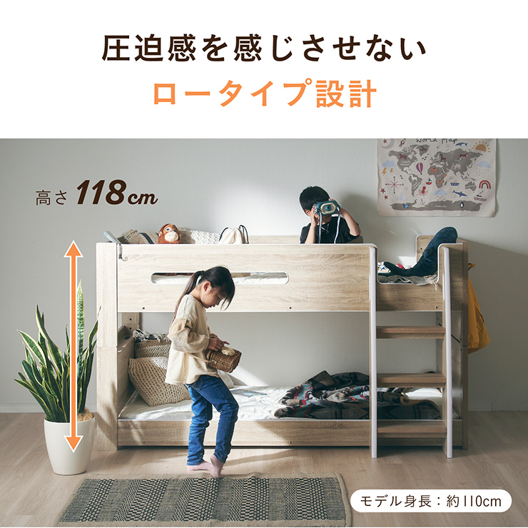 | 2段ベッド Britt(ブリット)+Unity(ユニティ) コンパクトで使いやすい2段ベッド Bunk bed Britt(ブリット)+Unity(ユニティ)2枚セット ■クッション性のある樹脂製のTモール仕様 お子さまが触れる部分には弾力のある樹脂製のTモールをつけることで安全性をアップしました。 ■ライフスタイルが変わっても使える分割仕様 上下を分割してシングルベッドとしてもお使いいただけます。長く使えるからとっても経済的。 ■2台連結してキングベッドのようにも使える 2人で並んで寝てもOK。隣に顔が見えて安心。 ※中央にフレームがございます ■便利なコンセント付き宮棚 便利な2口コンセントを上下どちらにもつけました。スマホやタブレットを立てて置けるからとっても便利。 ■使いやすい低めの下段設計 ・ホコリが入りずらい ・小さなお子さまも出入りしやすい ・下段空間高が広くなる ※こちらの商品はお客様組み立てとなります。 ※ベッド本体+マットレス2枚セットの販売となります。 ※詳細ページの注意事項を必ずご確認ください。 | |