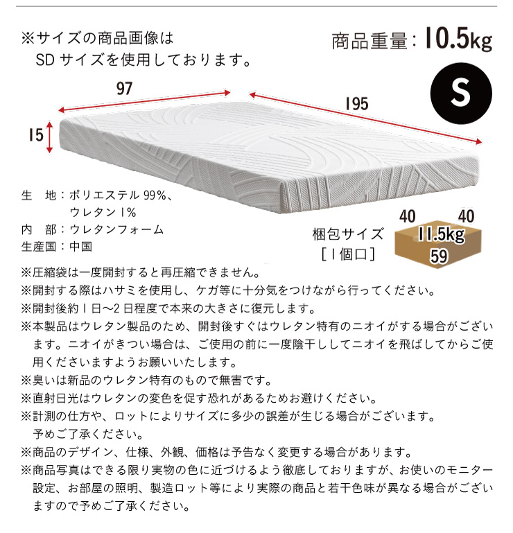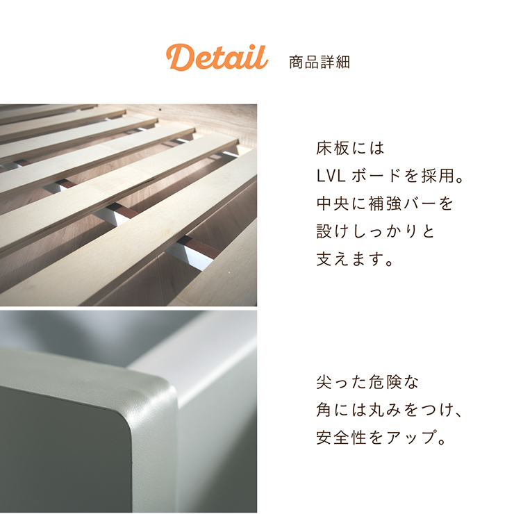| 材質 | ベッド本体:パーティクルボード・シート張り 床板:LVL マットレス生地:ポリエステル99%・ウレタン1% 内部:ウレタンフォーム |