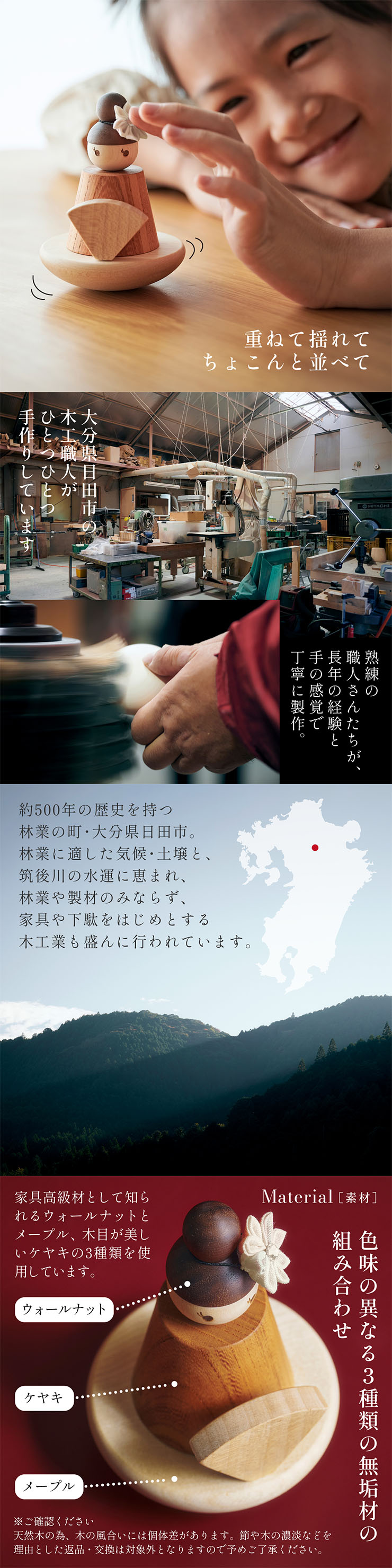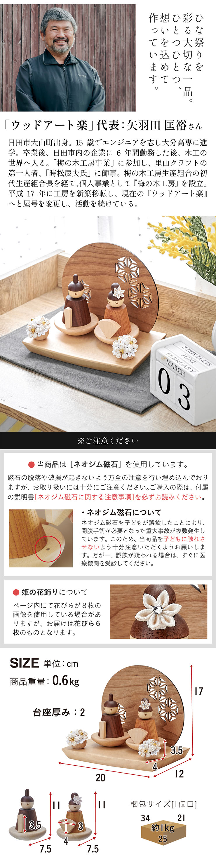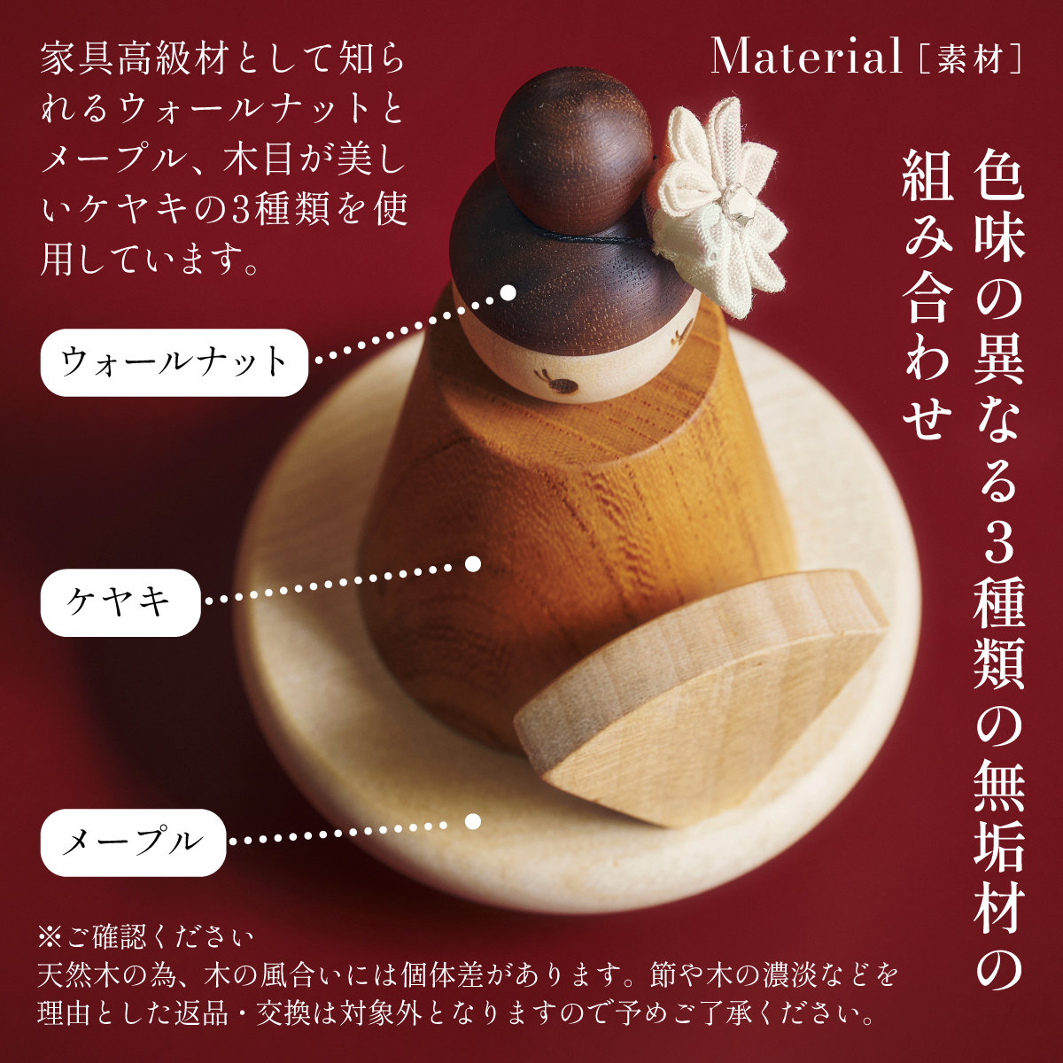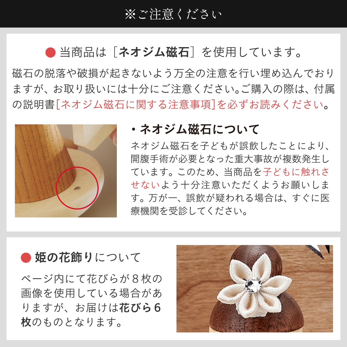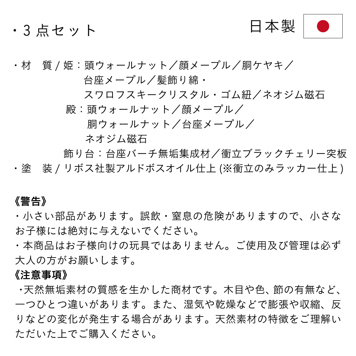 | 材質・素材 | 姫:ウォールナット(頭)・メープル(顔)・ケヤキ(胴)・メープル(台座)・綿/スワロフスキークリスタル/ゴム紐(髪飾り)・ネオジム磁石 殿:ウォールナット(頭)・メープル(顔)・ウォールナット(胴)・メープル(台座)・ネオジム磁石 台座:バーチ無垢集成材 衝立:衝立ブラックチェリー突板 塗装:リボス社製アルドボスオイル仕上(※衝立のみラッカー仕上) |