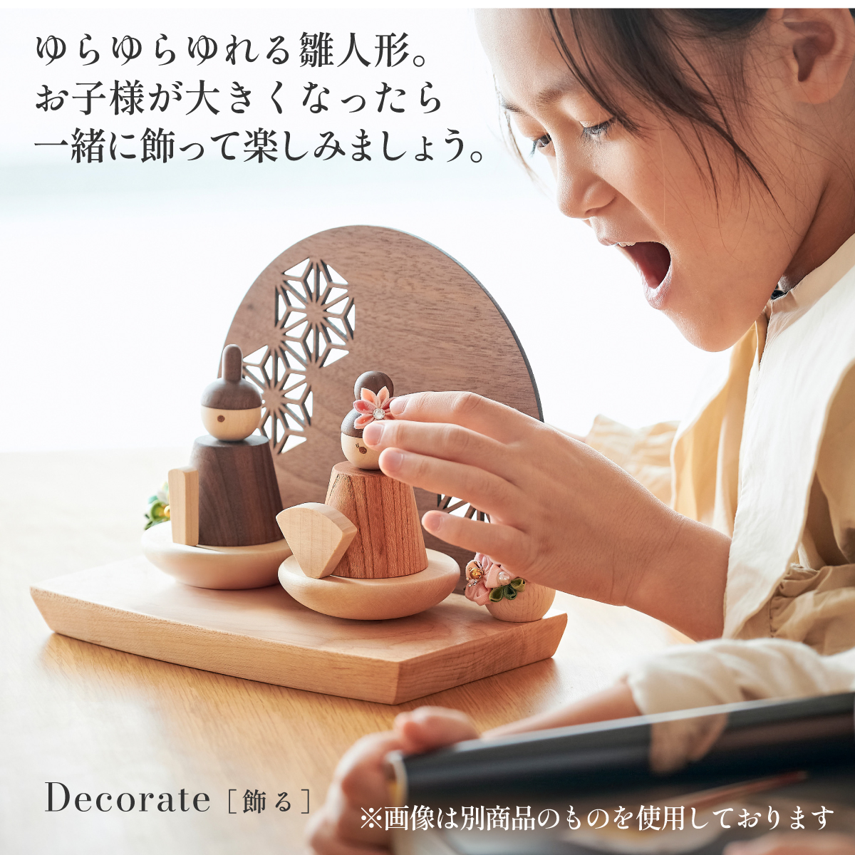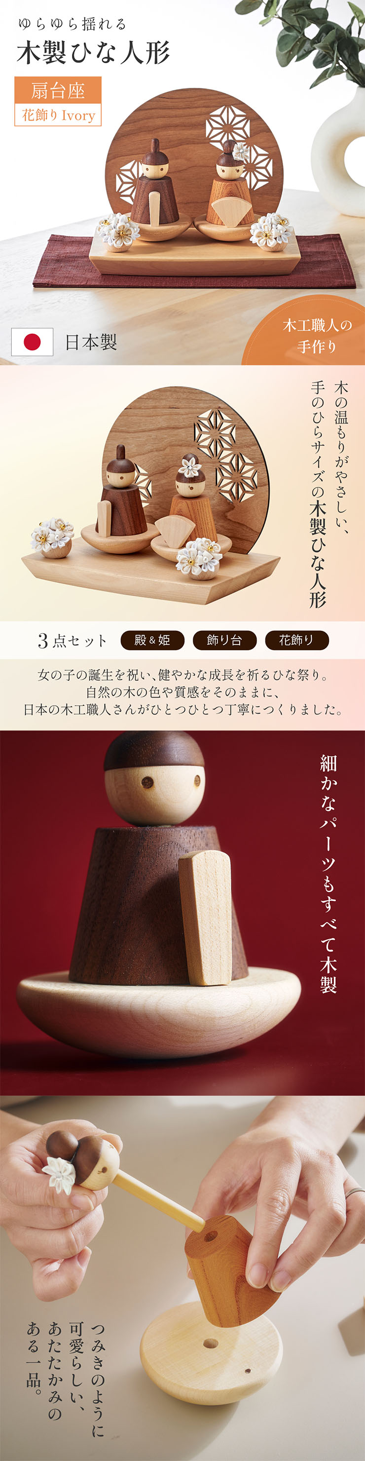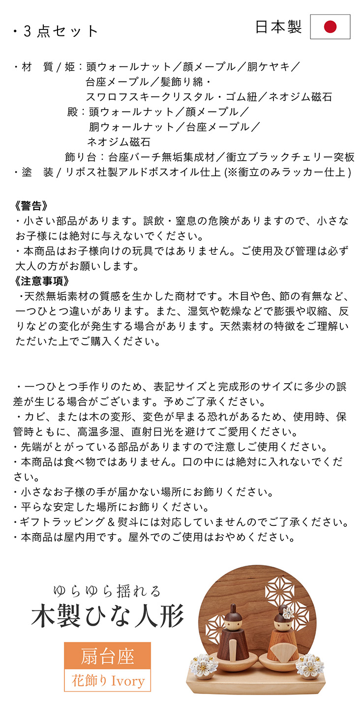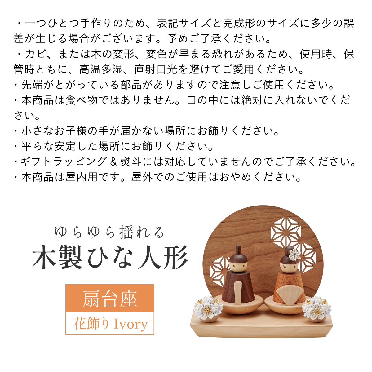 | ゆらゆら揺れる 木製ひな人形 扇台座 花飾りIvory 木工職人の手作り 木の温もりがやさしい手のひらサイズの木製ひな人形 3点セット(殿&姫・台座・花飾り) ■色味の異なる3種類の無垢材の組み合わせ 家具高級材として知られるウォールナットとメープル、木目が美しいケヤキの3種類を使用しています。 ■木にも環境にも優しい塗料を使っています。 赤ちゃんのおもちゃにも使える安心・安全な塗料を使用しています。 ■花飾り 200年以上の歴史を持つ「つまみ細工」は、小さな布をおったりつまんだりして組み合わせ、四季折々の花鳥風月を表現する、日本の伝統技術です。 ■台座 日本の伝統柄『麻の葉』づかいで、節句がより華やかに ■着脱パーツで簡単に組み立てられます。 穴に差し込むだけなので着脱が簡単。保管時もコンパクトになるため場所を取りません。 ※当商品は[ネオジム磁石]を使用しています。磁石の脱落や破損が起きないよう万全の注意を行い埋め込んでおりますが、お取り扱いには十分にご注意ください。 ※当商品をお子さまに触れさせないように十分ご注意ください。万が一、誤飲が疑われる場合は、すぐに医療機関を受診してください。 ※姫の花飾りの花びらが8枚の画像を使用している場合がございますが、おとどけの花びらは6枚のものとなります。 ※小さい部品があります。誤飲・窒息の危険がありますので、小さなお子様には絶対に与えないでください。 ※本商品はお子様向けの玩具ではありません。ご使用及び管理は必ず大人の方がお願いします。 ※天然無垢素材の質感を生かした商材です。木目の色、節の有無など、一つひとつの違いがあります。 ※また、湿気や乾燥などで膨張や収縮、反りなどの変化が発生する場合があります。天然素材の特徴をご理解いただいた上でご購入ください。 ※一つひとつ手作りのため、表記サイズと完成形のサイズに多少の誤差が生じる場合がございます。予めご了承ください。 ※カビ、または木の変形、変色が早まる恐れがあるため、使用時、保管時ともに、高温多湿、食車日光を避けてご愛用ください。 ※先端がとがっている部品がありますので注意しご使用ください。 ※本商品は食べ物ではありません。口の中には絶対に入れないでください。 ※小さなお子様の手が届かない場所にお飾りください。 ※平らな安定した場所にお飾りください。 ※ギフトラッピング&熨斗には対応していませんのでご了承ください。※本商品は屋内用です。屋外でのご使用はおやめください。 | |