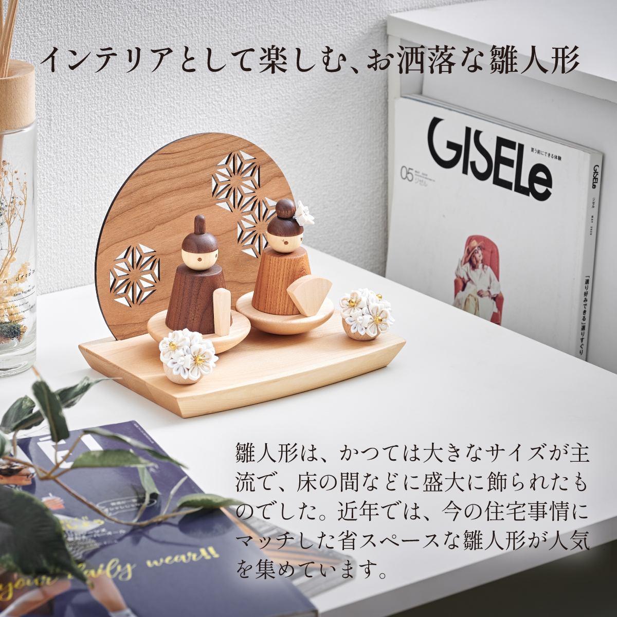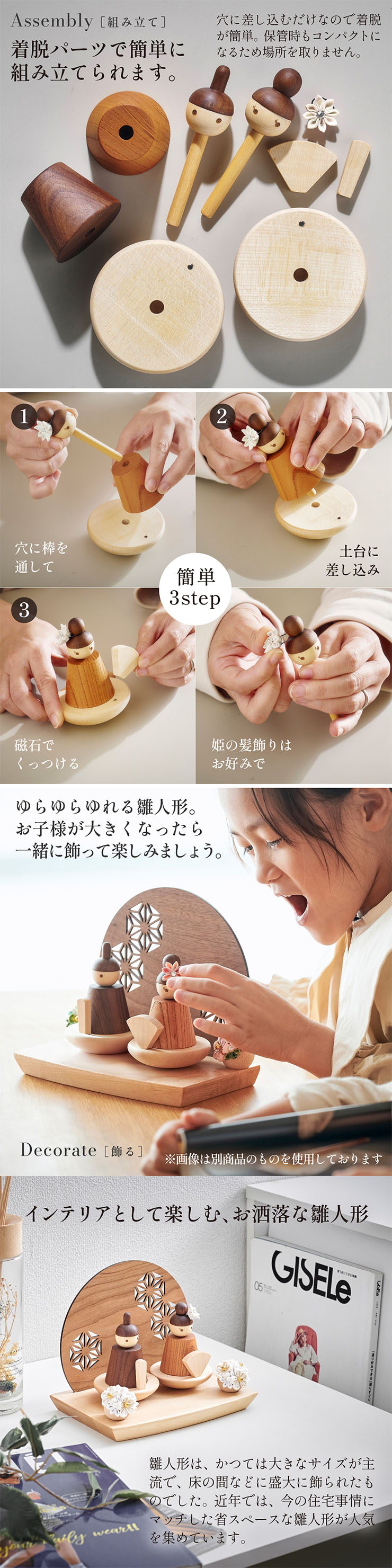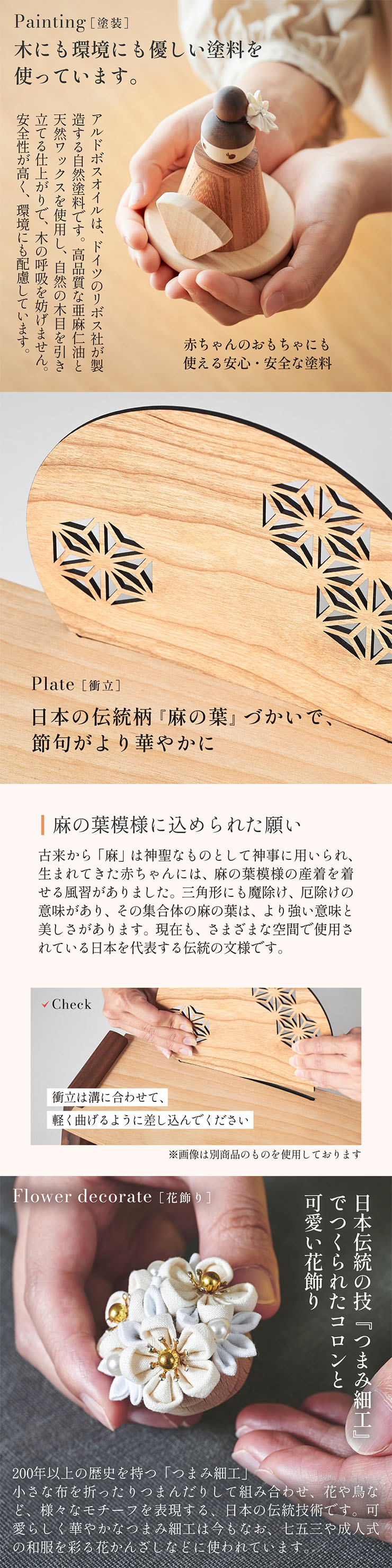 | ゆらゆら揺れる 木製ひな人形 扇台座 花飾りIvory 木工職人の手作り 木の温もりがやさしい手のひらサイズの木製ひな人形 3点セット(殿&姫・台座・花飾り) ■色味の異なる3種類の無垢材の組み合わせ 家具高級材として知られるウォールナットとメープル、木目が美しいケヤキの3種類を使用しています。 ■木にも環境にも優しい塗料を使っています。 赤ちゃんのおもちゃにも使える安心・安全な塗料を使用しています。 ■花飾り 200年以上の歴史を持つ「つまみ細工」は、小さな布をおったりつまんだりして組み合わせ、四季折々の花鳥風月を表現する、日本の伝統技術です。 ■台座 日本の伝統柄『麻の葉』づかいで、節句がより華やかに ■着脱パーツで簡単に組み立てられます。 穴に差し込むだけなので着脱が簡単。保管時もコンパクトになるため場所を取りません。 ※当商品は[ネオジム磁石]を使用しています。磁石の脱落や破損が起きないよう万全の注意を行い埋め込んでおりますが、お取り扱いには十分にご注意ください。 ※当商品をお子さまに触れさせないように十分ご注意ください。万が一、誤飲が疑われる場合は、すぐに医療機関を受診してください。 ※姫の花飾りの花びらが8枚の画像を使用している場合がございますが、おとどけの花びらは6枚のものとなります。 ※小さい部品があります。誤飲・窒息の危険がありますので、小さなお子様には絶対に与えないでください。 ※本商品はお子様向けの玩具ではありません。ご使用及び管理は必ず大人の方がお願いします。 ※天然無垢素材の質感を生かした商材です。木目の色、節の有無など、一つひとつの違いがあります。 ※また、湿気や乾燥などで膨張や収縮、反りなどの変化が発生する場合があります。天然素材の特徴をご理解いただいた上でご購入ください。 ※一つひとつ手作りのため、表記サイズと完成形のサイズに多少の誤差が生じる場合がございます。予めご了承ください。 ※カビ、または木の変形、変色が早まる恐れがあるため、使用時、保管時ともに、高温多湿、食車日光を避けてご愛用ください。 ※先端がとがっている部品がありますので注意しご使用ください。 ※本商品は食べ物ではありません。口の中には絶対に入れないでください。 ※小さなお子様の手が届かない場所にお飾りください。 ※平らな安定した場所にお飾りください。 ※ギフトラッピング&熨斗には対応していませんのでご了承ください。※本商品は屋内用です。屋外でのご使用はおやめください。 | |
