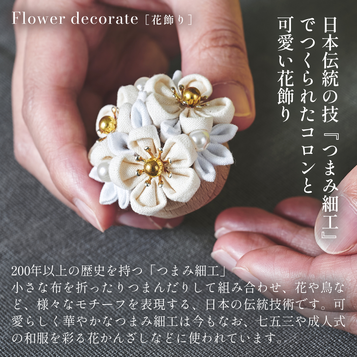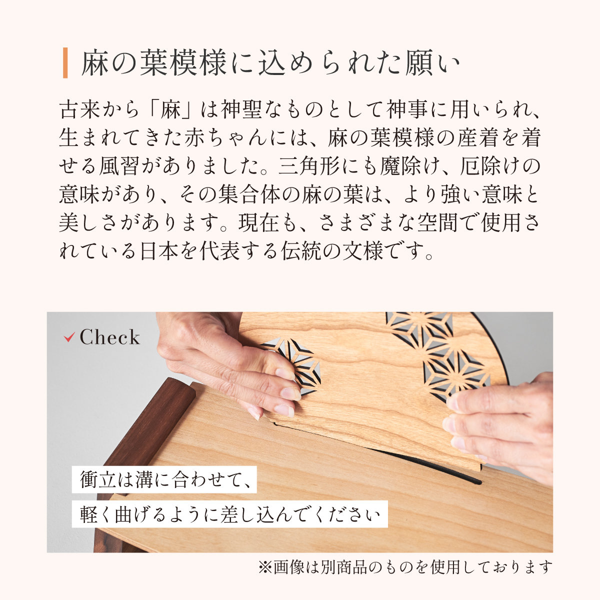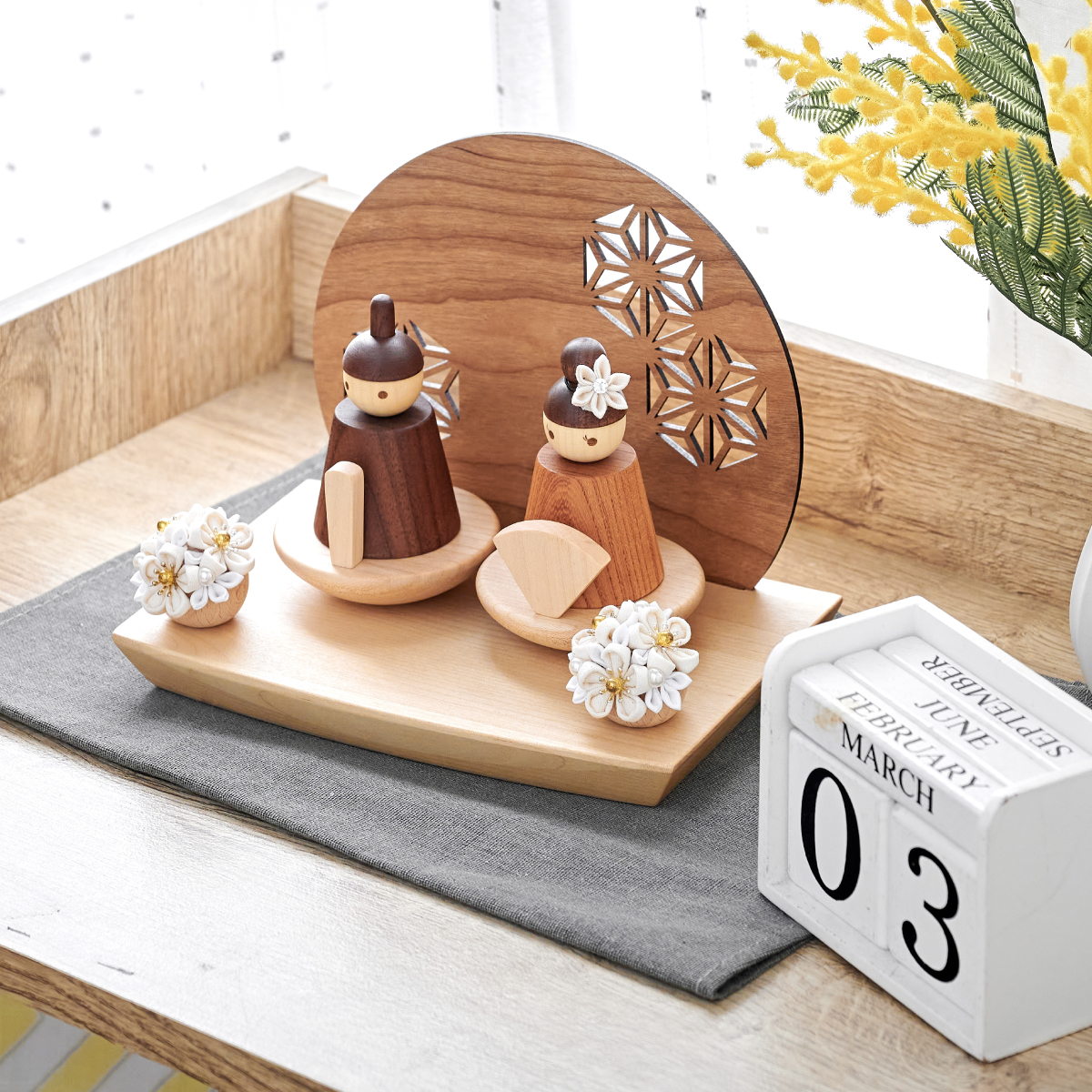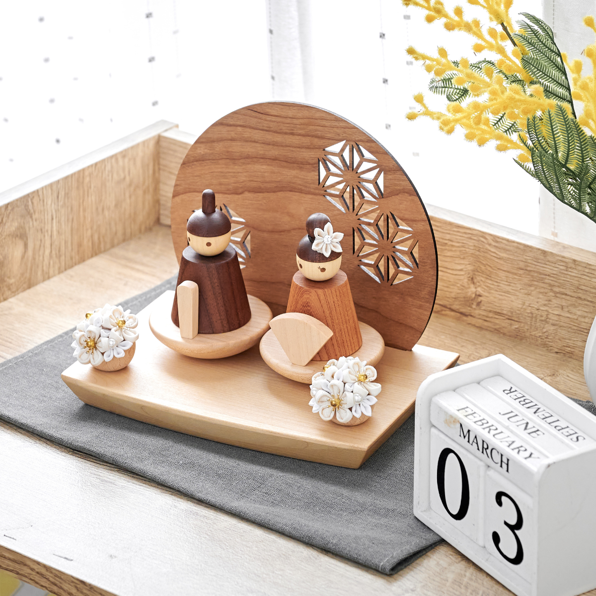 | ゆらゆら揺れる 木製ひな人形 扇台座 花飾りIvory 木工職人の手作り 木の温もりがやさしい手のひらサイズの木製ひな人形 3点セット(殿&姫・台座・花飾り) ■色味の異なる3種類の無垢材の組み合わせ 家具高級材として知られるウォールナットとメープル、木目が美しいケヤキの3種類を使用しています。 ■木にも環境にも優しい塗料を使っています。 赤ちゃんのおもちゃにも使える安心・安全な塗料を使用しています。 ■花飾り 200年以上の歴史を持つ「つまみ細工」は、小さな布をおったりつまんだりして組み合わせ、四季折々の花鳥風月を表現する、日本の伝統技術です。 ■台座 日本の伝統柄『麻の葉』づかいで、節句がより華やかに ■着脱パーツで簡単に組み立てられます。 穴に差し込むだけなので着脱が簡単。保管時もコンパクトになるため場所を取りません。 ※当商品は[ネオジム磁石]を使用しています。磁石の脱落や破損が起きないよう万全の注意を行い埋め込んでおりますが、お取り扱いには十分にご注意ください。 ※当商品をお子さまに触れさせないように十分ご注意ください。万が一、誤飲が疑われる場合は、すぐに医療機関を受診してください。 ※姫の花飾りの花びらが8枚の画像を使用している場合がございますが、おとどけの花びらは6枚のものとなります。 ※小さい部品があります。誤飲・窒息の危険がありますので、小さなお子様には絶対に与えないでください。 ※本商品はお子様向けの玩具ではありません。ご使用及び管理は必ず大人の方がお願いします。 ※天然無垢素材の質感を生かした商材です。木目の色、節の有無など、一つひとつの違いがあります。 ※また、湿気や乾燥などで膨張や収縮、反りなどの変化が発生する場合があります。天然素材の特徴をご理解いただいた上でご購入ください。 ※一つひとつ手作りのため、表記サイズと完成形のサイズに多少の誤差が生じる場合がございます。予めご了承ください。 ※カビ、または木の変形、変色が早まる恐れがあるため、使用時、保管時ともに、高温多湿、食車日光を避けてご愛用ください。 ※先端がとがっている部品がありますので注意しご使用ください。 ※本商品は食べ物ではありません。口の中には絶対に入れないでください。 ※小さなお子様の手が届かない場所にお飾りください。 ※平らな安定した場所にお飾りください。 ※ギフトラッピング&熨斗には対応していませんのでご了承ください。※本商品は屋内用です。屋外でのご使用はおやめください。 | |