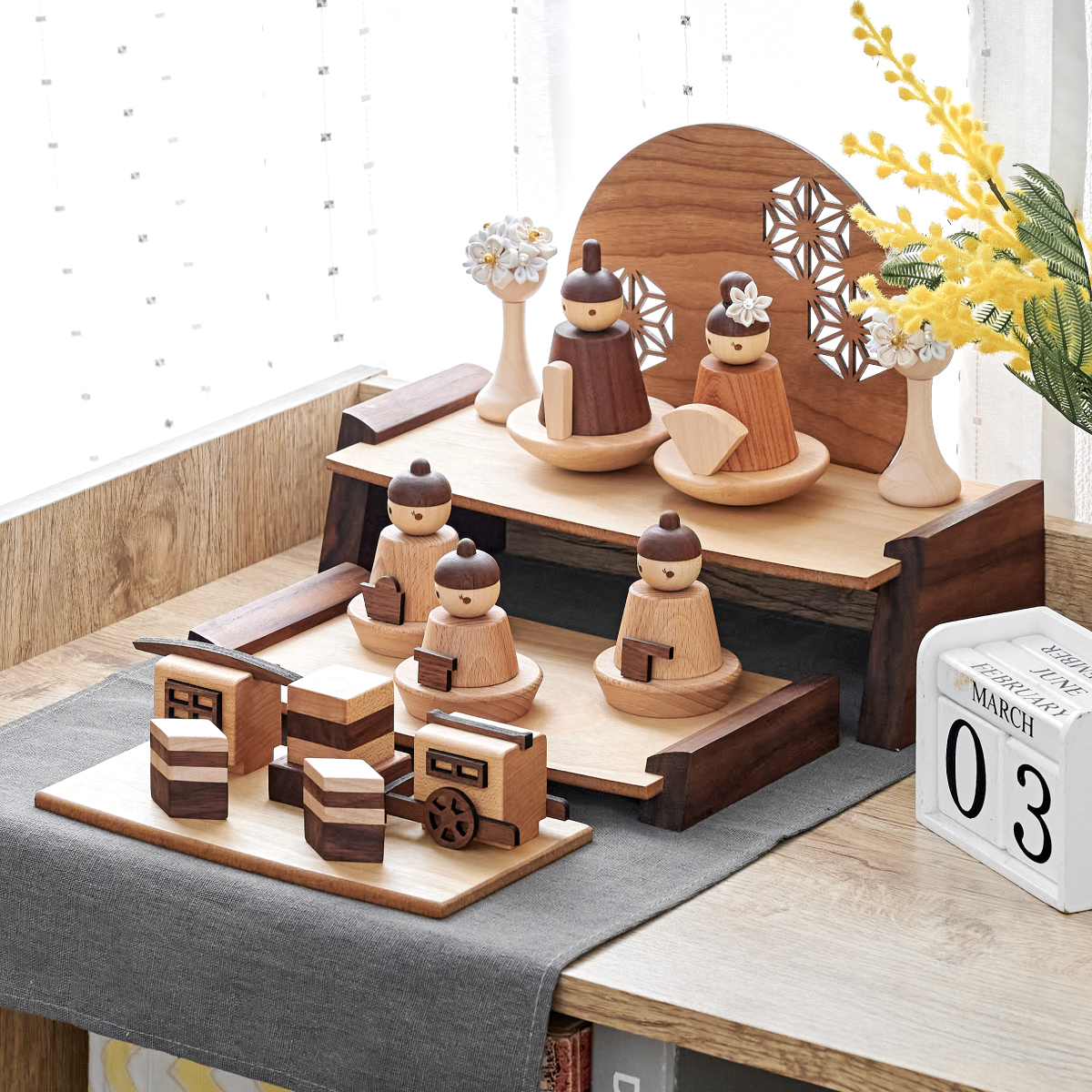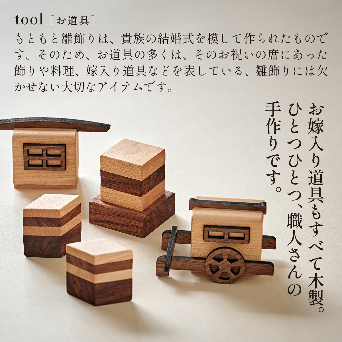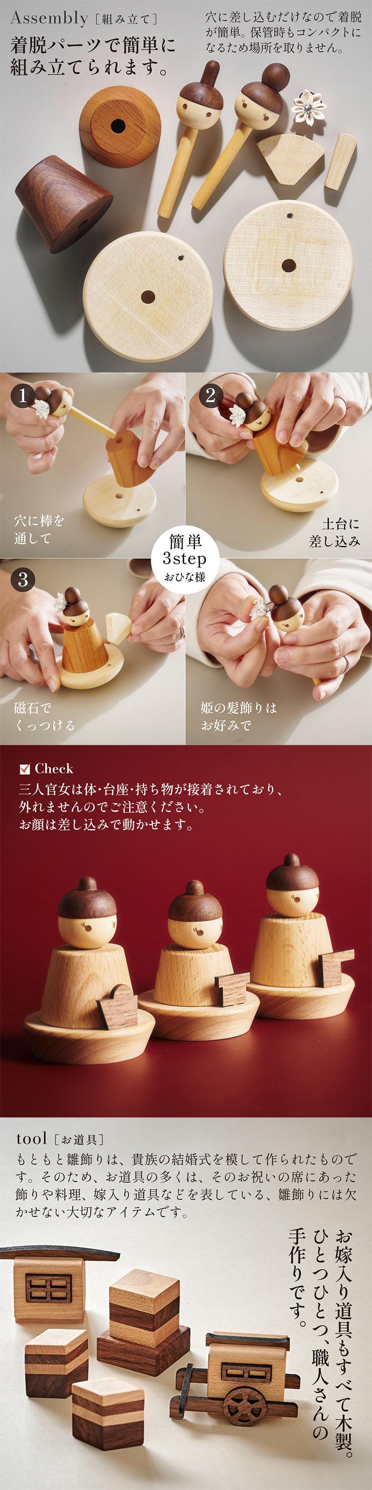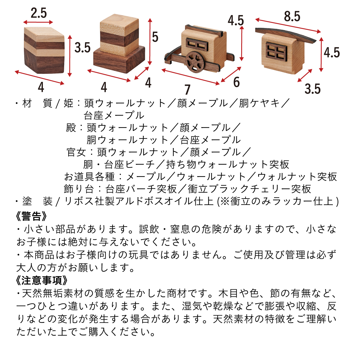 | 材質・素材 | 姫:ウォールナット(頭)・メープル(顔)・ケヤキ(胴)・メープル(台座)・綿/スワロフスキークリスタル/ゴム紐(髪飾り)・ネオジム磁石 殿:ウォールナット(頭)・メープル(顔)・ウォールナット(胴)・メープル(台座)・ネオジム磁石 官女:ウォールナット(頭)・メープル(顔)・ビーチ(胴・台座)・ウォールナット突板(持ち物) お道具各種:メープル・ウォールナット・ウォルナット突板 台座:バーチ無垢集成材 衝立:衝立ブラックチェリー突板 塗装:リボス社製アルドボスオイル仕上(※衝立のみラッカー仕上) |