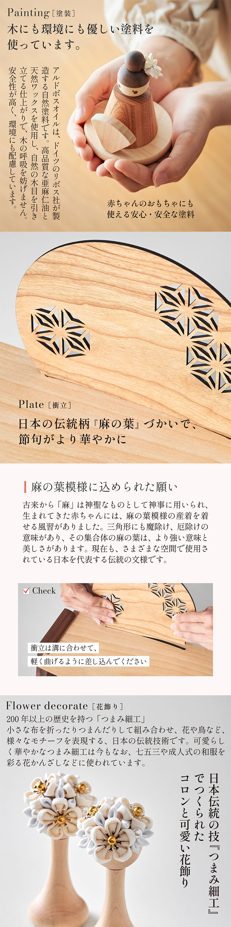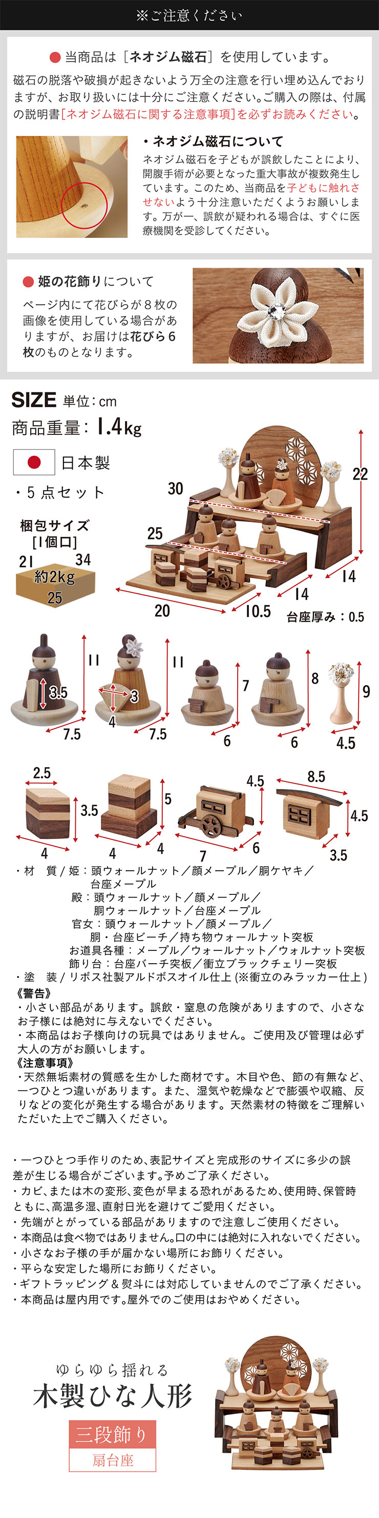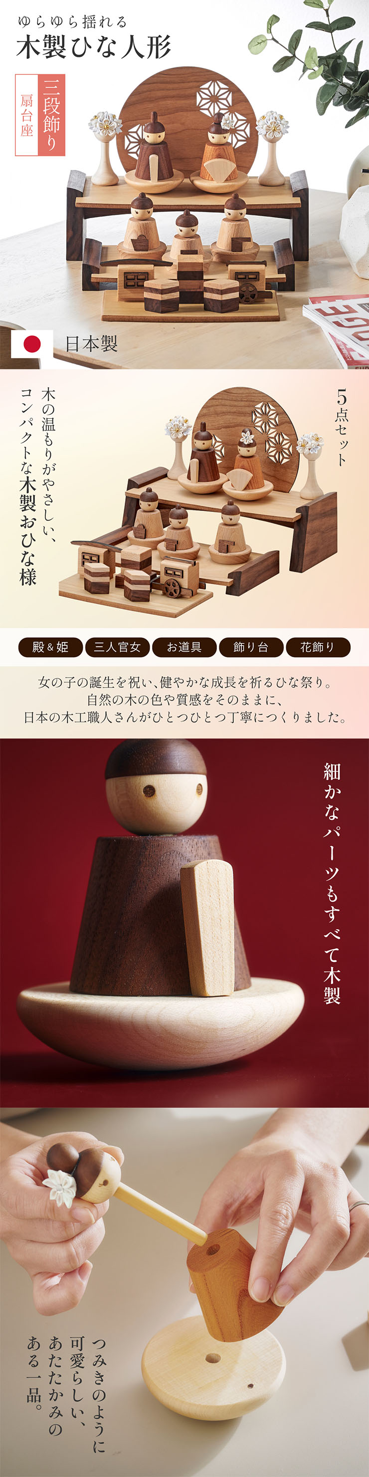 | ゆらゆら揺れる 木製ひな人形 三段飾り 扇台座 木工職人の手作り 木の温もりがやさしい手のひらサイズの木製ひな人形 5点セット(殿&姫・三人官女・お道具・飾り台・花飾り) ■色味の異なる3種類の無垢材の組み合わせ 家具高級材として知られるウォールナットとメープル、木目が美しいケヤキの3種類を使用しています。 ■木にも環境にも優しい塗料を使っています。 赤ちゃんのおもちゃにも使える安心・安全な塗料を使用しています。 ■花飾り 200年以上の歴史を持つ「つまみ細工」は、小さな布をおったりつまんだりして組み合わせ、四季折々の花鳥風月を表現する、日本の伝統技術です。 ■台座 日本の伝統柄『麻の葉』づかいで、節句がより華やかに ■着脱パーツで簡単に組み立てられます。 穴に差し込むだけなので着脱が簡単。保管時もコンパクトになるため場所を取りません。 ■お道具 お嫁入道具もすべて木製。ひとつひとつ、職人さんの手作りです。 ※当商品は[ネオジム磁石]を使用しています。磁石の脱落や破損が起きないよう万全の注意を行い埋め込んでおりますが、お取り扱いには十分にご注意ください。 ※当商品をお子さまに触れさせないように十分ご注意ください。万が一、誤飲が疑われる場合は、すぐに医療機関を受診してください。 ※姫の花飾りの花びらが8枚の画像を使用している場合がございますが、おとどけの花びらは6枚のものとなります。 ※三人官女は体・台座・持ち物が接着されており、外れませんのでご注意ください。お顔は差し込みで動かせます。 ※小さい部品があります。誤飲・窒息の危険がありますので、小さなお子様には絶対に与えないでください。 ※本商品はお子様向けの玩具ではありません。ご使用及び管理は必ず大人の方がお願いします。 ※天然無垢素材の質感を生かした商材です。木目の色、節の有無など、一つひとつの違いがあります。 ※また、湿気や乾燥などで膨張や収縮、反りなどの変化が発生する場合があります。天然素材の特徴をご理解いただいた上でご購入ください。 ※一つひとつ手作りのため、表記サイズと完成形のサイズに多少の誤差が生じる場合がございます。予めご了承ください。 ※カビ、または木の変形、変色が早まる恐れがあるため、使用時、保管時ともに、高温多湿、食車日光を避けてご愛用ください。 ※先端がとがっている部品がありますので注意しご使用ください。 ※本商品は食べ物ではありません。口の中には絶対に入れないでください。 ※小さなお子様の手が届かない場所にお飾りください。 ※平らな安定した場所にお飾りください。 ※ギフトラッピング&熨斗には対応していませんのでご了承ください。※本商品は屋内用です。屋外でのご使用はおやめください。 | |