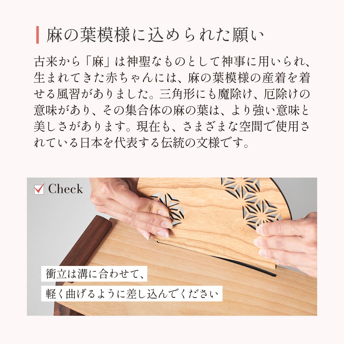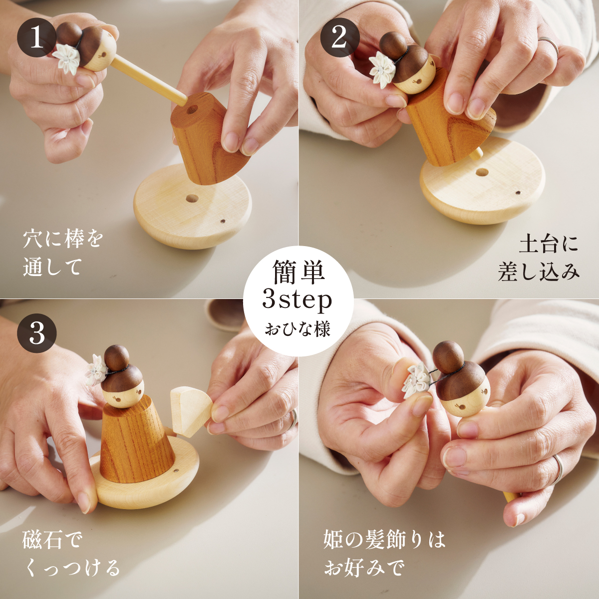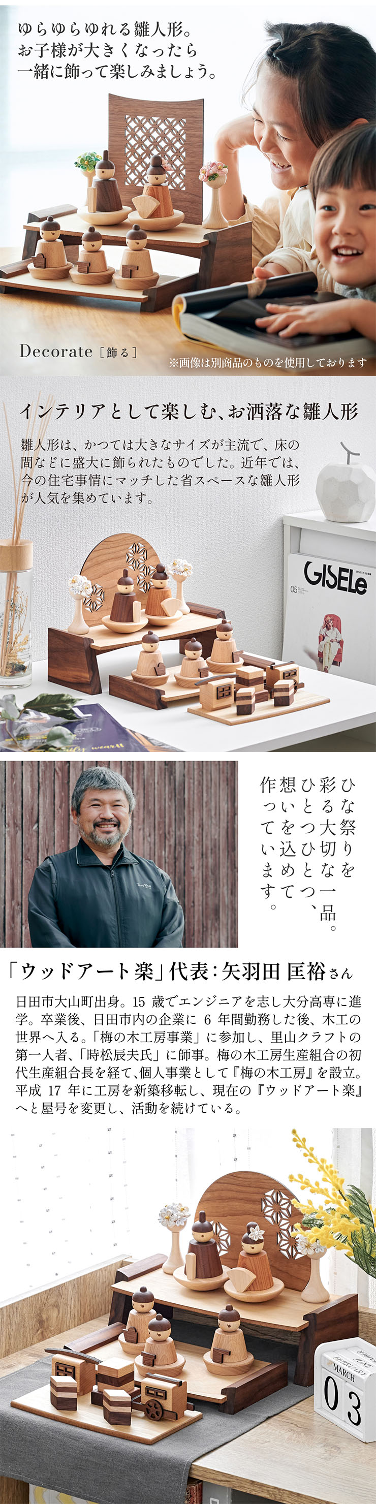 | ゆらゆら揺れる 木製ひな人形 三段飾り 扇台座 木工職人の手作り 木の温もりがやさしい手のひらサイズの木製ひな人形 5点セット(殿&姫・三人官女・お道具・飾り台・花飾り) ■色味の異なる3種類の無垢材の組み合わせ 家具高級材として知られるウォールナットとメープル、木目が美しいケヤキの3種類を使用しています。 ■木にも環境にも優しい塗料を使っています。 赤ちゃんのおもちゃにも使える安心・安全な塗料を使用しています。 ■花飾り 200年以上の歴史を持つ「つまみ細工」は、小さな布をおったりつまんだりして組み合わせ、四季折々の花鳥風月を表現する、日本の伝統技術です。 ■台座 日本の伝統柄『麻の葉』づかいで、節句がより華やかに ■着脱パーツで簡単に組み立てられます。 穴に差し込むだけなので着脱が簡単。保管時もコンパクトになるため場所を取りません。 ■お道具 お嫁入道具もすべて木製。ひとつひとつ、職人さんの手作りです。 ※当商品は[ネオジム磁石]を使用しています。磁石の脱落や破損が起きないよう万全の注意を行い埋め込んでおりますが、お取り扱いには十分にご注意ください。 ※当商品をお子さまに触れさせないように十分ご注意ください。万が一、誤飲が疑われる場合は、すぐに医療機関を受診してください。 ※姫の花飾りの花びらが8枚の画像を使用している場合がございますが、おとどけの花びらは6枚のものとなります。 ※三人官女は体・台座・持ち物が接着されており、外れませんのでご注意ください。お顔は差し込みで動かせます。 ※小さい部品があります。誤飲・窒息の危険がありますので、小さなお子様には絶対に与えないでください。 ※本商品はお子様向けの玩具ではありません。ご使用及び管理は必ず大人の方がお願いします。 ※天然無垢素材の質感を生かした商材です。木目の色、節の有無など、一つひとつの違いがあります。 ※また、湿気や乾燥などで膨張や収縮、反りなどの変化が発生する場合があります。天然素材の特徴をご理解いただいた上でご購入ください。 ※一つひとつ手作りのため、表記サイズと完成形のサイズに多少の誤差が生じる場合がございます。予めご了承ください。 ※カビ、または木の変形、変色が早まる恐れがあるため、使用時、保管時ともに、高温多湿、食車日光を避けてご愛用ください。 ※先端がとがっている部品がありますので注意しご使用ください。 ※本商品は食べ物ではありません。口の中には絶対に入れないでください。 ※小さなお子様の手が届かない場所にお飾りください。 ※平らな安定した場所にお飾りください。 ※ギフトラッピング&熨斗には対応していませんのでご了承ください。※本商品は屋内用です。屋外でのご使用はおやめください。 | |