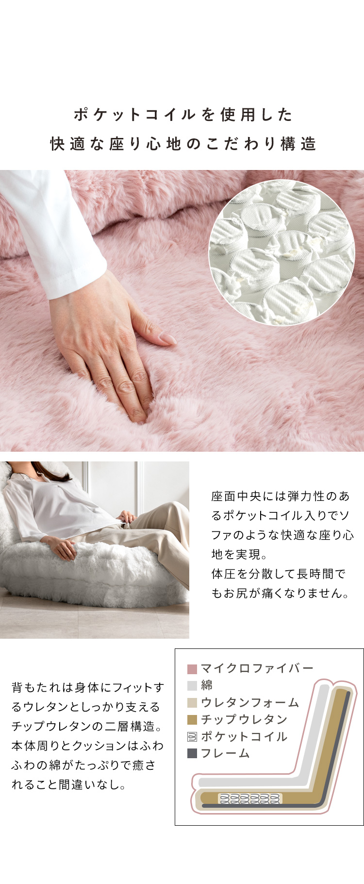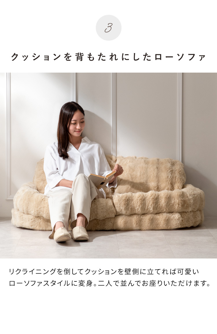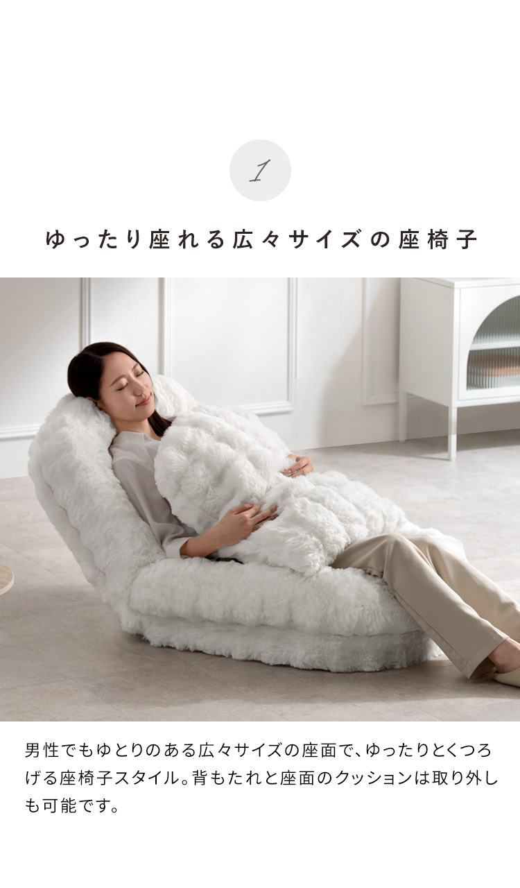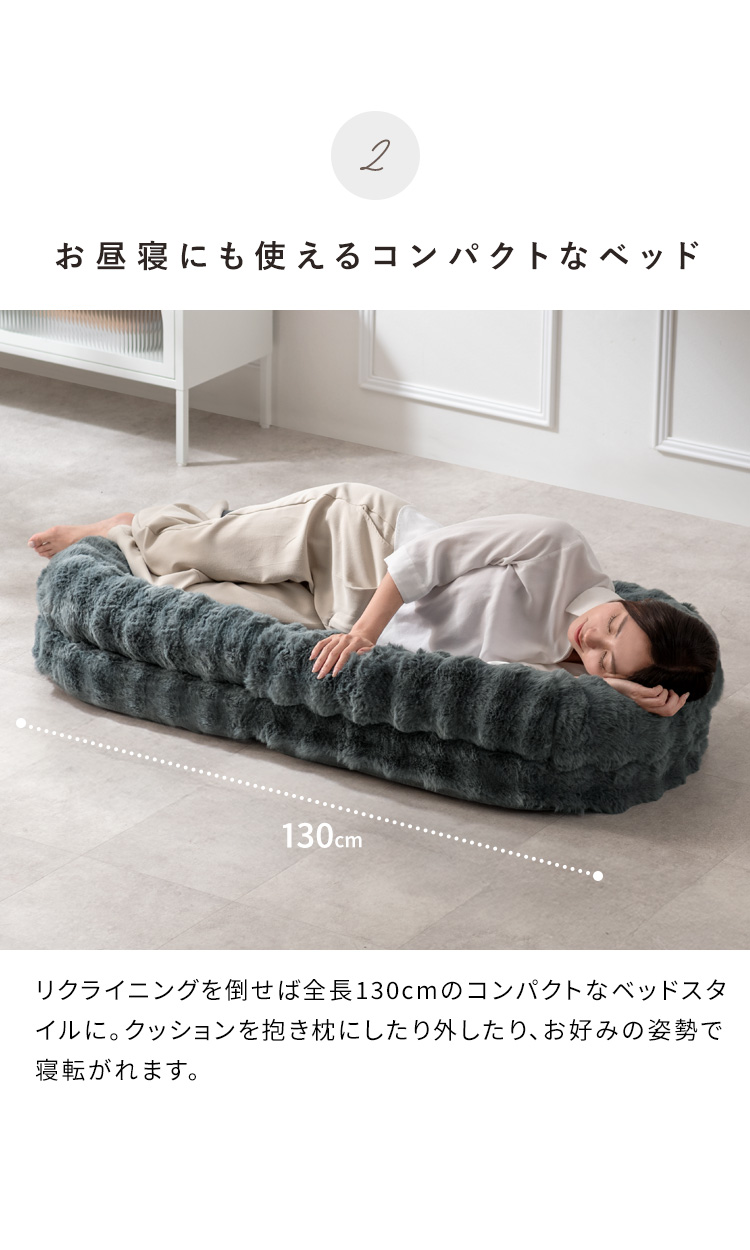 | ソファーベッド ふわとろソファベッド Foure(フール) コンパクトサイズ 座椅子・ソファ・ベッドの3wayで一日中過ごせる巣ごもりふわとろソファベッド。マイクロファイバー生地とふかふかクッションがあなたを癒してくれます。 ■ゆったり座れる広々サイズの座椅子スタイル 男性でもゆとりのある広々サイズの座面で、ゆったりとくつろげる座椅子スタイル。背もたれと座面のクッションは取り外しも可能。 ■お昼寝にも使えるコンパクトなベッドスタイル リクライニングを倒せば全長130cmのベッドスタイルに。クッションを抱き枕にしたり外したり、お好みの姿勢で寝転がれます。 ■クッションを背もたれにしたローソファスタイル リクライニングを倒してクッションを壁側に立てれば可愛いローソファスタイルに変身。二人でもゆとりをもってお座りいただけます。 ■ワンルームにも置けるコンパクトタイプ 従来品より一回り小さいコンパクトサイズ。十分くつろげる広さで一人暮らしの方やワンルームのお部屋に置ける丁度いいサイズです。 ■マイクロファイバー生地のふわとろな触り心地 サラサラの長い毛足がぽこぽこでここ凹のある可愛い仕上がりで極上の手触りになっております。 ■ポケットコイルを使用した快適な座り心地のこだわり構造 座面にはポケットコイル入り。背もたれにはウレタンとチップウレタンの二層構造。本体の周りとクッションは綿がたっぷりで癒されます。 ■お好みの角度に調節できる18段階リクライニング機能付き。安心の日本製フリーロックギアで省スペースに角度に調節できます。 ■カバーが上下に分かれており、身体に触れる上部は取り外して手洗い洗濯が可能です。 ※開封時は生産時のカットで付着した毛が出てくることがあります。予めご了承ください。 ※細い繊維で出来ているため、切れ毛が発生する可能性があります。強く引っ張らないでください。 ※アレルギーなどが気になる方はご購入をご遠慮ください。 ※圧縮梱包でのお届けになります。開封直後は完全に膨らみきっておらず、折りジワもあります。 ※膨らみは2日程度で元通りになります。開封後は空気を含めるように揉んでください。 ※画面上のカラーはご使用ブラウザやモニターの設定により、実物とは若干異なる場合がございます。あらかじめご了承の上、ご注文をお願いいたします。 | |