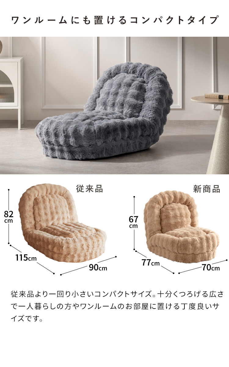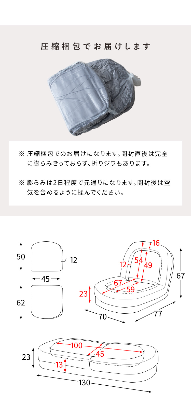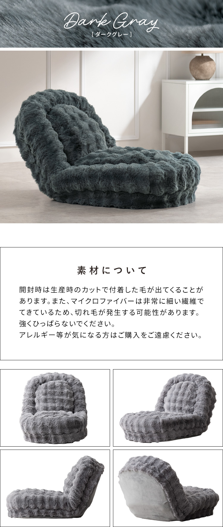 | ソファーベッド ふわとろソファベッド Foure(フール) コンパクトサイズ 座椅子・ソファ・ベッドの3wayで一日中過ごせる巣ごもりふわとろソファベッド。マイクロファイバー生地とふかふかクッションがあなたを癒してくれます。 ■ゆったり座れる広々サイズの座椅子スタイル 男性でもゆとりのある広々サイズの座面で、ゆったりとくつろげる座椅子スタイル。背もたれと座面のクッションは取り外しも可能。 ■お昼寝にも使えるコンパクトなベッドスタイル リクライニングを倒せば全長130cmのベッドスタイルに。クッションを抱き枕にしたり外したり、お好みの姿勢で寝転がれます。 ■クッションを背もたれにしたローソファスタイル リクライニングを倒してクッションを壁側に立てれば可愛いローソファスタイルに変身。二人でもゆとりをもってお座りいただけます。 ■ワンルームにも置けるコンパクトタイプ 従来品より一回り小さいコンパクトサイズ。十分くつろげる広さで一人暮らしの方やワンルームのお部屋に置ける丁度いいサイズです。 ■マイクロファイバー生地のふわとろな触り心地 サラサラの長い毛足がぽこぽこでここ凹のある可愛い仕上がりで極上の手触りになっております。 ■ポケットコイルを使用した快適な座り心地のこだわり構造 座面にはポケットコイル入り。背もたれにはウレタンとチップウレタンの二層構造。本体の周りとクッションは綿がたっぷりで癒されます。 ■お好みの角度に調節できる18段階リクライニング機能付き。安心の日本製フリーロックギアで省スペースに角度に調節できます。 ■カバーが上下に分かれており、身体に触れる上部は取り外して手洗い洗濯が可能です。 ※開封時は生産時のカットで付着した毛が出てくることがあります。予めご了承ください。 ※細い繊維で出来ているため、切れ毛が発生する可能性があります。強く引っ張らないでください。 ※アレルギーなどが気になる方はご購入をご遠慮ください。 ※圧縮梱包でのお届けになります。開封直後は完全に膨らみきっておらず、折りジワもあります。 ※膨らみは2日程度で元通りになります。開封後は空気を含めるように揉んでください。 ※画面上のカラーはご使用ブラウザやモニターの設定により、実物とは若干異なる場合がございます。あらかじめご了承の上、ご注文をお願いいたします。 | |