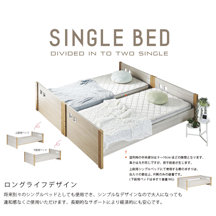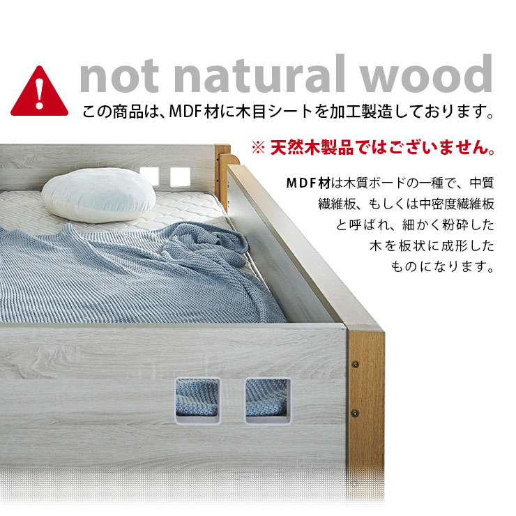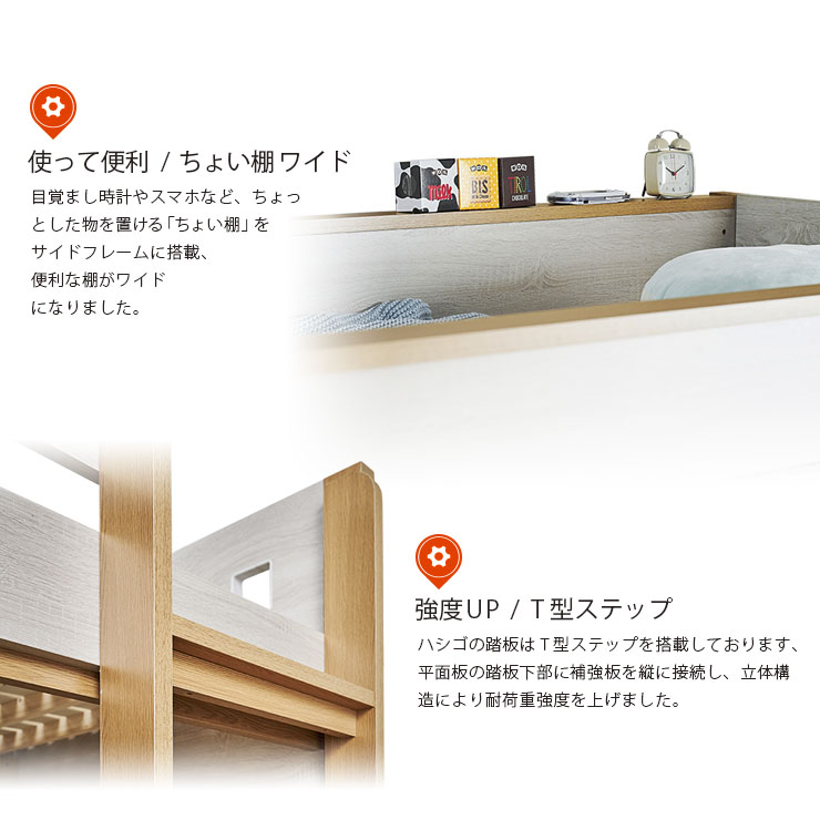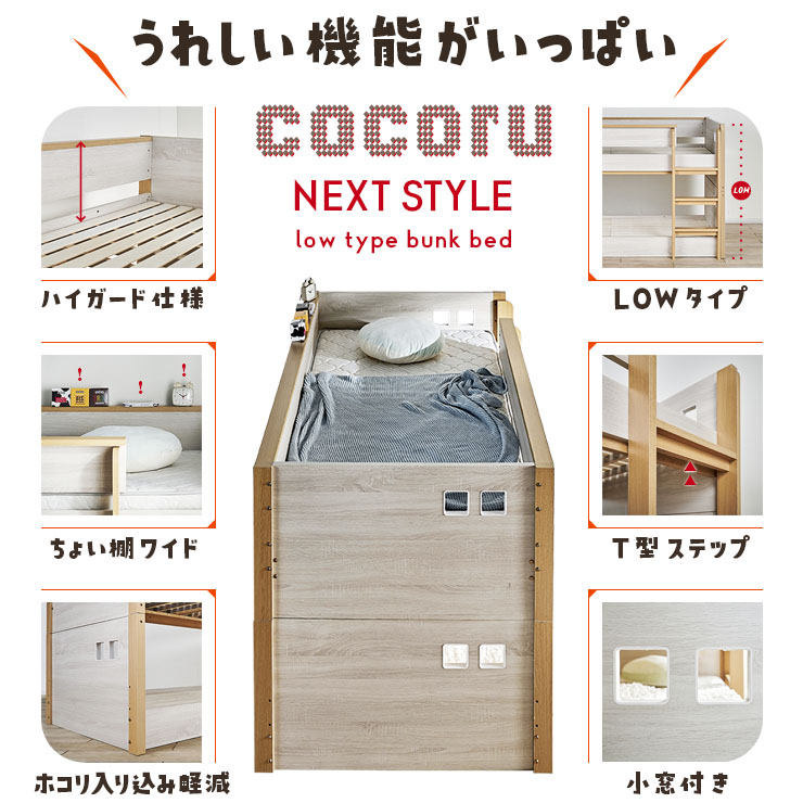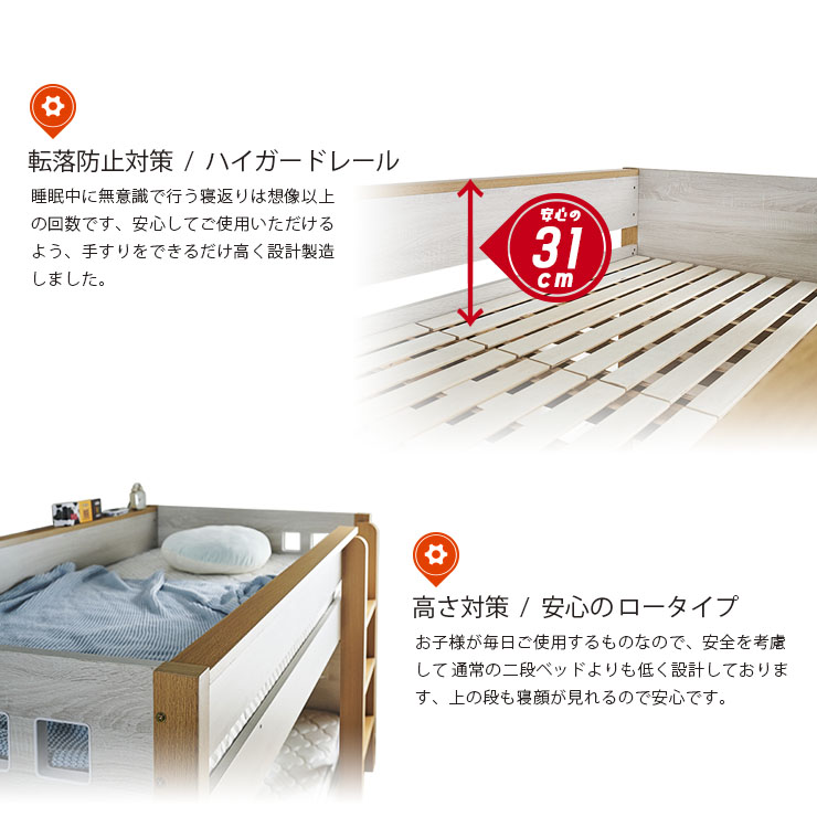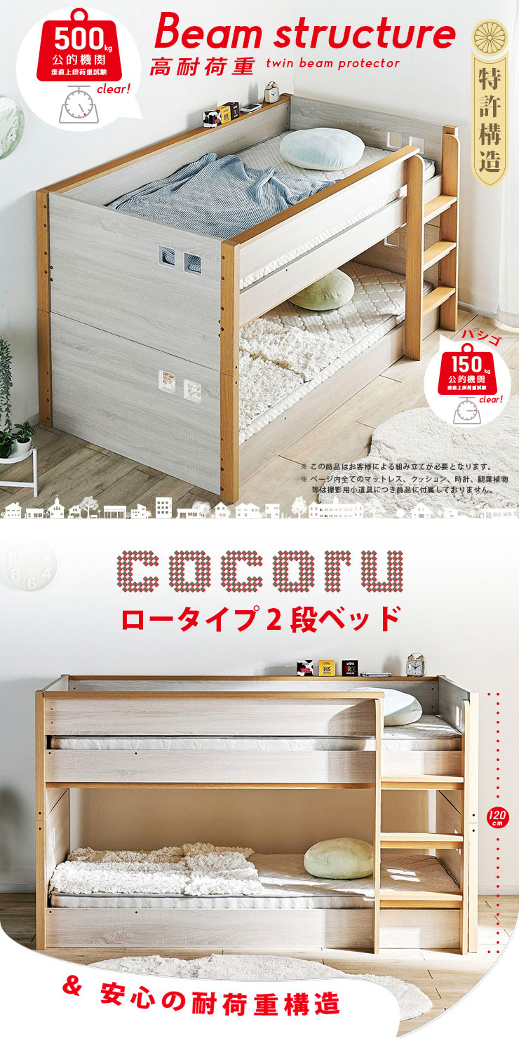 | ロータイプ2段ベッドcocoru(ココル) ■特許登録 耐荷重構造 ツインビームプロテクター搭載 ■500kg垂直耐荷重試験clear ■転倒防止対策/ハイガードレール 安心の31cm。手すりをできるだけ高く設計製造しました。 ■高さ対策/安心のロータイプ お子さまが毎日ご使用するものなので、安全を考慮して通常の二段ベッドよりも低く設計しております、上の段も寝顔が見れるので安心です。 ■使って便利/ちょい棚ワイド 目覚まし時計やスマホなど、ちょっとした物を置ける「ちょい棚」をサイドフレームに搭載、便利な棚がワイドになりました。 ■強度アップ/T型ステップ ハシゴの踏板はT型ステップを搭載しております。平面板の踏板下部に補強板を板に接続し、立体構造により耐荷重強度を上げました。 ■ほこり対策/入り込み軽減 ほこりが入り込みにくいフォルムへと到達しました。 ■小さなお家/小窓付き スタイリッシュハウスをイメージとし、「小窓」を二段ベッドへ取り込んだデザインで、お家の中にある小さな私だけのお家が完成しました。 ■ロングライフデザイン 将来別々のシングルベッドとしても使用でき、シンプルなデザインなので大人になっても違和感なくご使用いただけます。 ※こちらの商品はお客様組み立てとなります。 ※この商品は、MDF材に木目シートを加工製造しております。天然木製品ではございません。 ※並列時の中央部分は9~10cmほどの隙間となります。高さは同じですが、若干段差が生じます。 ※上段用シングルベッドにて使用する際の手すりは、出入りの都合上、片側のみの装着です。(下段用ベッドは手すり装着NG) ※ダメージ加工のような柄(木目に対し縦に擦ったような白筋模様)はシートのデザインにつき、これらを理由とした交換や返品は行っておりませんので、予めご了承ください。 ※組み立て方や若干の個体差によって、表記サイズと完成形のサイズに多少の誤差が生じる場合がございます。 ※こちらはベッド本体のみの販売です。マットレスや寝具は付属しておりません。 | |