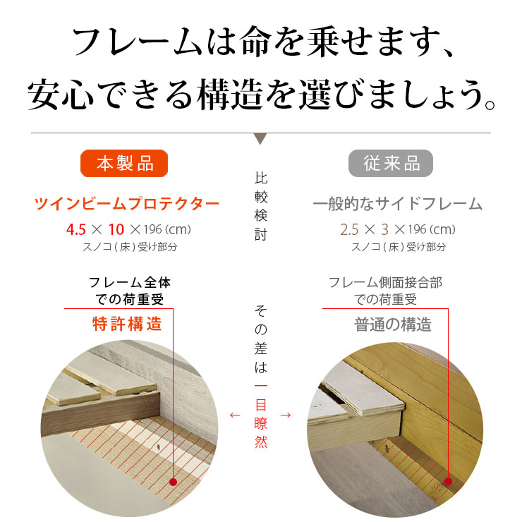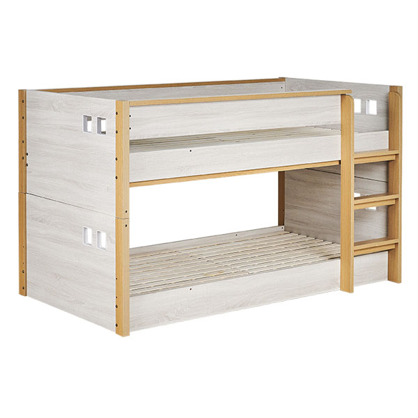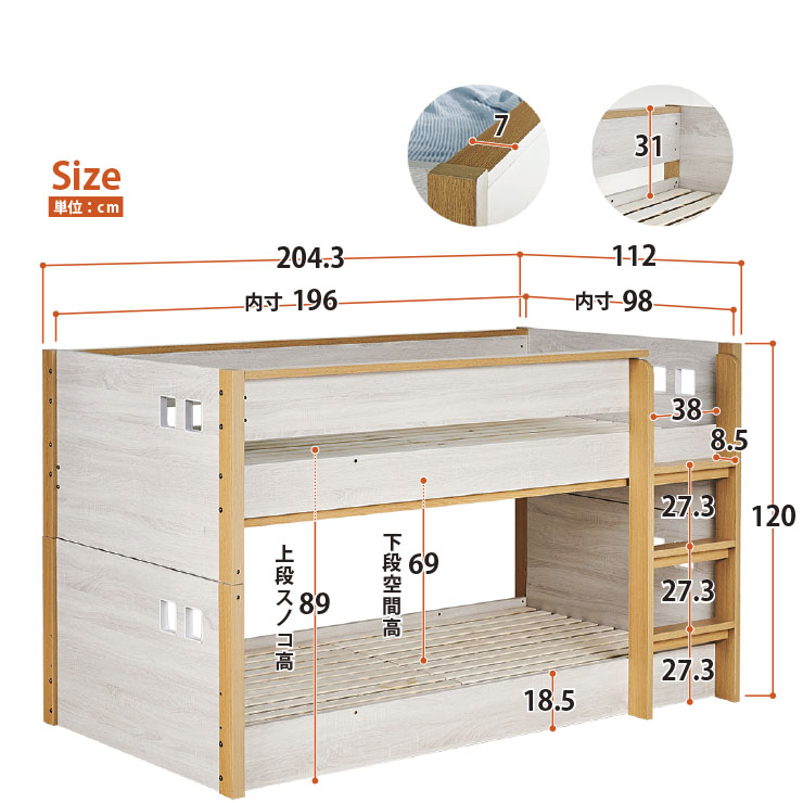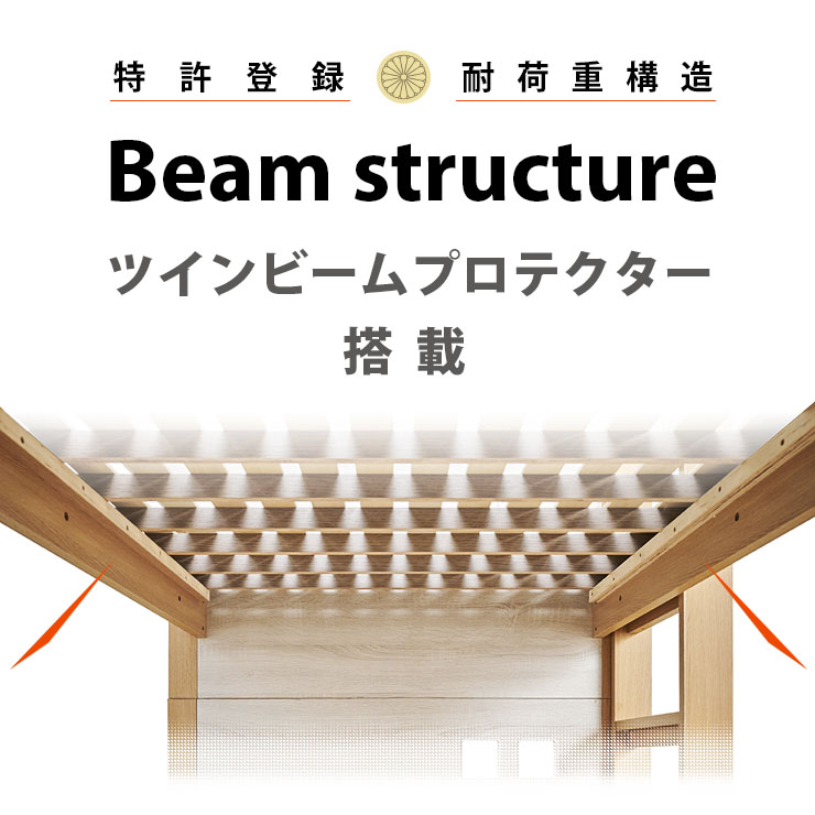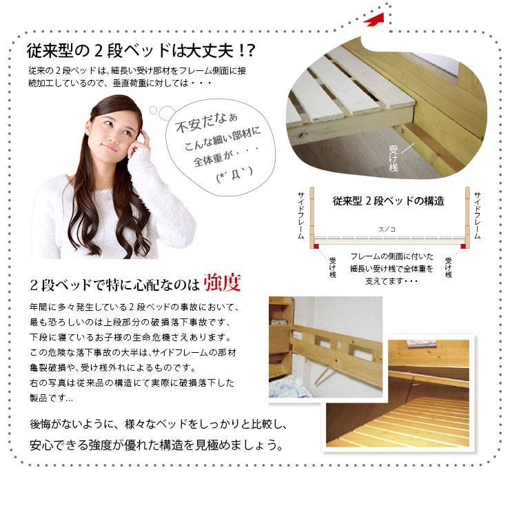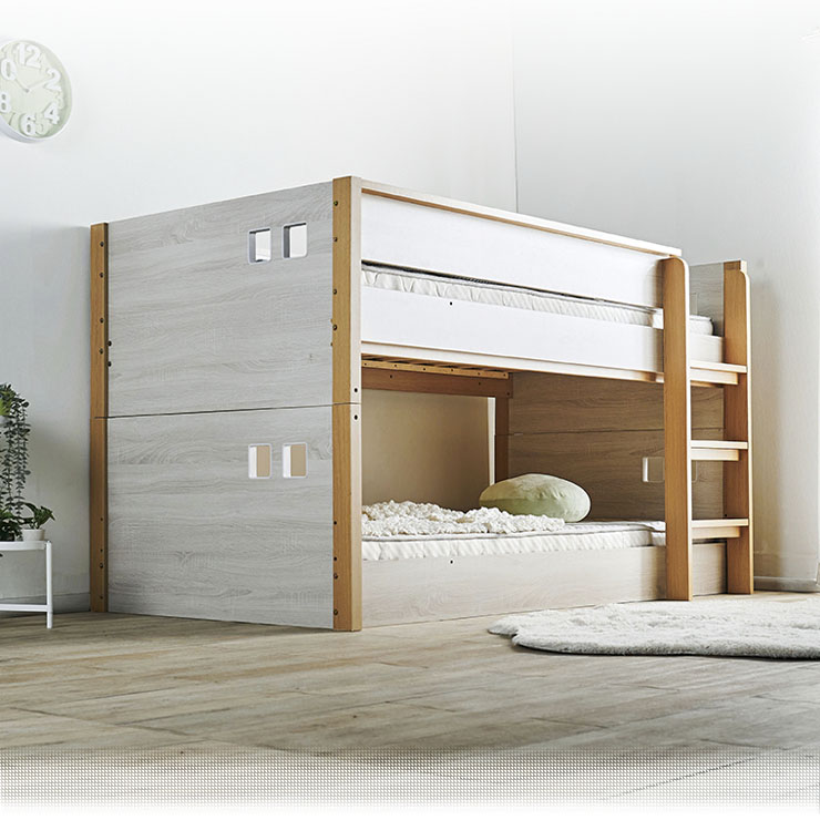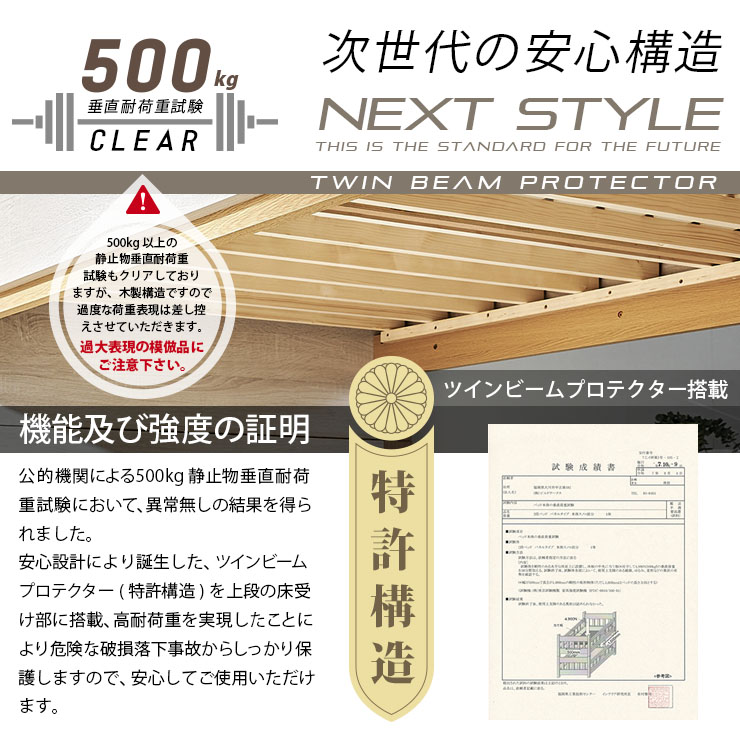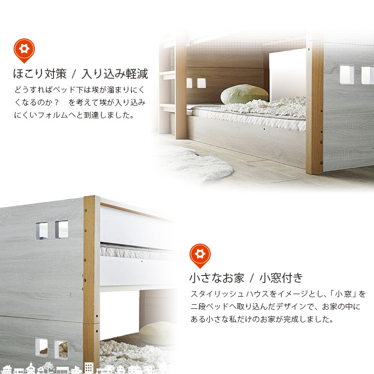 | ロータイプ2段ベッドcocoru(ココル) ■特許登録 耐荷重構造 ツインビームプロテクター搭載 ■500kg垂直耐荷重試験clear ■転倒防止対策/ハイガードレール 安心の31cm。手すりをできるだけ高く設計製造しました。 ■高さ対策/安心のロータイプ お子さまが毎日ご使用するものなので、安全を考慮して通常の二段ベッドよりも低く設計しております、上の段も寝顔が見れるので安心です。 ■使って便利/ちょい棚ワイド 目覚まし時計やスマホなど、ちょっとした物を置ける「ちょい棚」をサイドフレームに搭載、便利な棚がワイドになりました。 ■強度アップ/T型ステップ ハシゴの踏板はT型ステップを搭載しております。平面板の踏板下部に補強板を板に接続し、立体構造により耐荷重強度を上げました。 ■ほこり対策/入り込み軽減 ほこりが入り込みにくいフォルムへと到達しました。 ■小さなお家/小窓付き スタイリッシュハウスをイメージとし、「小窓」を二段ベッドへ取り込んだデザインで、お家の中にある小さな私だけのお家が完成しました。 ■ロングライフデザイン 将来別々のシングルベッドとしても使用でき、シンプルなデザインなので大人になっても違和感なくご使用いただけます。 ※こちらの商品はお客様組み立てとなります。 ※この商品は、MDF材に木目シートを加工製造しております。天然木製品ではございません。 ※並列時の中央部分は9~10cmほどの隙間となります。高さは同じですが、若干段差が生じます。 ※上段用シングルベッドにて使用する際の手すりは、出入りの都合上、片側のみの装着です。(下段用ベッドは手すり装着NG) ※ダメージ加工のような柄(木目に対し縦に擦ったような白筋模様)はシートのデザインにつき、これらを理由とした交換や返品は行っておりませんので、予めご了承ください。 ※組み立て方や若干の個体差によって、表記サイズと完成形のサイズに多少の誤差が生じる場合がございます。 ※こちらはベッド本体のみの販売です。マットレスや寝具は付属しておりません。 | |