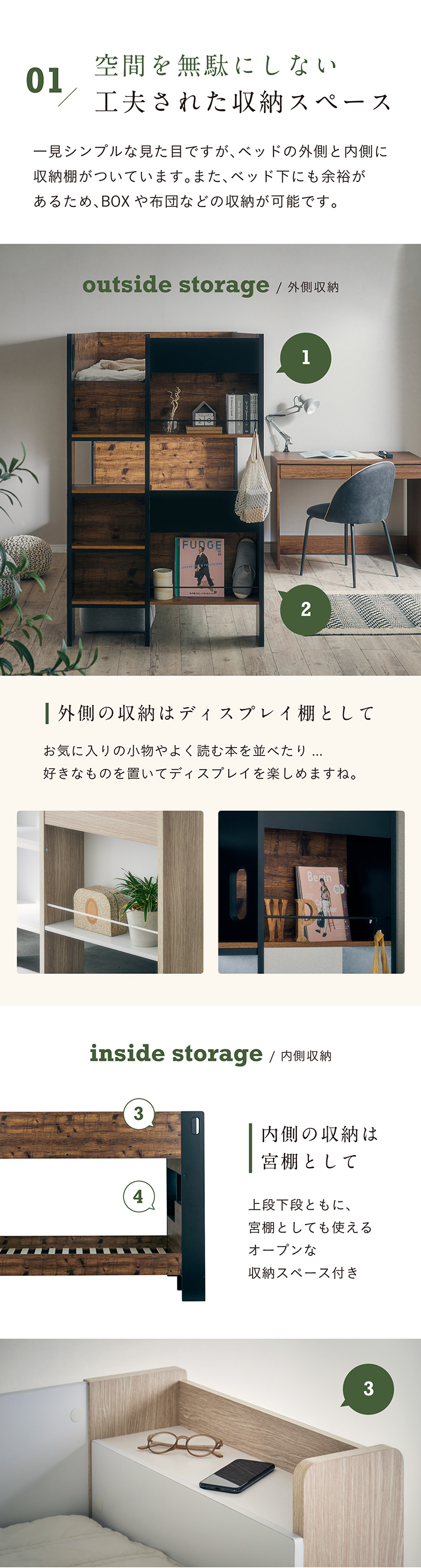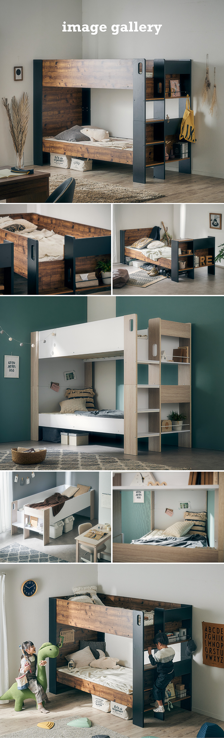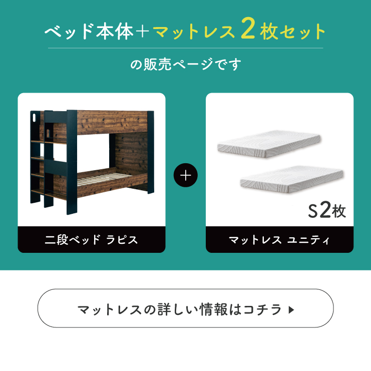 | 2段ベッド 宮付き Lapis(ラピス)+Unity(ユニティ) 飽きのこないシンプルデサインの2段べッドLapiso。分割可能なのでシングルべッドx2台にもなります。コーディネートによって幅広い年齢の方々にお使いいただけます。 ■空間を無駄にしない工夫された収納スペース 外側はディスプレイ棚としてお使いいただける収納棚。内側は、上段下段ともに宮棚としても使える収納スペース付き。べッド下は高めの設計のため、収納スペースとしてお使いいただけます。 ■省スペースで安定性もある。一体型の垂直はしご お子さまでも上り下りしやすい手すり付き。幅を広くとったステップの裏側には2本の補強フレームを取り付け、安全性の高いはしごにしました。 ■シングルべッドとしても使えるロングライフ設計 分割してシングルべッドとしてもお使いいただけます。2台を並べて使用したり、別々のお部屋で使用したり、ライフスタイルやお子さまの成長に合わせて使えるべッドです。 ■安心して使用できる設計 落下防止のために、サイドフレームの高さを十分にとりました。寝返りをうっても落ちる心配がありません。 ※こちらの商品はお客様組み立てとなります。 ※はしごの位置を入れ替えることはできませんのでご注意ください。 ※ベッド本体+マットレス2枚セットの販売となります。 ※詳細ページの注意事項を必ずご確認ください。 ※組み立て方や若干の個体差によって、表記サイズと完成形のサイズに多少の誤差が生じる場合がございます。 | |