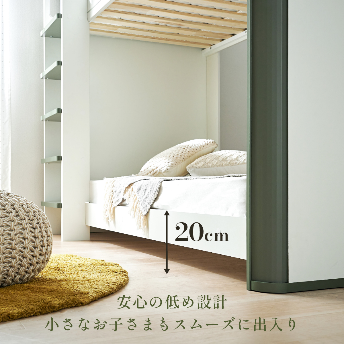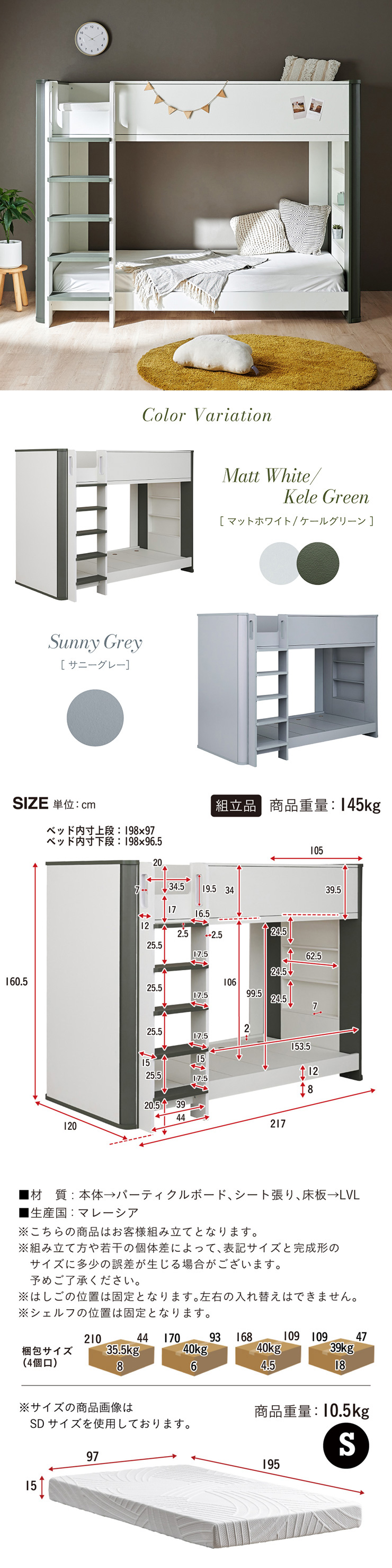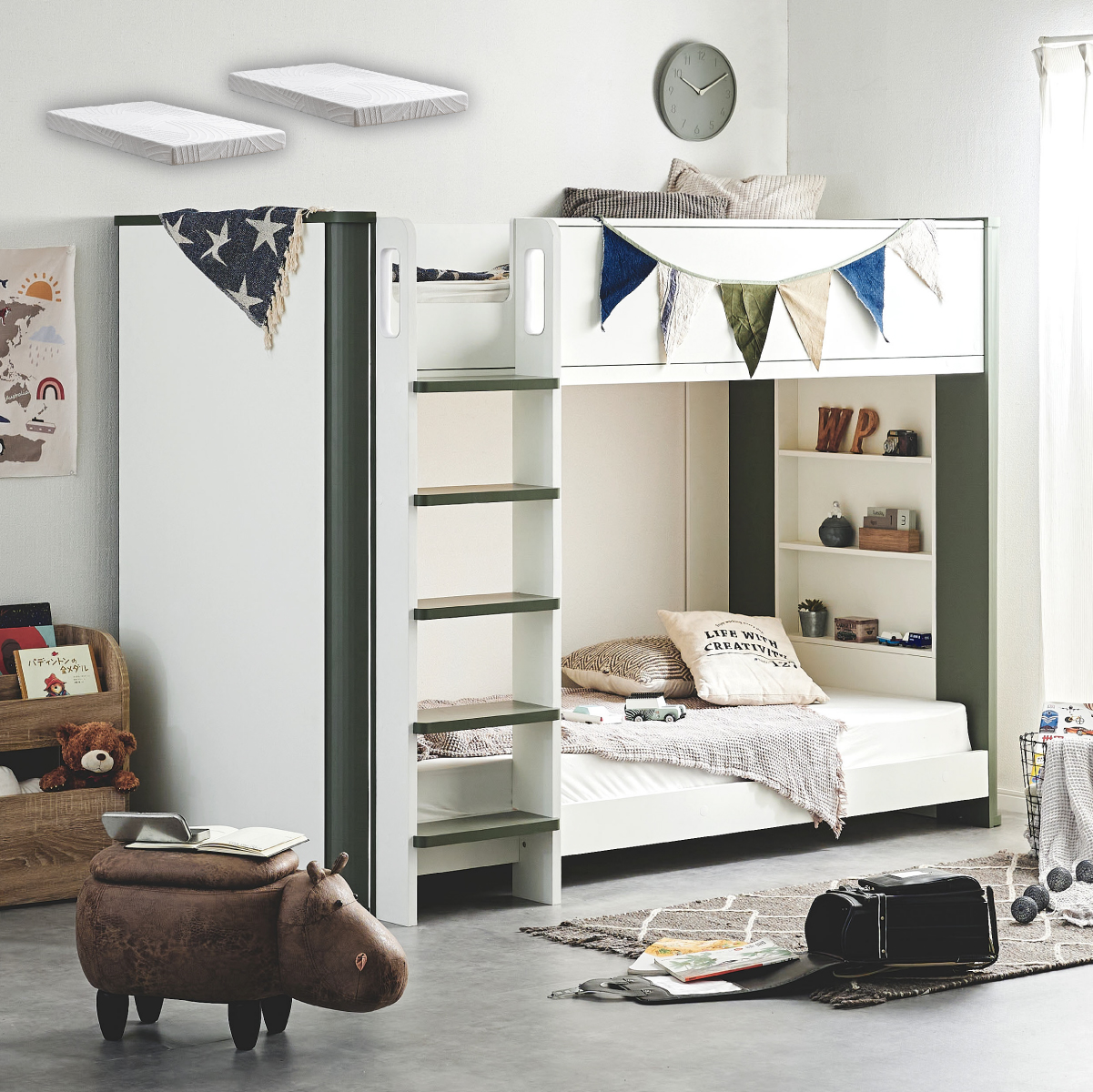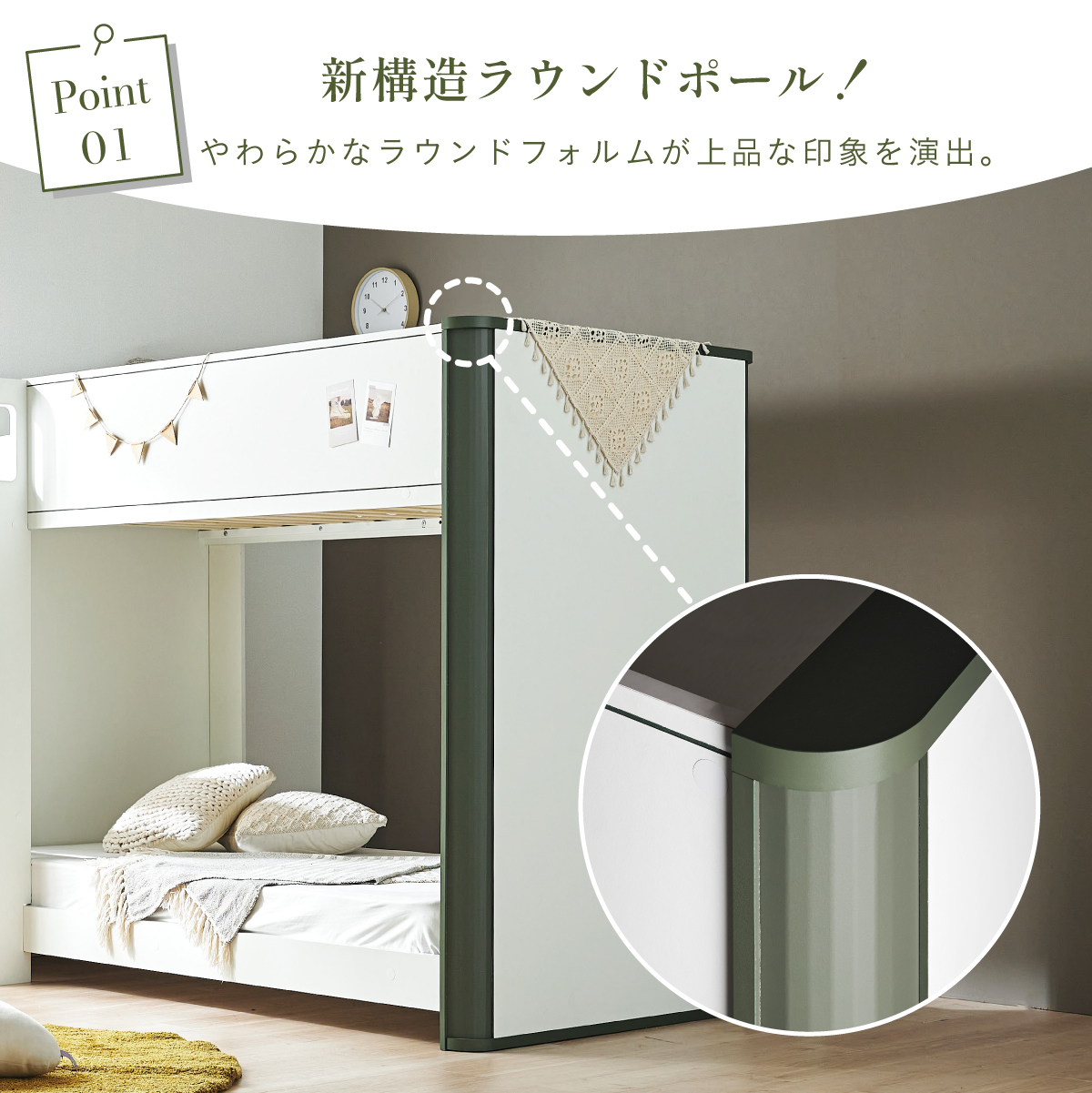 | 上質デザインで、大人も快適に。 スタイリッシュ二段ベッド Bysshe(ビッシュ)+Unity(ユニティ) 成長してもずっと快適 子どもから大人まで使える万能設計! ■新構造ラウンドポール! やわらかなラウンドフォルムが上品な印象を演出。 ■見せて飾れる3段シェルフ お気に入りを並べて、毎日がちょっと楽しくなる自分空間に。 ※シェルフの位置は固定となります。 ■広々下段でリラックス。大人もくつろげる快適空間。 ※マットレスの高さは含みません。 空間高しっかり確保 広々くつろぎ設計 安心の低め設計 小さなお子さまもスムーズに出入り ■頑丈構造&安心のLVLボード採用 高さのあるサイドフレームで、お子さまの安全をしっかりサポート ■通気性抜群、清潔に保つ床板仕様 下段床板の下には補強板を配置し、安定感と耐久性を高めました。 ■スマート設計。省スペースな垂直はしご ※はしごの位置は固定とあります。左右の入れ替えはできません。 やさしい角丸加工 ネジ穴隠しシール付き ※こちらの商品はお客様組み立てとなります。 ※組み立て方や若干の個体差によって、表記サイズと完成形のサイズに多少の誤差が生じる場合がございます。あらかじめご了承下さい。 ※ベッド本体+マットレス2枚セットの販売となります。 ※はしごの位置は固定となります。左右の入れ替えはできません。 ※シェルフの位置は固定となります。 | |