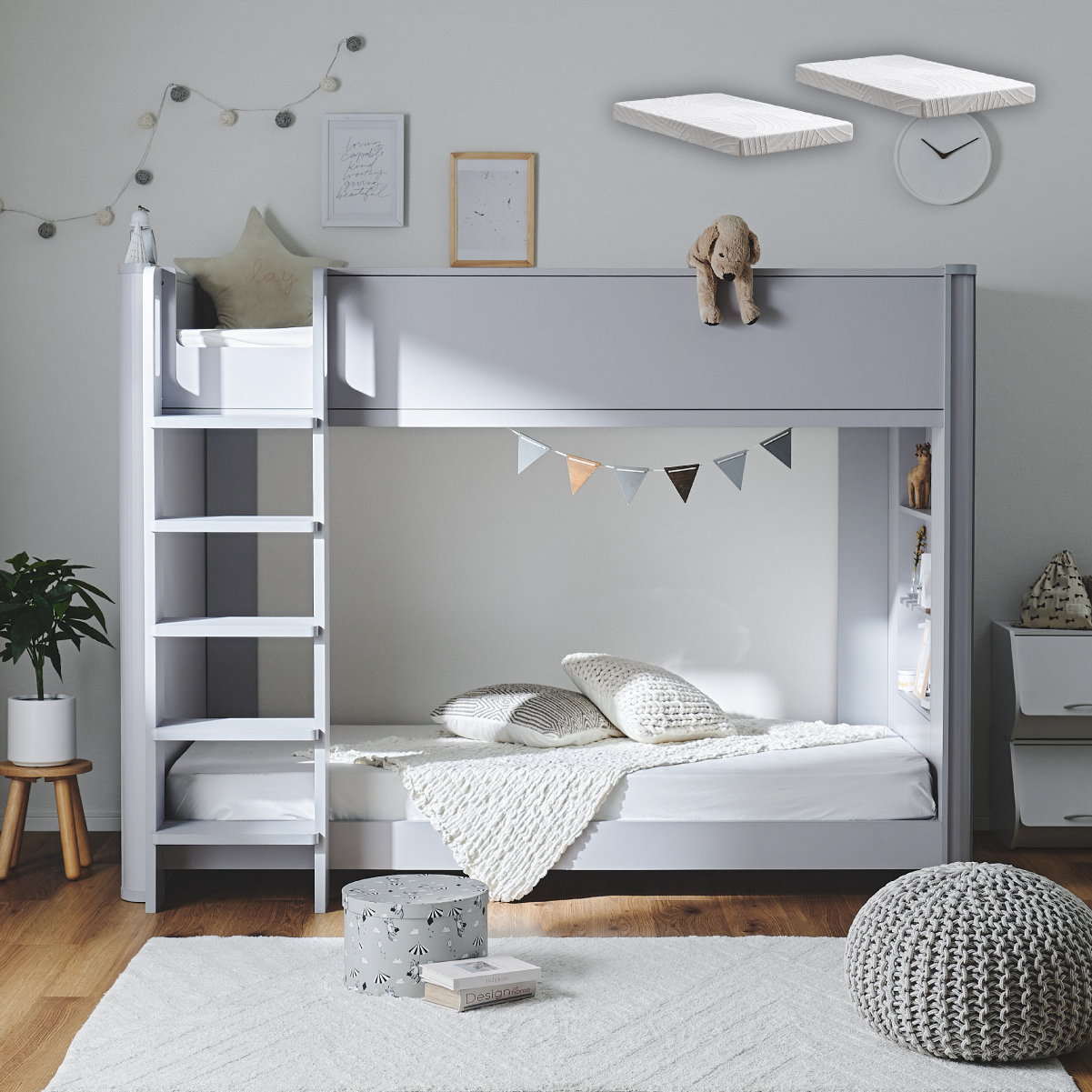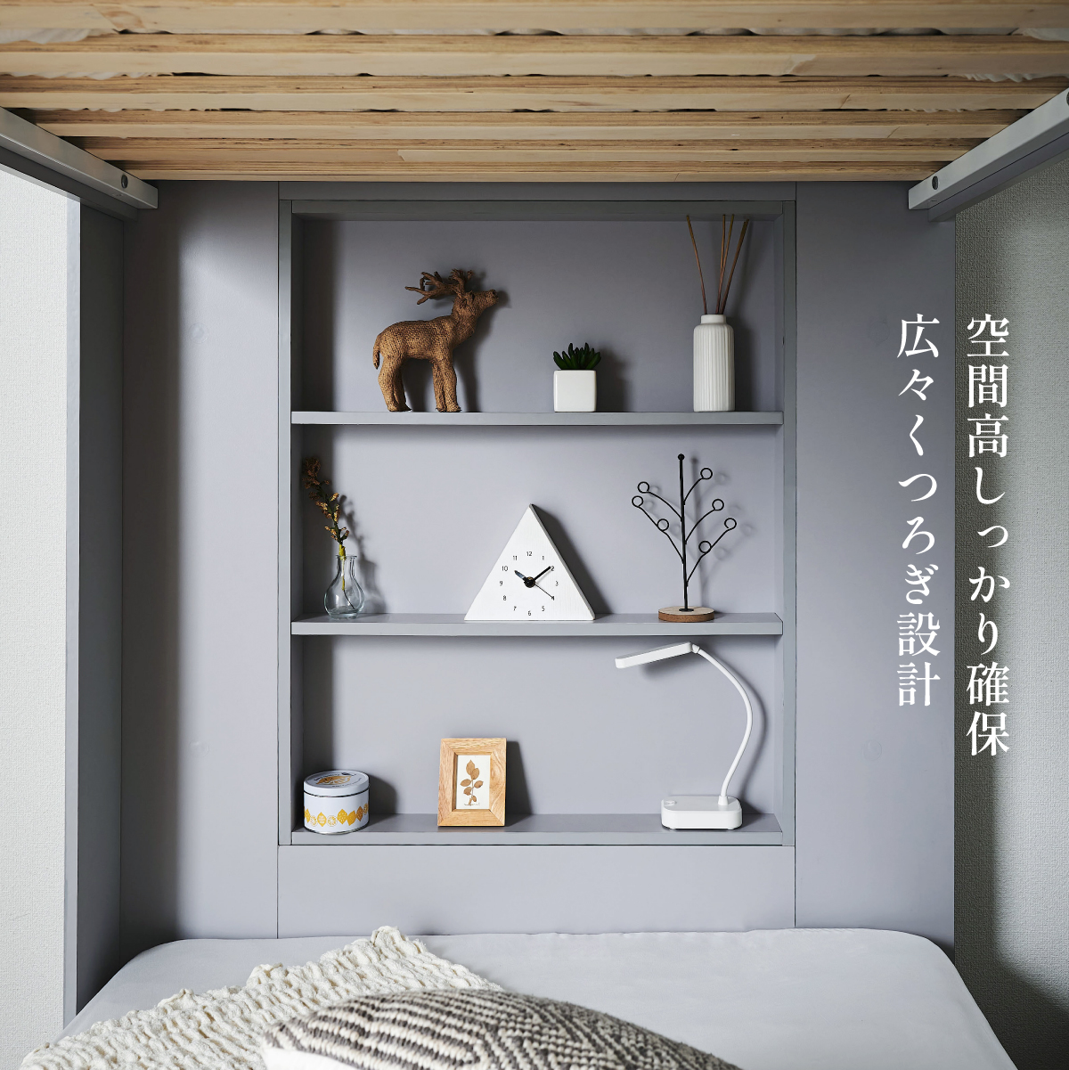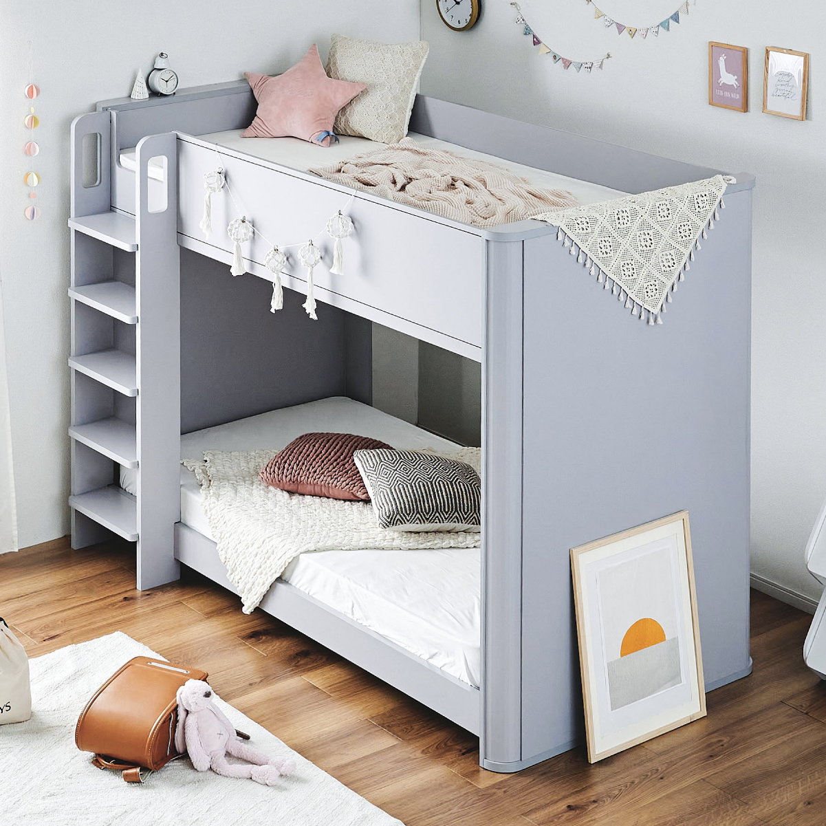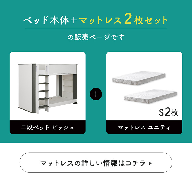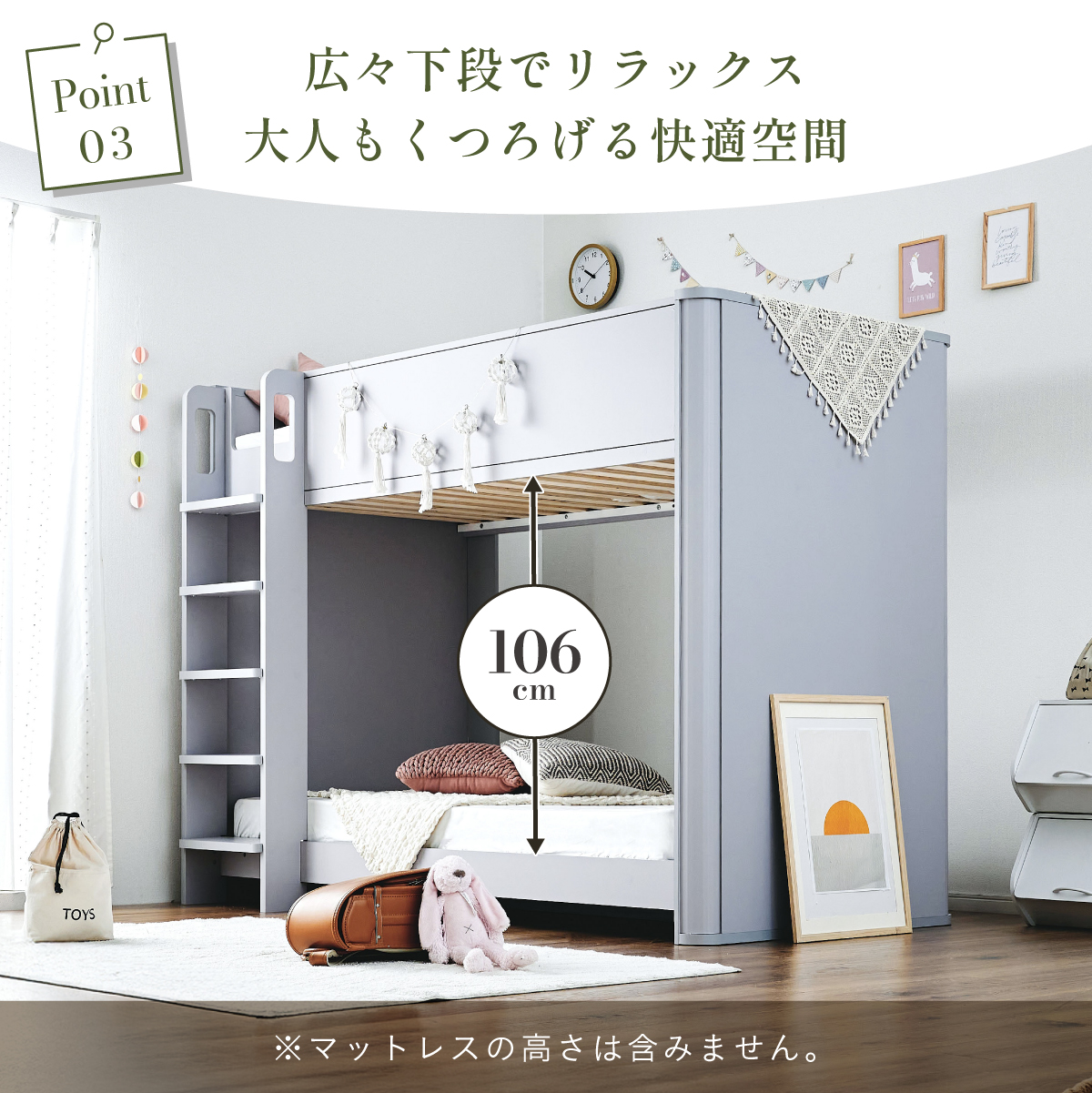 | 上質デザインで、大人も快適に。 スタイリッシュ二段ベッド Bysshe(ビッシュ)+Unity(ユニティ) 成長してもずっと快適 子どもから大人まで使える万能設計! ■新構造ラウンドポール! やわらかなラウンドフォルムが上品な印象を演出。 ■見せて飾れる3段シェルフ お気に入りを並べて、毎日がちょっと楽しくなる自分空間に。 ※シェルフの位置は固定となります。 ■広々下段でリラックス。大人もくつろげる快適空間。 ※マットレスの高さは含みません。 空間高しっかり確保 広々くつろぎ設計 安心の低め設計 小さなお子さまもスムーズに出入り ■頑丈構造&安心のLVLボード採用 高さのあるサイドフレームで、お子さまの安全をしっかりサポート ■通気性抜群、清潔に保つ床板仕様 下段床板の下には補強板を配置し、安定感と耐久性を高めました。 ■スマート設計。省スペースな垂直はしご ※はしごの位置は固定とあります。左右の入れ替えはできません。 やさしい角丸加工 ネジ穴隠しシール付き ※こちらの商品はお客様組み立てとなります。 ※組み立て方や若干の個体差によって、表記サイズと完成形のサイズに多少の誤差が生じる場合がございます。あらかじめご了承下さい。 ※ベッド本体+マットレス2枚セットの販売となります。 ※はしごの位置は固定となります。左右の入れ替えはできません。 ※シェルフの位置は固定となります。 | |
