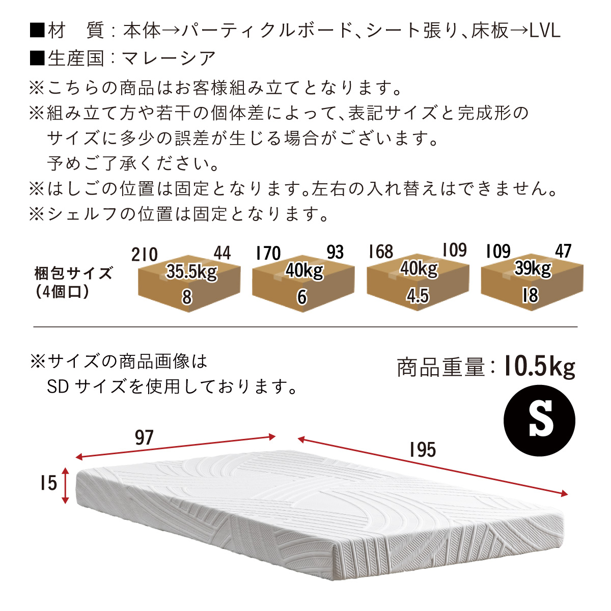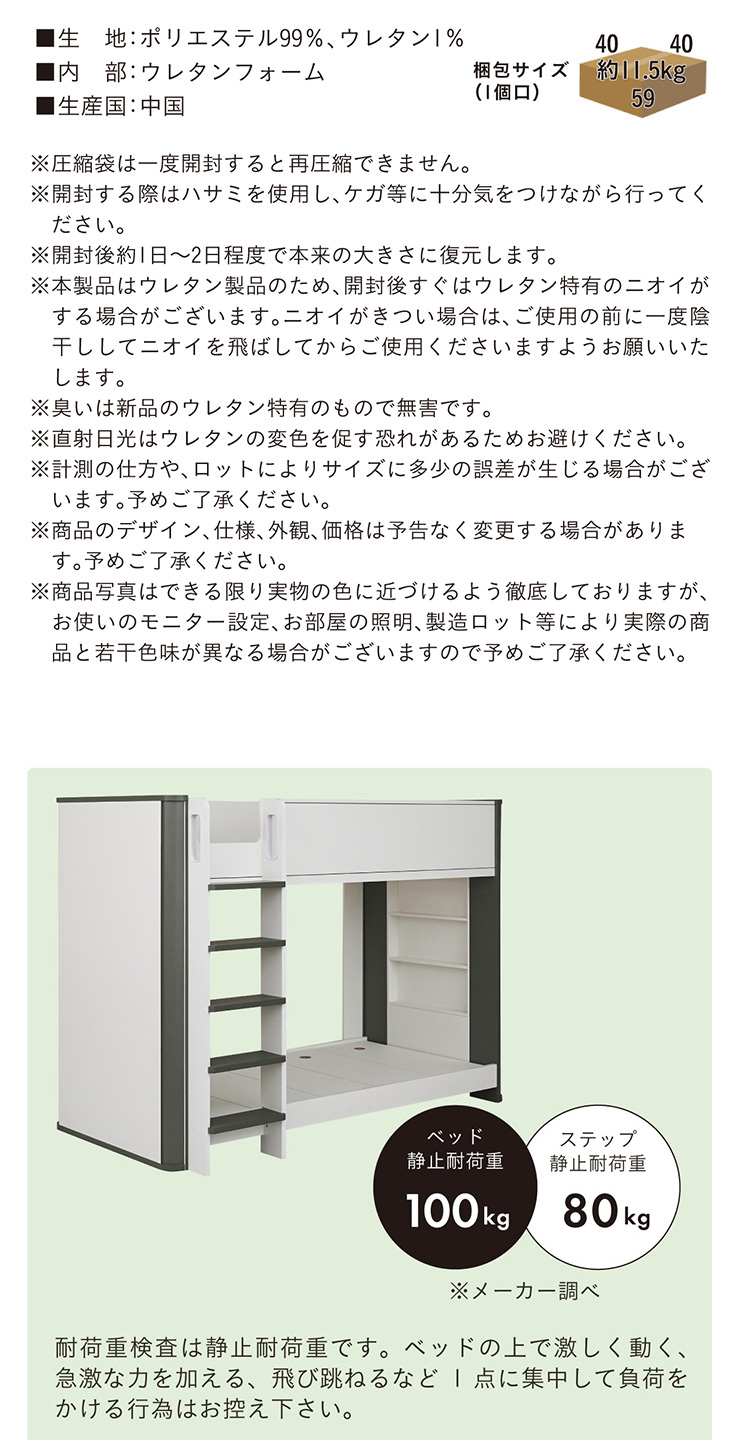 | 材質・素材 | 本体:ペーティクルボード・シート貼り 床板:LVL マットレス生地:ポリエステル99%・ウレタン1% 内部:ウレタンフォーム |