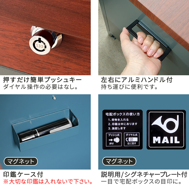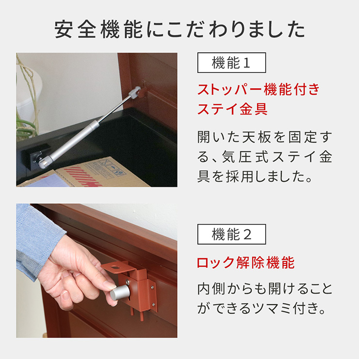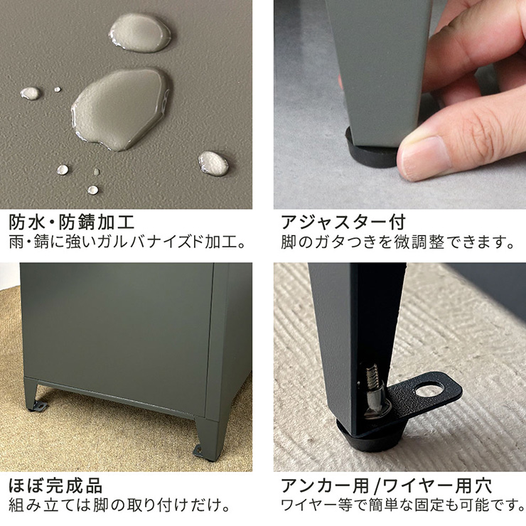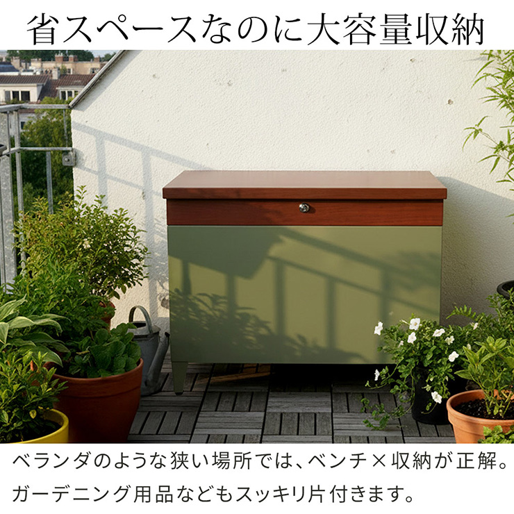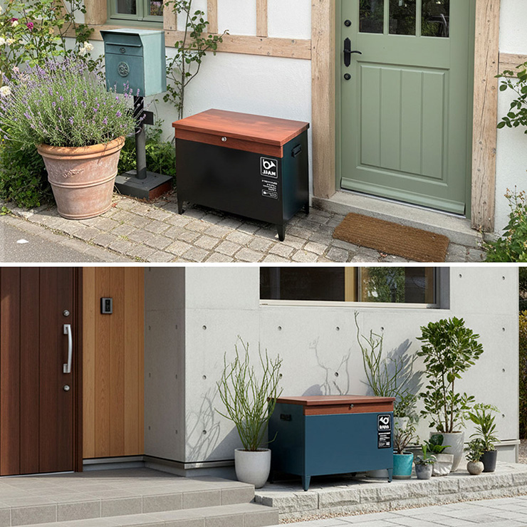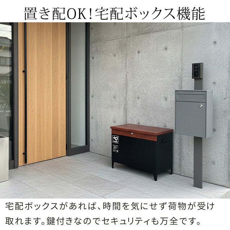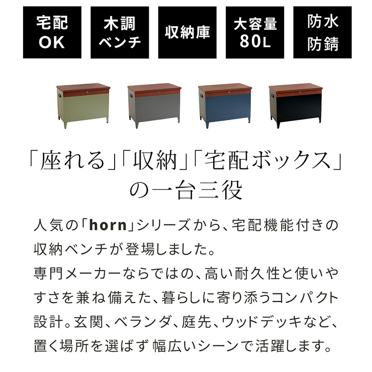 | 宅配機能付き 収納ベンチ horn(ホルン) 「座れる」「収納」「宅配ボックス」の一台三役 人気の「horn」シリーズから、宅配機能付きの収納ベンチが登場しました。 専門メーカーならではの、高い耐久性と使いやすさを兼ね備えた、暮らしに寄り添うコンパクト設計。 玄関、ベランダ、庭先、ウッドデッキなど、置く場所を選ばず幅広いシーンで活躍します。 ■置き配OK!宅配ボックス機能 宅配ボックスがあれば、時間を気にせず荷物が受け取れます。 鍵付きなのでセキュリティも万全です。 美しい木目調の座面xブルックリン風のタフで無骨なアイアン。 ただそこにあるだけで、洗練された雰囲気に。 ■一息つけるベンチとして 靴を履く時や、一息つきたい時、荷物を置きたい時など、様々なシーンの休憩スペースとして。 ■省スペースなのに大容量収納 ベランダのような狭い場所では、ベンチ×収納が正解。 ガーデニング用品などもスッキリ片付きます。 ■コンパクトで置きやすいサイズ設計 ■大容量収納 約80L いろいろ収納できちゃいます! 灯油タンク・防災グッズ・園芸グッズ・おもちゃ・工具 etc… 2Lペットボトルx9本+2Lペットボトルx6本 灯油タンク18Lx2本+園芸用土 20L ■特徴 ・美しい木目調の座面 ・頑丈で耐久性に優れたスチール素材。粉体塗装を施すことで、傷や錆に強いのが特徴(傷や溶接部にサビが発生する場合があります) ・ストッパー機能付き気圧式ステイ金具と、指挟みを軽減するクッションダンパーを採用 ・内側からも開けられるツマミ付き ・押すだけで施錠できるプッシュキー ・左右にアルミハンドル付 ・印鑑ケース、説明用/シグネチャープレート付 ・防水・防錆加工 ・脚部アジャスター付、アンカー用/ワーヤー用穴あり ※入荷時期により、商品のデザイン・色合い・仕様が品質に差し支えない程度に予告なく変更される場合がございます。大きなデザインの変更はございませんが、ご注意ください。 ※生鮮食品、貴重品、現金などは入れないでください。 ※使用時の事故や盗難、破損、宅配ボックスに入れられた商品の品質劣化につきましては責任を負いかねます。 ※本体の上に耐荷重以上の重い物を載せたり、衝撃を加えないでください。 ※割れ物は入れないでください。 ※水平な場所に設置してください。 ※宅配ボックスでお子様が遊ばないようにご注意ください。閉じ込められると非常に危険です。 ※大雨や吹込みなどによる雨水の侵入があった場合、荷物が濡れる場合があります。なるべく雨のかからない場所へ設置をおすすめいたします。完全防水ではありませんのでご注意ください。 ※アンカーボルトで設置する場合、電動ドリルやドライバー、ハンマーなどの工具が必要となります。 | |