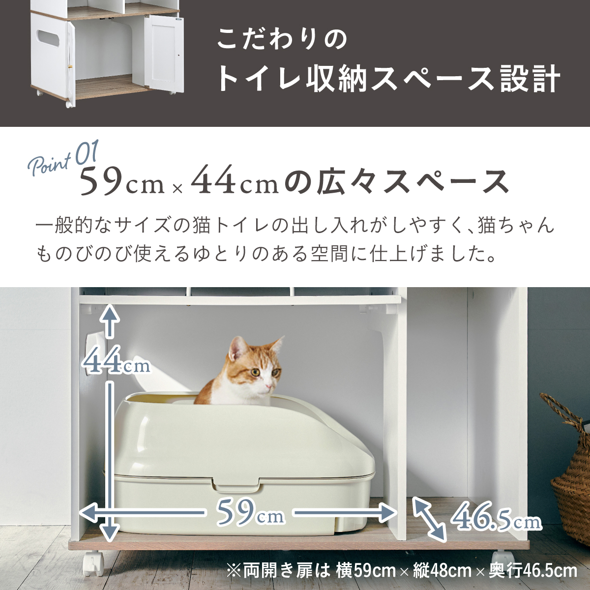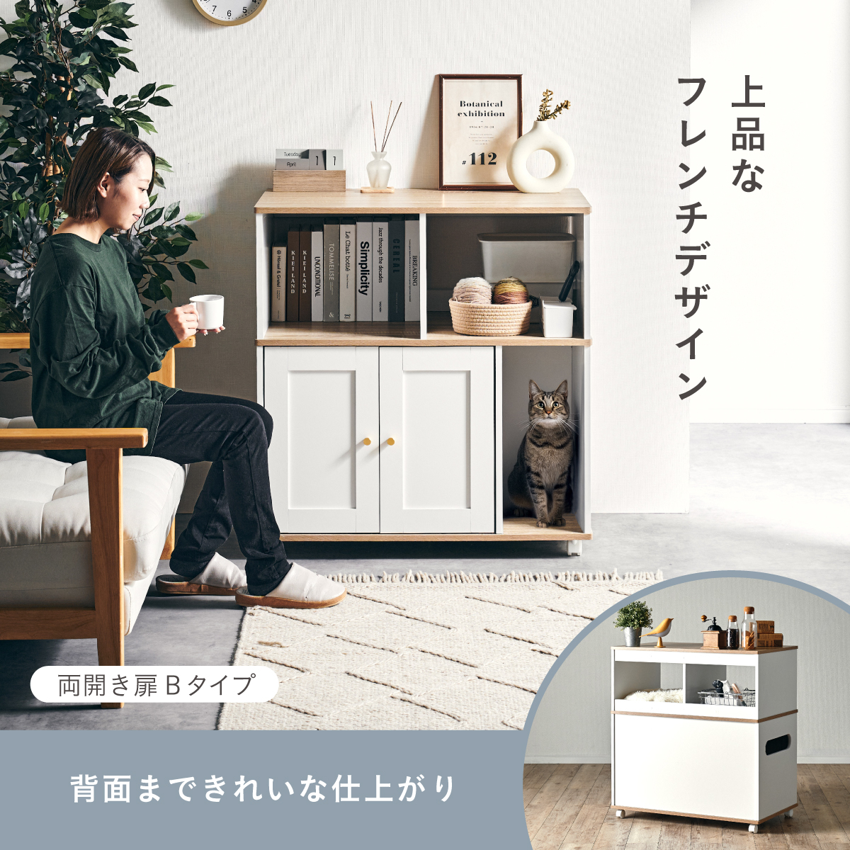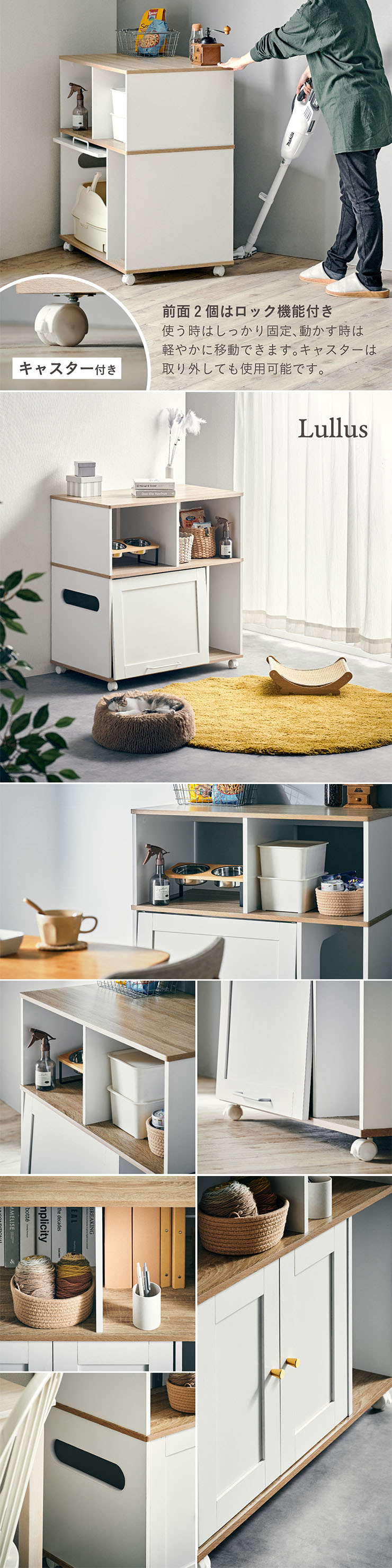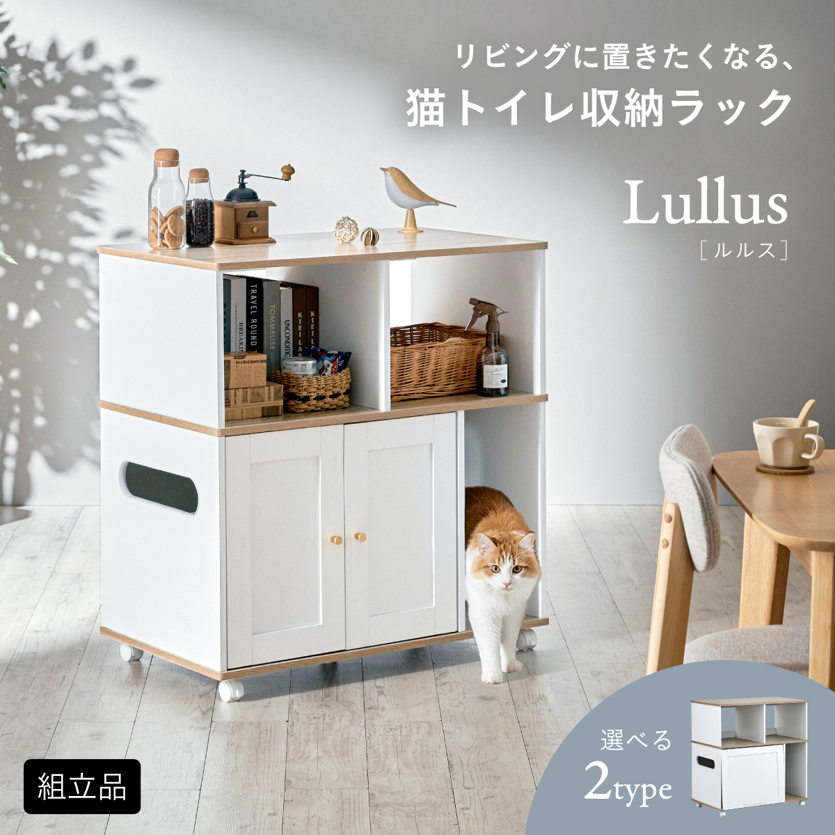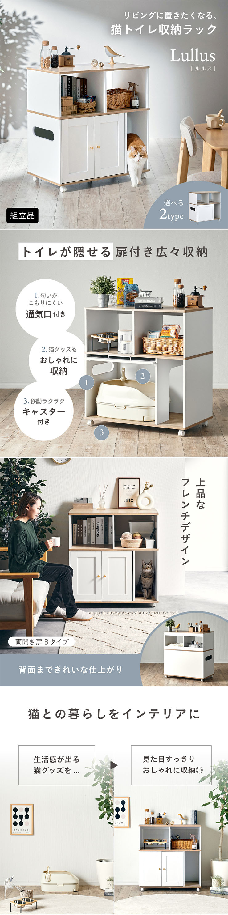 | リビングに置きたくなる 猫トイレ収納ラック Lullus(ルルス) トイレが隠せる 扉付き広々収納 ■フラップ扉Aタイプ ・上開きだから設置場所を選ばない ・片手でもラクラク開閉 ・開けたままでも見た目すっきり ■両開き扉Bタイプ ・猫が出入りしやすい広い入口設計 ・急な来客でも安心。インテリアに馴染む上品なデザイン ・前面フルオープンで掃除もラクラク ■こだわりのトイレ収納スペース設計 59x44cmの広々スペースで、一般的なサイズの猫トイレの出し入れがしやすく、猫ちゃんものびのび使えるゆとりのある空間に仕上げました。 ■通り抜け動線で、砂の飛び散りを軽減 猫がトイレスペース横の小部屋を通り抜けることで、足についた砂が自然と落ちるように設計しました。 ■ニオイがこもりにくく、いつでも快適 扉を閉めた状態でも匂いがこもりにくい通気口付き。ほどよい明るさもキープしてくれるので、トイレタイムも安心です。 ■日々のお手入れもラクラク どちらのタイプも扉を大きく開けられる設計で、トイレの掃除やスペースのお手入れがスムーズに行なえます。 ■2個のオープン収納スペースは、奥にものが落ちないこぼれ止め付き ■前面2個はロック機能付きのキャスター付き。キャスターは取り外しても使用可能です。 ※こちらの商品はお客様組み立てとなります。 ※組み立て方や若干の個体差によって、表記サイズと完成系のサイズに多少の誤差が生じる場合がございます。 ※リアルな木目調シートを採用しております。木目や節・傷に見えるダメージ加工・ヴィンテージ加工などは全てシートデザインとなります。これらを理由とした返品・交換は行っておりませんので、予めご了承ください。 | |