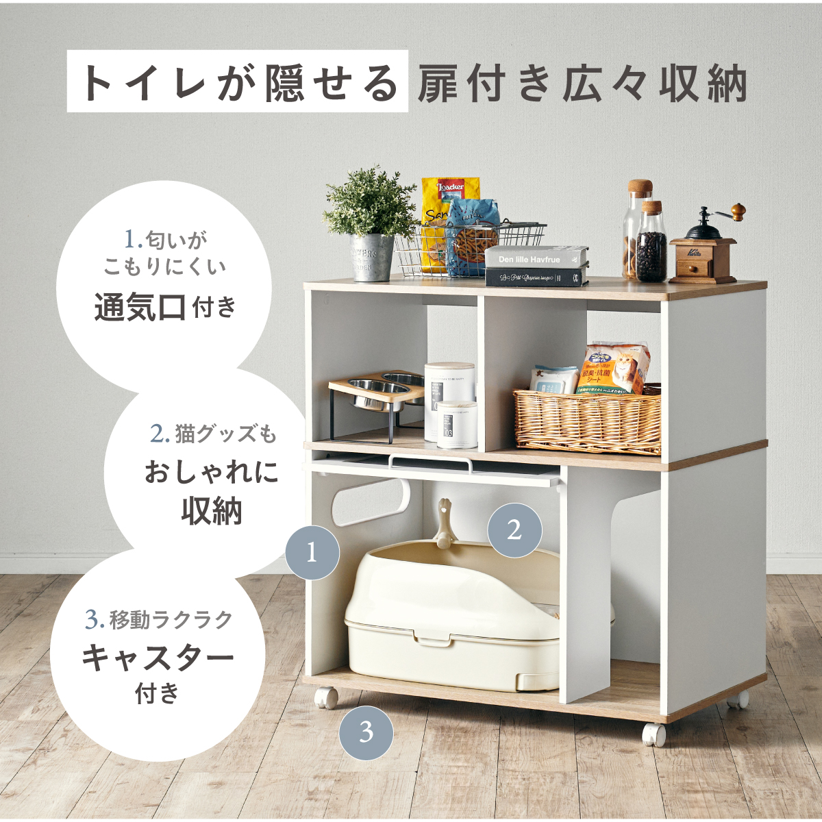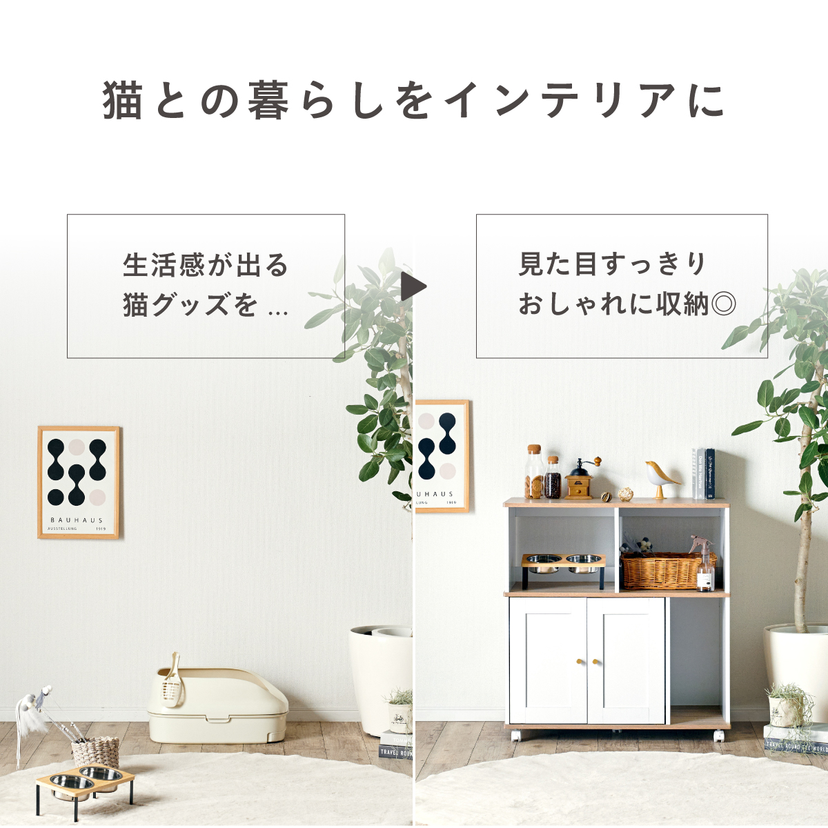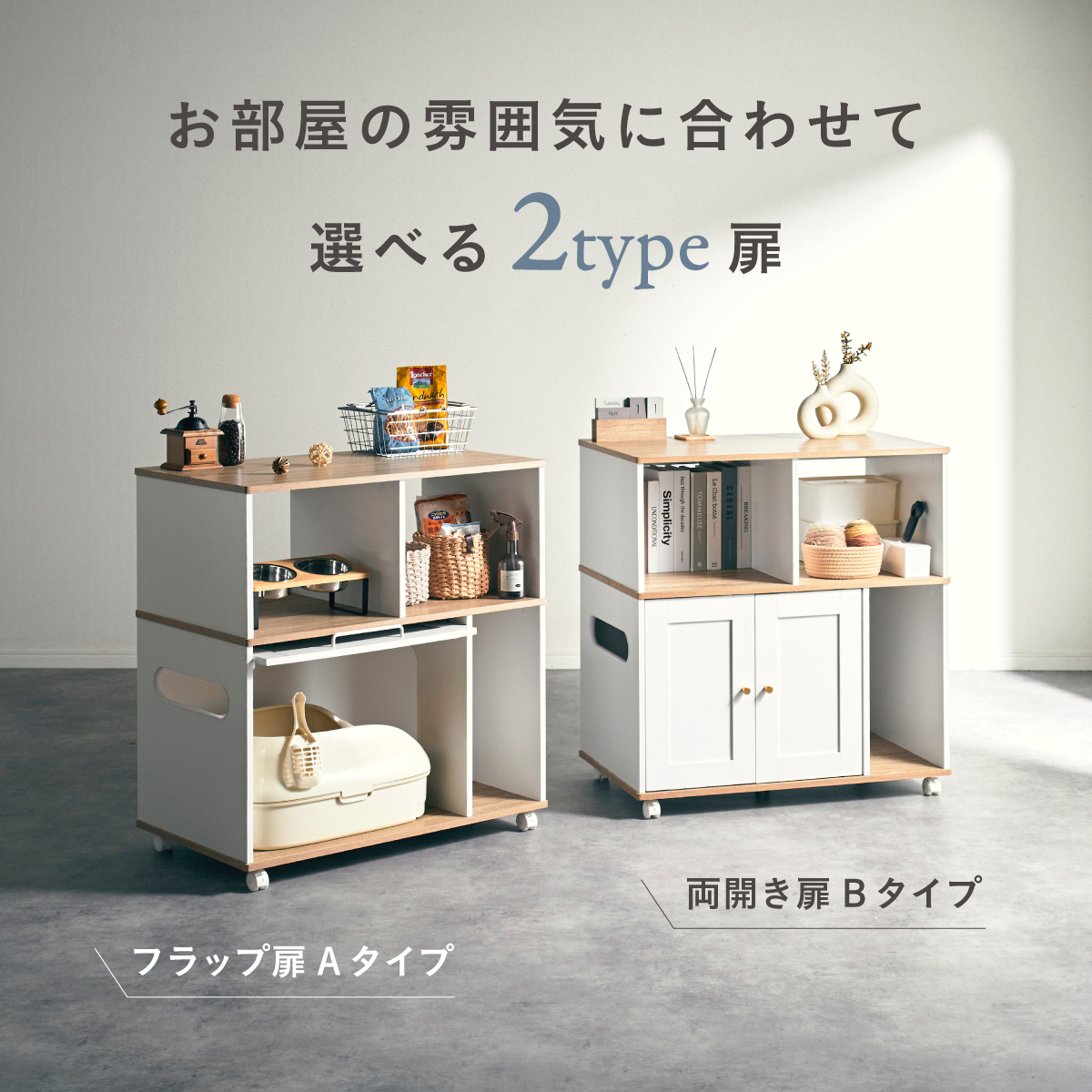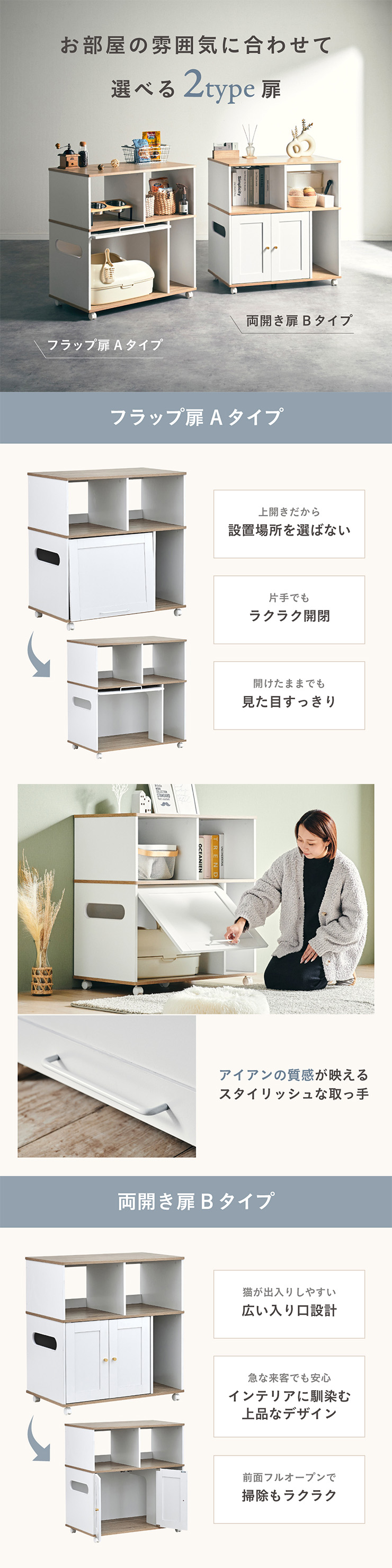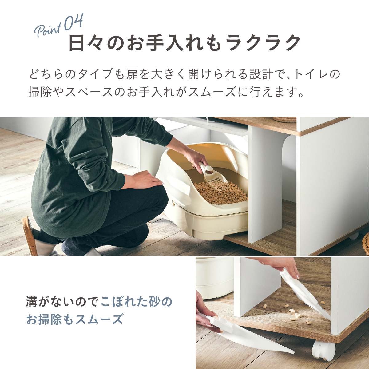 | リビングに置きたくなる 猫トイレ収納ラック Lullus(ルルス) トイレが隠せる 扉付き広々収納 ■フラップ扉Aタイプ ・上開きだから設置場所を選ばない ・片手でもラクラク開閉 ・開けたままでも見た目すっきり ■両開き扉Bタイプ ・猫が出入りしやすい広い入口設計 ・急な来客でも安心。インテリアに馴染む上品なデザイン ・前面フルオープンで掃除もラクラク ■こだわりのトイレ収納スペース設計 59x44cmの広々スペースで、一般的なサイズの猫トイレの出し入れがしやすく、猫ちゃんものびのび使えるゆとりのある空間に仕上げました。 ■通り抜け動線で、砂の飛び散りを軽減 猫がトイレスペース横の小部屋を通り抜けることで、足についた砂が自然と落ちるように設計しました。 ■ニオイがこもりにくく、いつでも快適 扉を閉めた状態でも匂いがこもりにくい通気口付き。ほどよい明るさもキープしてくれるので、トイレタイムも安心です。 ■日々のお手入れもラクラク どちらのタイプも扉を大きく開けられる設計で、トイレの掃除やスペースのお手入れがスムーズに行なえます。 ■2個のオープン収納スペースは、奥にものが落ちないこぼれ止め付き ■前面2個はロック機能付きのキャスター付き。キャスターは取り外しても使用可能です。 ※こちらの商品はお客様組み立てとなります。 ※組み立て方や若干の個体差によって、表記サイズと完成系のサイズに多少の誤差が生じる場合がございます。 ※リアルな木目調シートを採用しております。木目や節・傷に見えるダメージ加工・ヴィンテージ加工などは全てシートデザインとなります。これらを理由とした返品・交換は行っておりませんので、予めご了承ください。 | |