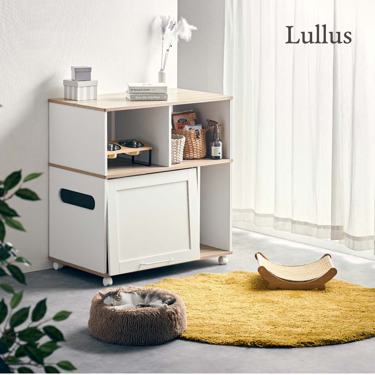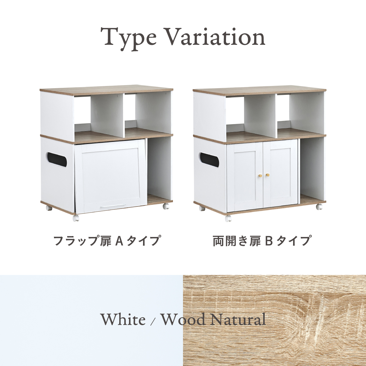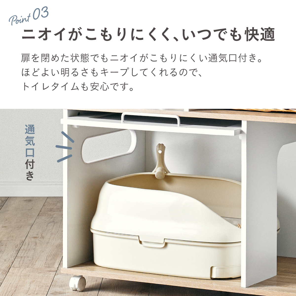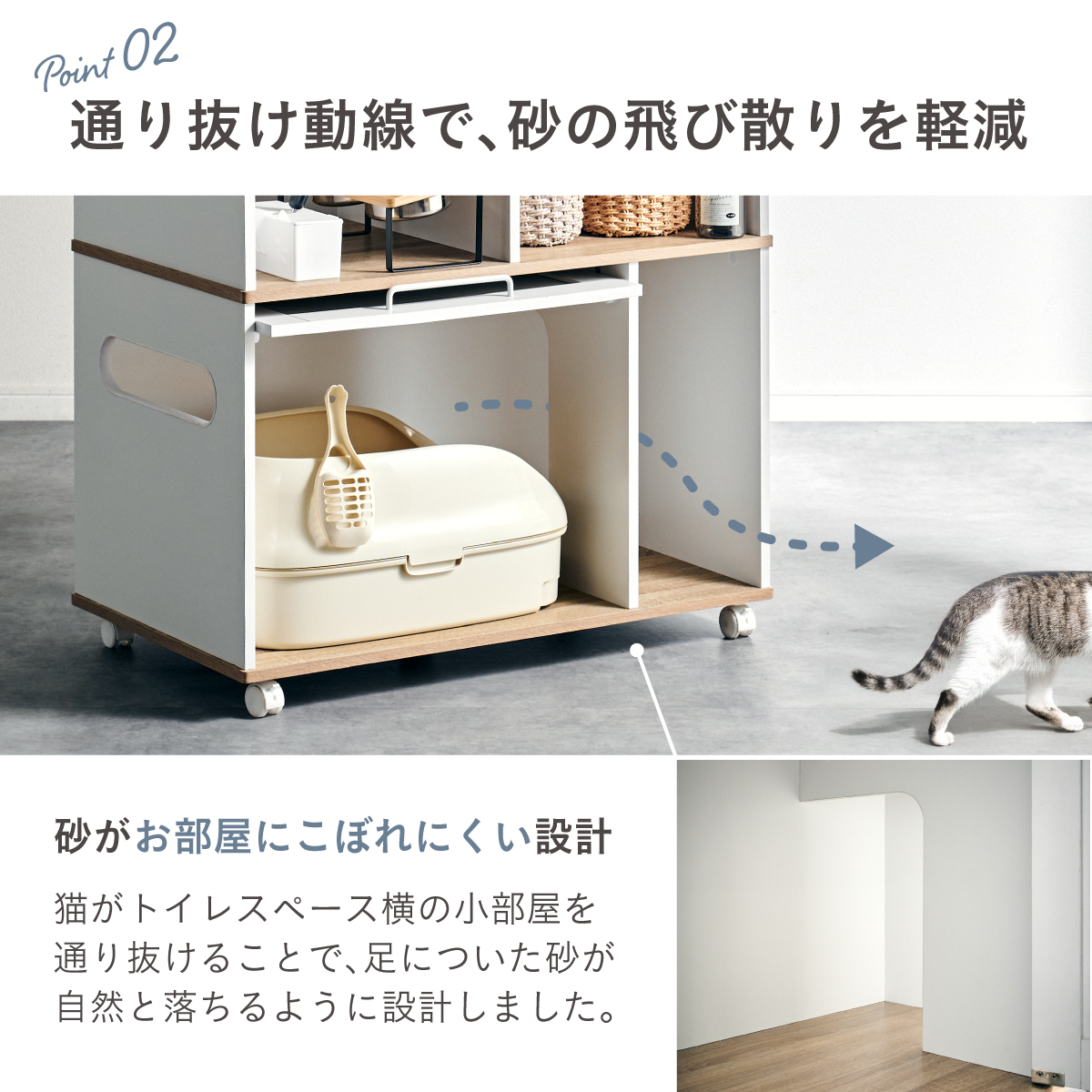 | リビングに置きたくなる 猫トイレ収納ラック Lullus(ルルス) トイレが隠せる 扉付き広々収納 ■フラップ扉Aタイプ ・上開きだから設置場所を選ばない ・片手でもラクラク開閉 ・開けたままでも見た目すっきり ■両開き扉Bタイプ ・猫が出入りしやすい広い入口設計 ・急な来客でも安心。インテリアに馴染む上品なデザイン ・前面フルオープンで掃除もラクラク ■こだわりのトイレ収納スペース設計 59x44cmの広々スペースで、一般的なサイズの猫トイレの出し入れがしやすく、猫ちゃんものびのび使えるゆとりのある空間に仕上げました。 ■通り抜け動線で、砂の飛び散りを軽減 猫がトイレスペース横の小部屋を通り抜けることで、足についた砂が自然と落ちるように設計しました。 ■ニオイがこもりにくく、いつでも快適 扉を閉めた状態でも匂いがこもりにくい通気口付き。ほどよい明るさもキープしてくれるので、トイレタイムも安心です。 ■日々のお手入れもラクラク どちらのタイプも扉を大きく開けられる設計で、トイレの掃除やスペースのお手入れがスムーズに行なえます。 ■2個のオープン収納スペースは、奥にものが落ちないこぼれ止め付き ■前面2個はロック機能付きのキャスター付き。キャスターは取り外しても使用可能です。 ※こちらの商品はお客様組み立てとなります。 ※組み立て方や若干の個体差によって、表記サイズと完成系のサイズに多少の誤差が生じる場合がございます。 ※リアルな木目調シートを採用しております。木目や節・傷に見えるダメージ加工・ヴィンテージ加工などは全てシートデザインとなります。これらを理由とした返品・交換は行っておりませんので、予めご了承ください。 | |