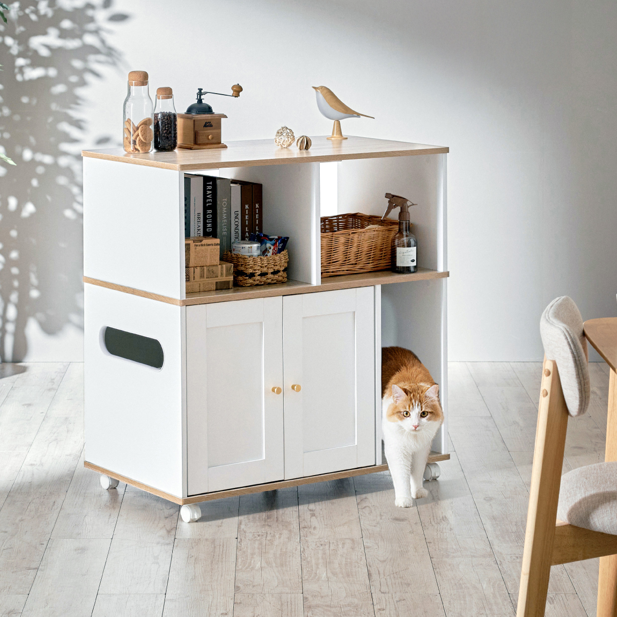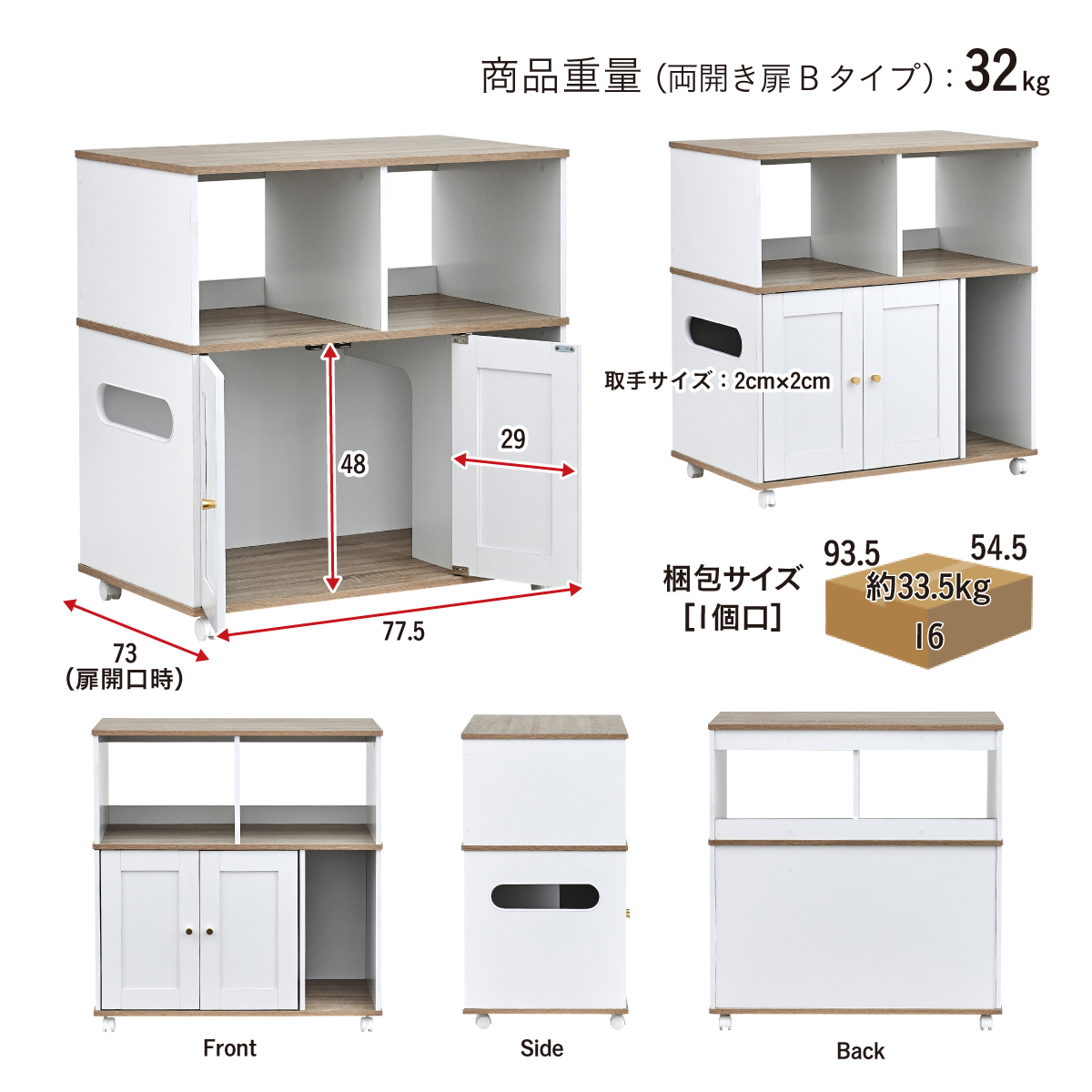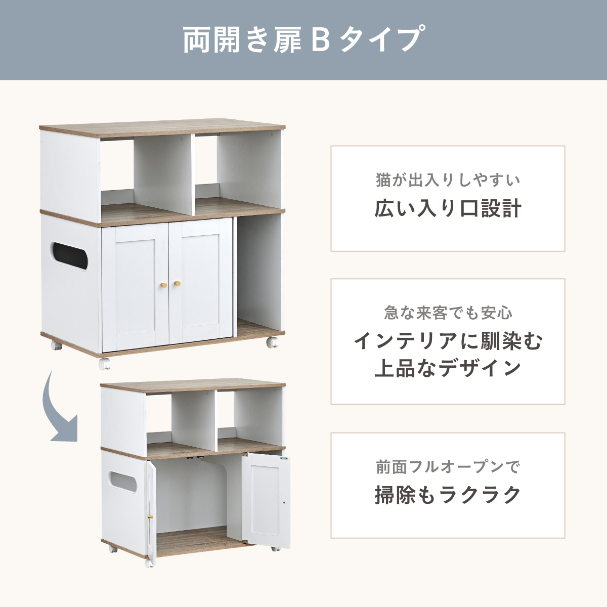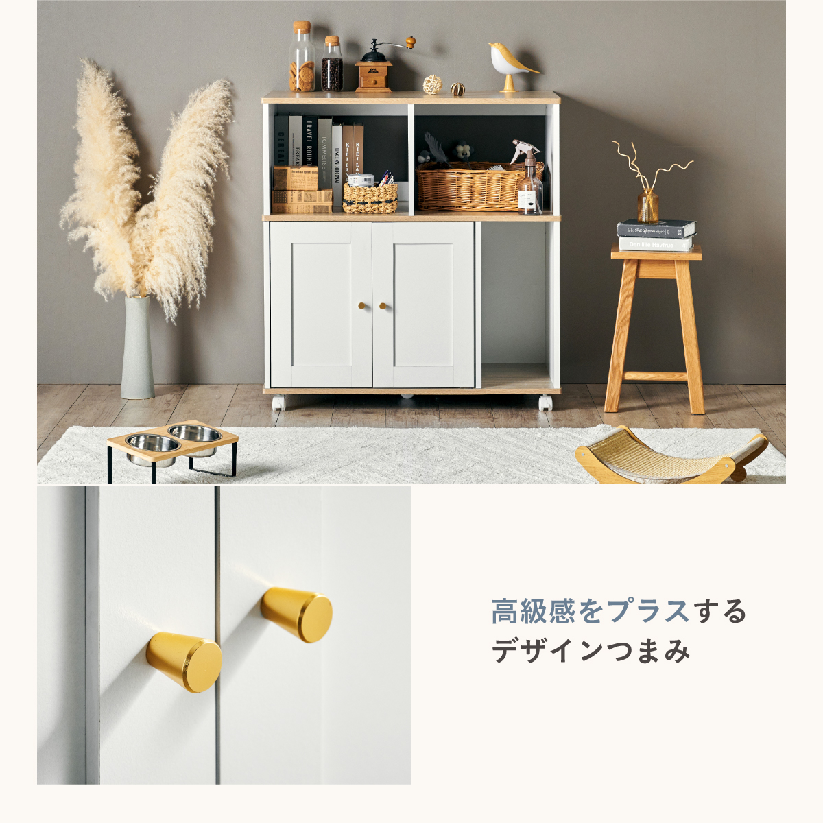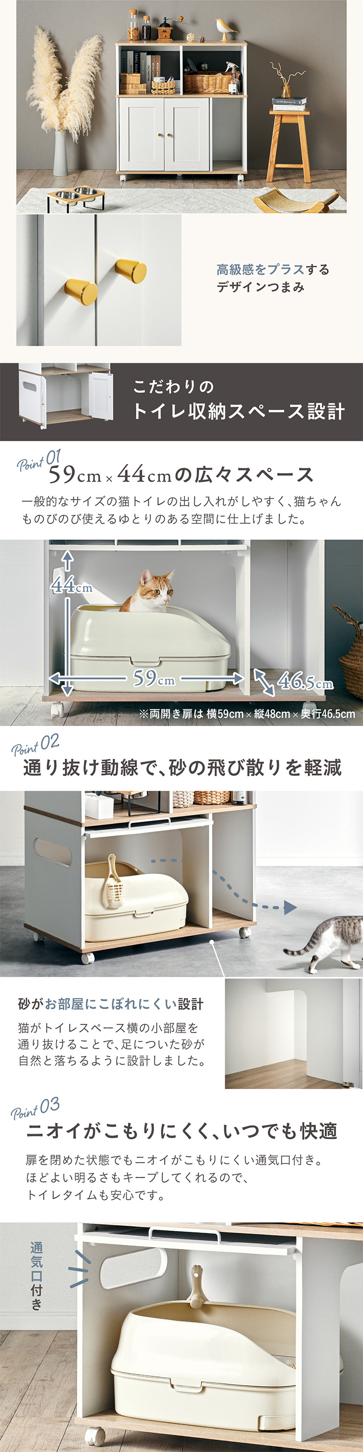 | リビングに置きたくなる 猫トイレ収納ラック Lullus(ルルス) トイレが隠せる 扉付き広々収納 ■フラップ扉Aタイプ ・上開きだから設置場所を選ばない ・片手でもラクラク開閉 ・開けたままでも見た目すっきり ■両開き扉Bタイプ ・猫が出入りしやすい広い入口設計 ・急な来客でも安心。インテリアに馴染む上品なデザイン ・前面フルオープンで掃除もラクラク ■こだわりのトイレ収納スペース設計 59x44cmの広々スペースで、一般的なサイズの猫トイレの出し入れがしやすく、猫ちゃんものびのび使えるゆとりのある空間に仕上げました。 ■通り抜け動線で、砂の飛び散りを軽減 猫がトイレスペース横の小部屋を通り抜けることで、足についた砂が自然と落ちるように設計しました。 ■ニオイがこもりにくく、いつでも快適 扉を閉めた状態でも匂いがこもりにくい通気口付き。ほどよい明るさもキープしてくれるので、トイレタイムも安心です。 ■日々のお手入れもラクラク どちらのタイプも扉を大きく開けられる設計で、トイレの掃除やスペースのお手入れがスムーズに行なえます。 ■2個のオープン収納スペースは、奥にものが落ちないこぼれ止め付き ■前面2個はロック機能付きのキャスター付き。キャスターは取り外しても使用可能です。 ※こちらの商品はお客様組み立てとなります。 ※組み立て方や若干の個体差によって、表記サイズと完成系のサイズに多少の誤差が生じる場合がございます。 ※リアルな木目調シートを採用しております。木目や節・傷に見えるダメージ加工・ヴィンテージ加工などは全てシートデザインとなります。これらを理由とした返品・交換は行っておりませんので、予めご了承ください。 | |