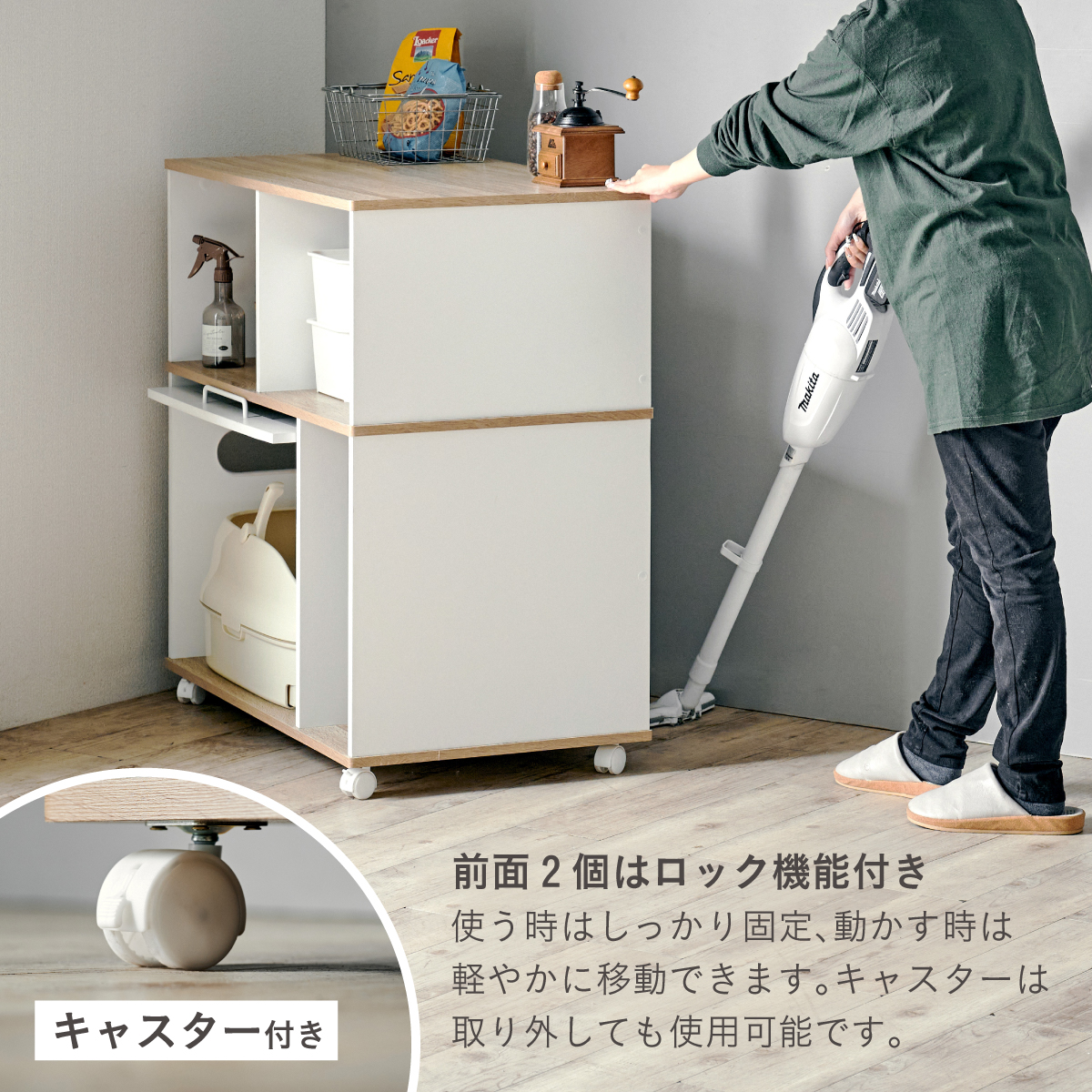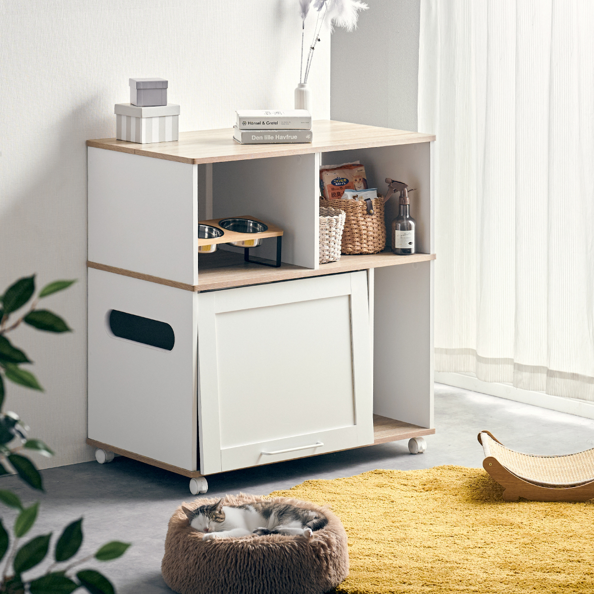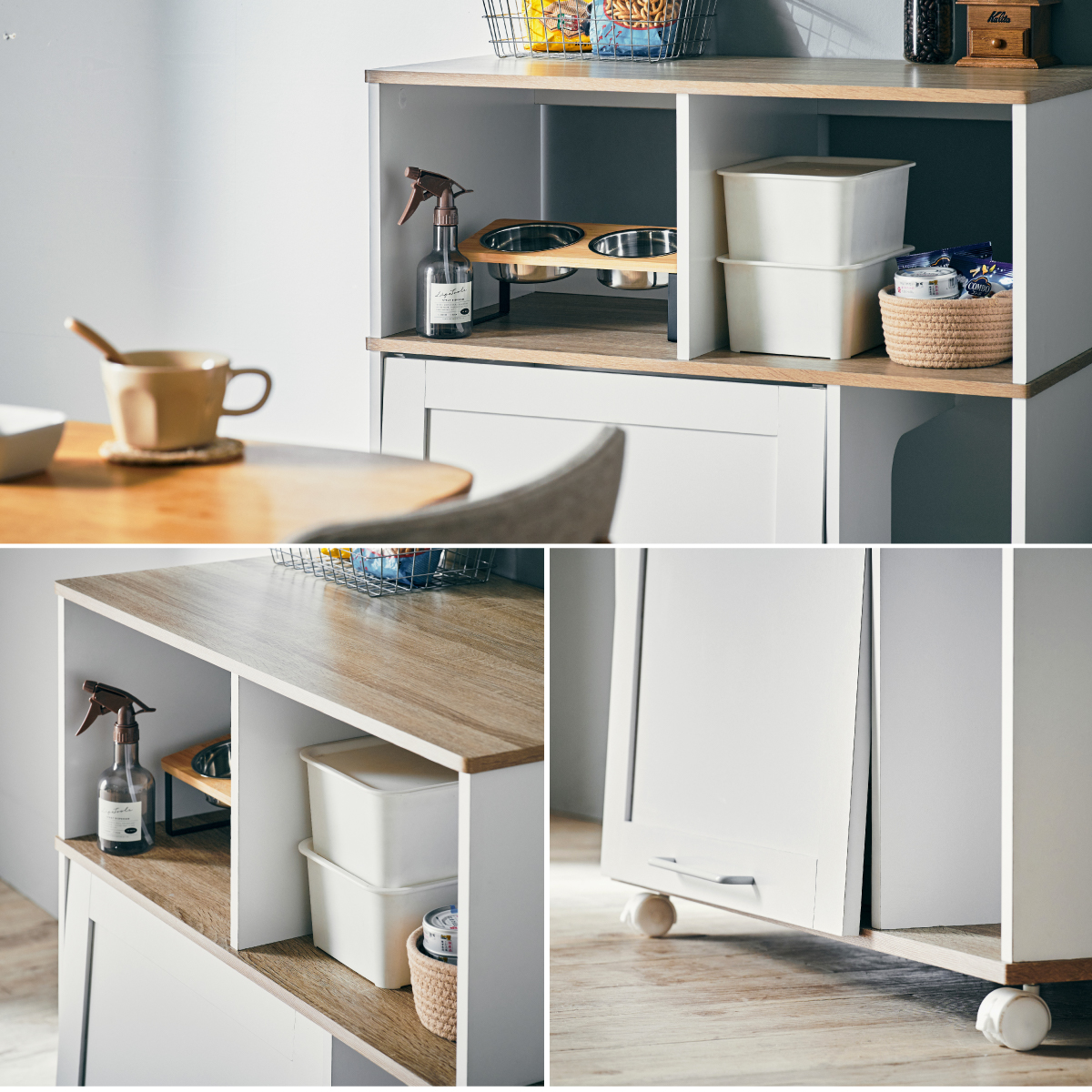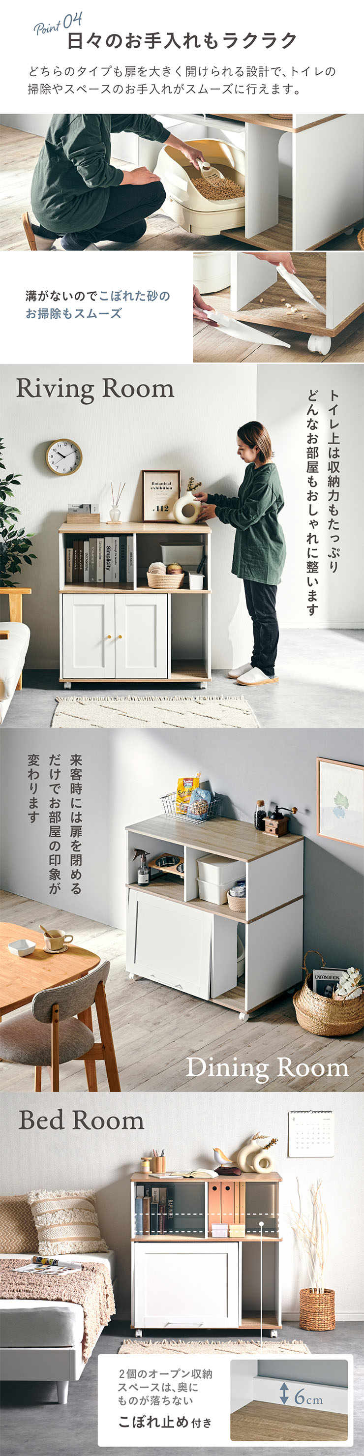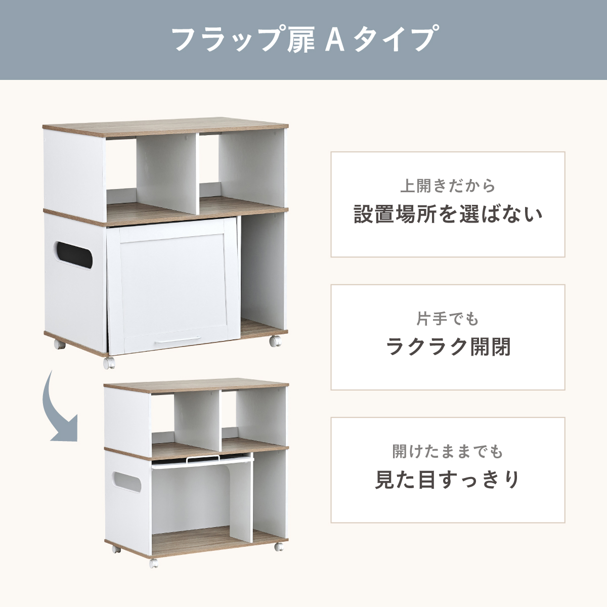 | リビングに置きたくなる 猫トイレ収納ラック Lullus(ルルス) トイレが隠せる 扉付き広々収納 ■フラップ扉Aタイプ ・上開きだから設置場所を選ばない ・片手でもラクラク開閉 ・開けたままでも見た目すっきり ■両開き扉Bタイプ ・猫が出入りしやすい広い入口設計 ・急な来客でも安心。インテリアに馴染む上品なデザイン ・前面フルオープンで掃除もラクラク ■こだわりのトイレ収納スペース設計 59x44cmの広々スペースで、一般的なサイズの猫トイレの出し入れがしやすく、猫ちゃんものびのび使えるゆとりのある空間に仕上げました。 ■通り抜け動線で、砂の飛び散りを軽減 猫がトイレスペース横の小部屋を通り抜けることで、足についた砂が自然と落ちるように設計しました。 ■ニオイがこもりにくく、いつでも快適 扉を閉めた状態でも匂いがこもりにくい通気口付き。ほどよい明るさもキープしてくれるので、トイレタイムも安心です。 ■日々のお手入れもラクラク どちらのタイプも扉を大きく開けられる設計で、トイレの掃除やスペースのお手入れがスムーズに行なえます。 ■2個のオープン収納スペースは、奥にものが落ちないこぼれ止め付き ■前面2個はロック機能付きのキャスター付き。キャスターは取り外しても使用可能です。 ※こちらの商品はお客様組み立てとなります。 ※組み立て方や若干の個体差によって、表記サイズと完成系のサイズに多少の誤差が生じる場合がございます。 ※リアルな木目調シートを採用しております。木目や節・傷に見えるダメージ加工・ヴィンテージ加工などは全てシートデザインとなります。これらを理由とした返品・交換は行っておりませんので、予めご了承ください。 | |