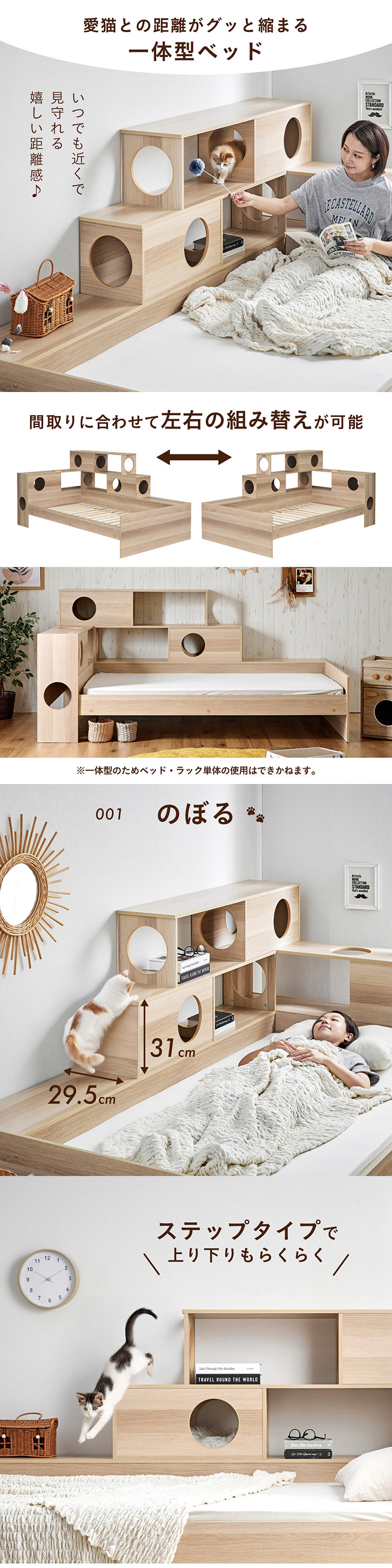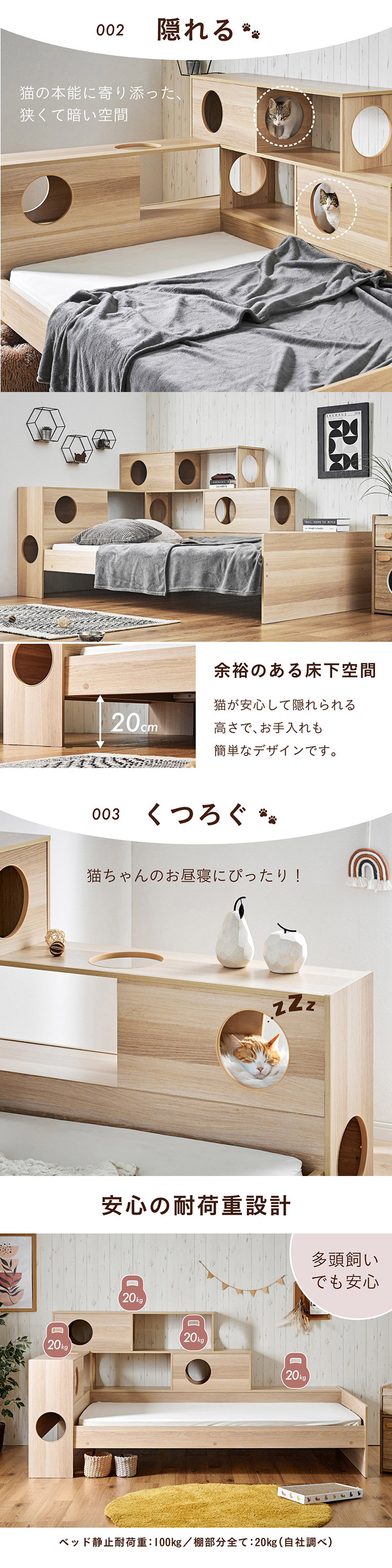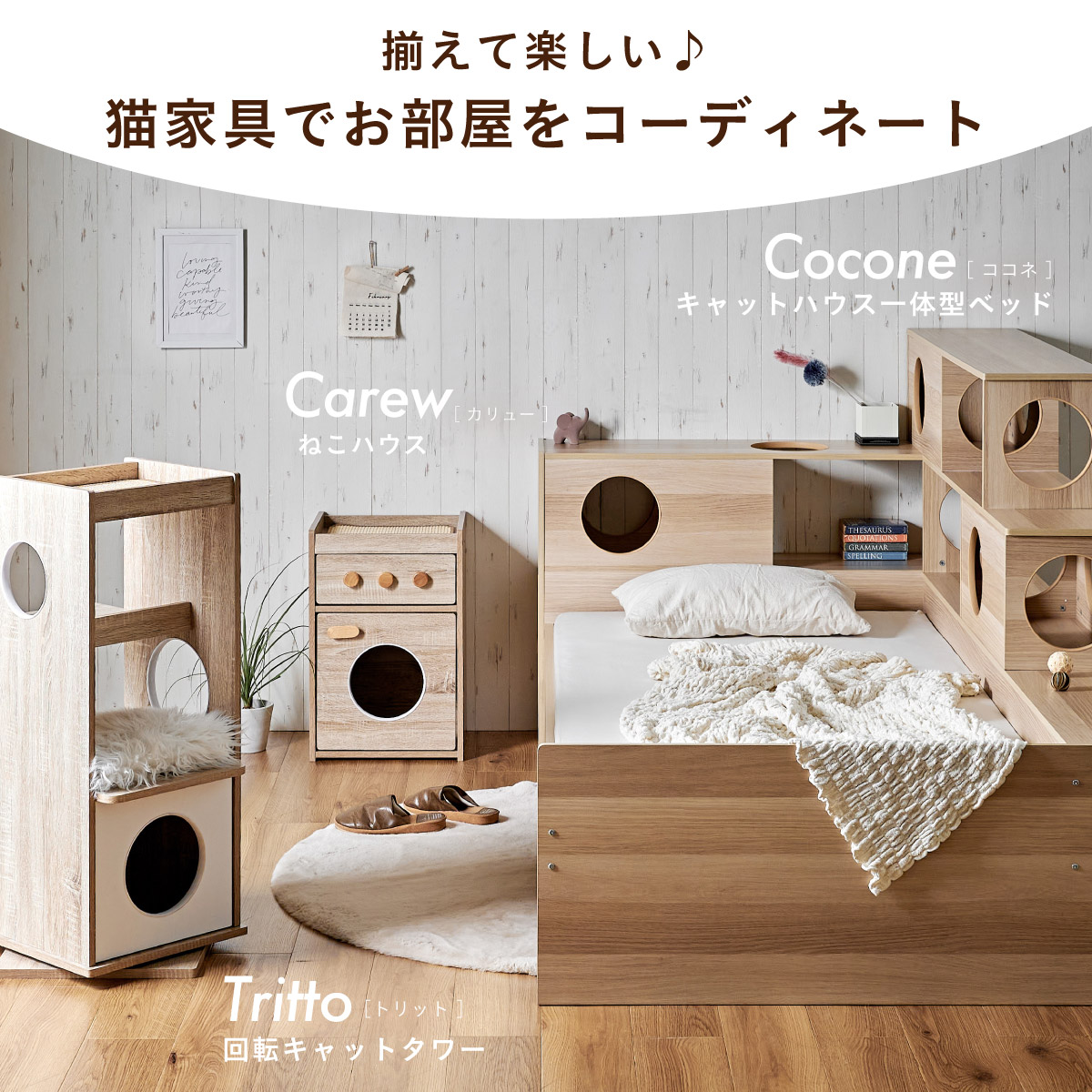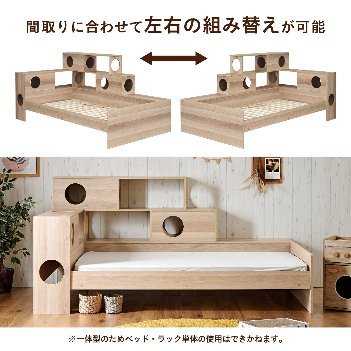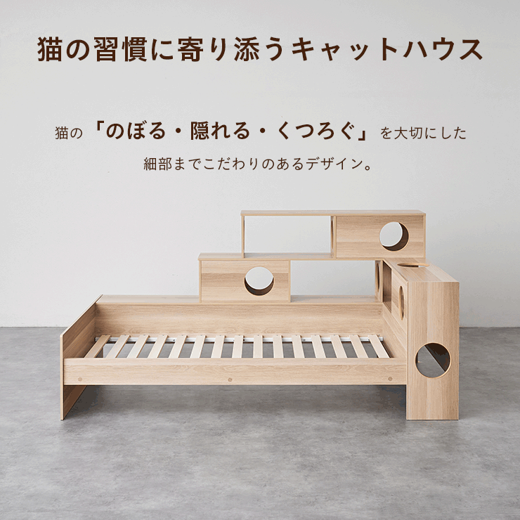 | 猫と暮らす キャットハウス一体型ベッド Cocone(ココネ) 猫の習慣に寄り添うキャットハウス 猫の「のぼる・隠れる・くつろぐ」を大切にした細部までこだわりのあるデザイン ■愛猫との距離がグッと縮まる一体型ベッド ■間取りに合わせて左右の組み替えが可能 ■余裕のある床下空間 猫が安心して隠れられる高さで、お手入れも簡単なデザインです。 ■安心の耐荷重設計 ベッド静止耐荷重:100kg/棚部分全て:20kg(自社調べ) ■クッション性のある樹脂製のTモール仕様で安心 角がない優しい加工で、猫の毛や肌を傷つけにくい設計。毎日の出入りも安心です。 ■安心・安全にこだわった角丸仕様 危険な角は丸く加工することで安全性アップ。見た目も優しい印象に ※こちらの商品はお客様組み立てとなります。 ※組み立て方や若干の個体差によって、表記サイズと完成系のサイズに多少の誤差が生じる場合がございます。 ※リアルな木目調シートを採用しております。木目や節・傷に見えるダメージ加工・ヴィンテージ加工などは全てシートデザインとなります。これらを理由とした返品・交換は行っておりませんので、予めご了承ください。 | |