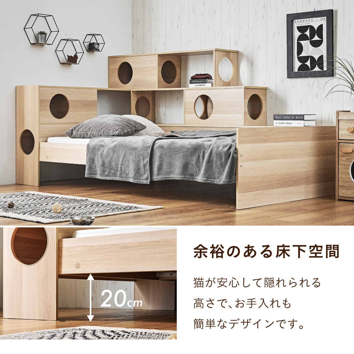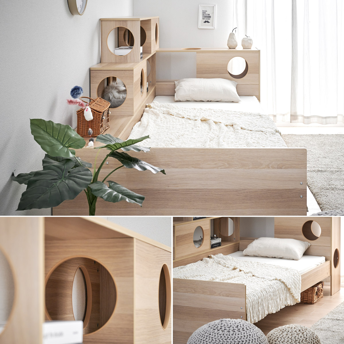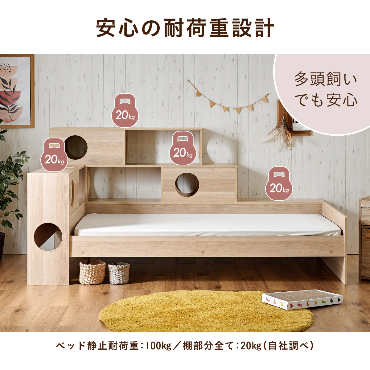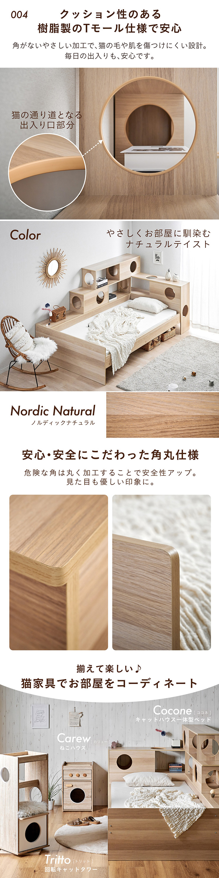 | 猫と暮らす キャットハウス一体型ベッド Cocone(ココネ) 猫の習慣に寄り添うキャットハウス 猫の「のぼる・隠れる・くつろぐ」を大切にした細部までこだわりのあるデザイン ■愛猫との距離がグッと縮まる一体型ベッド ■間取りに合わせて左右の組み替えが可能 ■余裕のある床下空間 猫が安心して隠れられる高さで、お手入れも簡単なデザインです。 ■安心の耐荷重設計 ベッド静止耐荷重:100kg/棚部分全て:20kg(自社調べ) ■クッション性のある樹脂製のTモール仕様で安心 角がない優しい加工で、猫の毛や肌を傷つけにくい設計。毎日の出入りも安心です。 ■安心・安全にこだわった角丸仕様 危険な角は丸く加工することで安全性アップ。見た目も優しい印象に ※こちらの商品はお客様組み立てとなります。 ※組み立て方や若干の個体差によって、表記サイズと完成系のサイズに多少の誤差が生じる場合がございます。 ※リアルな木目調シートを採用しております。木目や節・傷に見えるダメージ加工・ヴィンテージ加工などは全てシートデザインとなります。これらを理由とした返品・交換は行っておりませんので、予めご了承ください。 | |