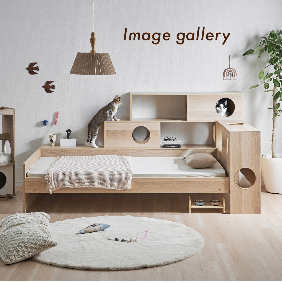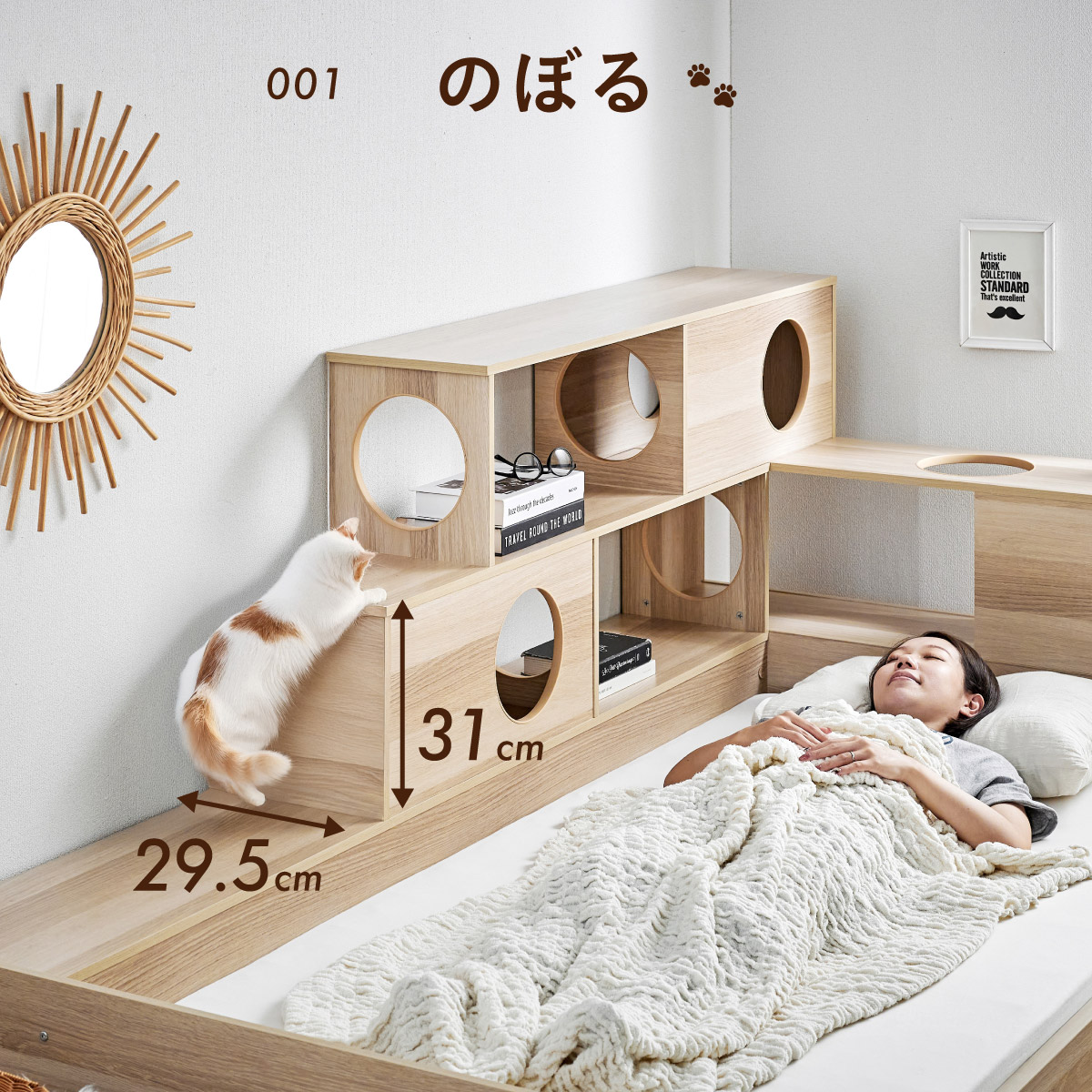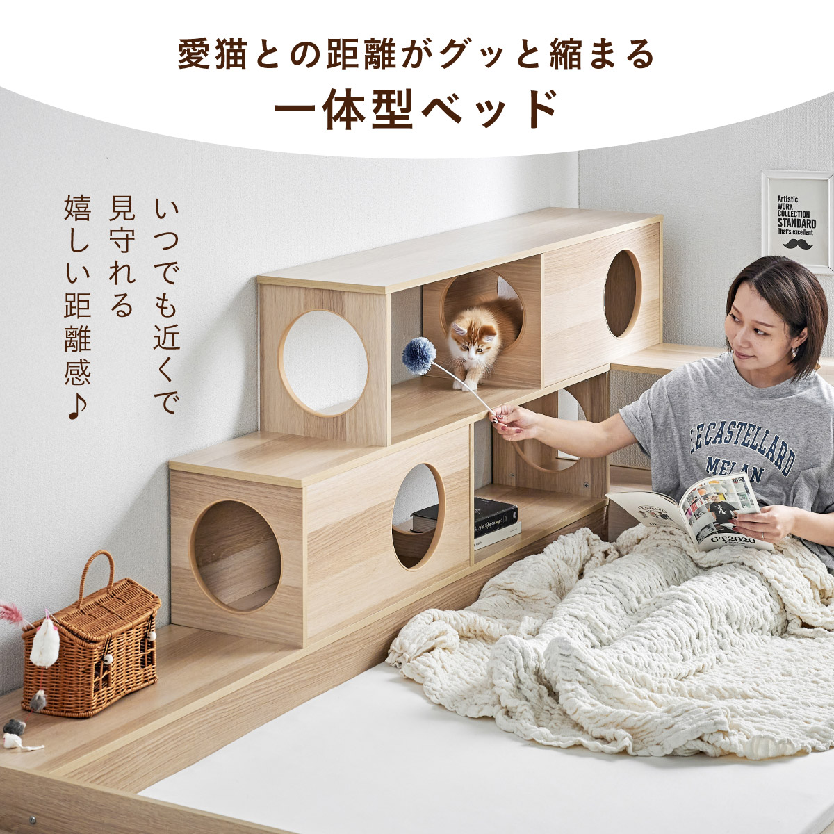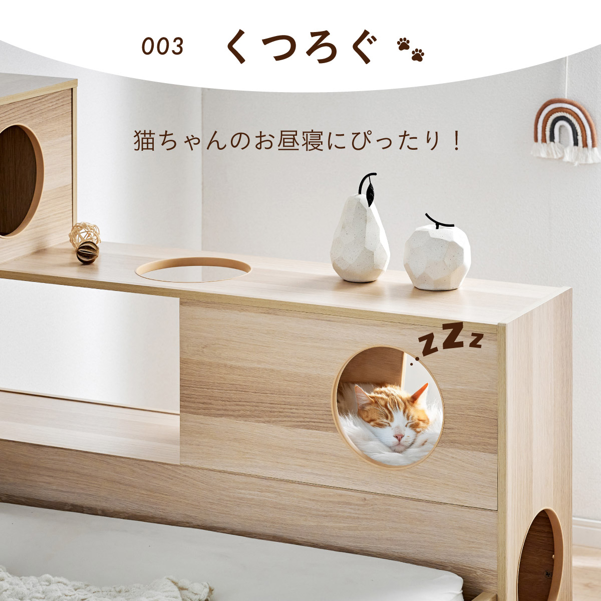 | 猫と暮らす キャットハウス一体型ベッド Cocone(ココネ) 猫の習慣に寄り添うキャットハウス 猫の「のぼる・隠れる・くつろぐ」を大切にした細部までこだわりのあるデザイン ■愛猫との距離がグッと縮まる一体型ベッド ■間取りに合わせて左右の組み替えが可能 ■余裕のある床下空間 猫が安心して隠れられる高さで、お手入れも簡単なデザインです。 ■安心の耐荷重設計 ベッド静止耐荷重:100kg/棚部分全て:20kg(自社調べ) ■クッション性のある樹脂製のTモール仕様で安心 角がない優しい加工で、猫の毛や肌を傷つけにくい設計。毎日の出入りも安心です。 ■安心・安全にこだわった角丸仕様 危険な角は丸く加工することで安全性アップ。見た目も優しい印象に ※こちらの商品はお客様組み立てとなります。 ※組み立て方や若干の個体差によって、表記サイズと完成系のサイズに多少の誤差が生じる場合がございます。 ※リアルな木目調シートを採用しております。木目や節・傷に見えるダメージ加工・ヴィンテージ加工などは全てシートデザインとなります。これらを理由とした返品・交換は行っておりませんので、予めご了承ください。 | |