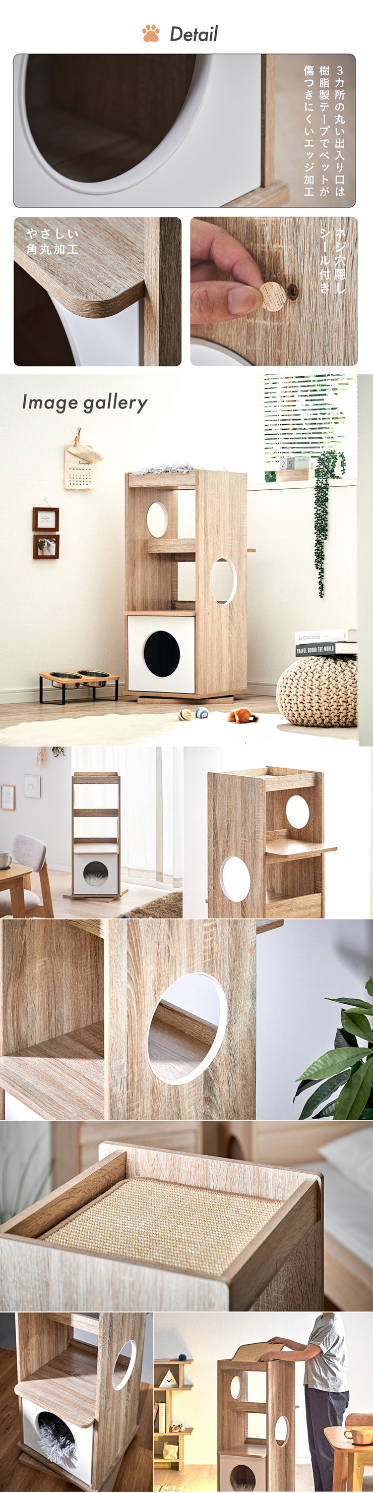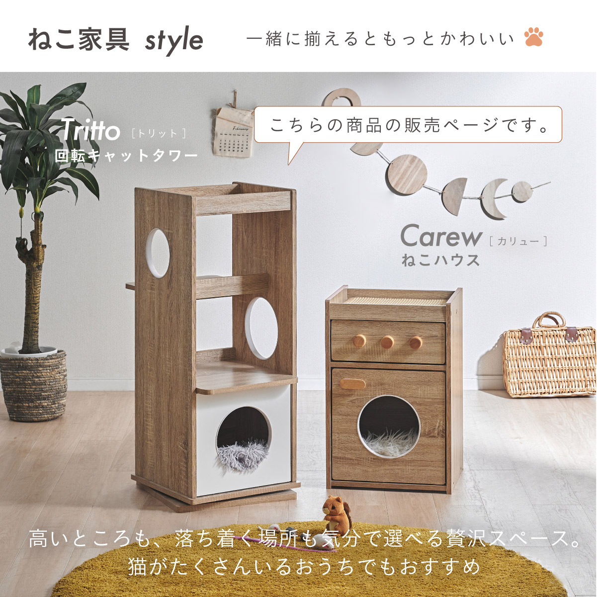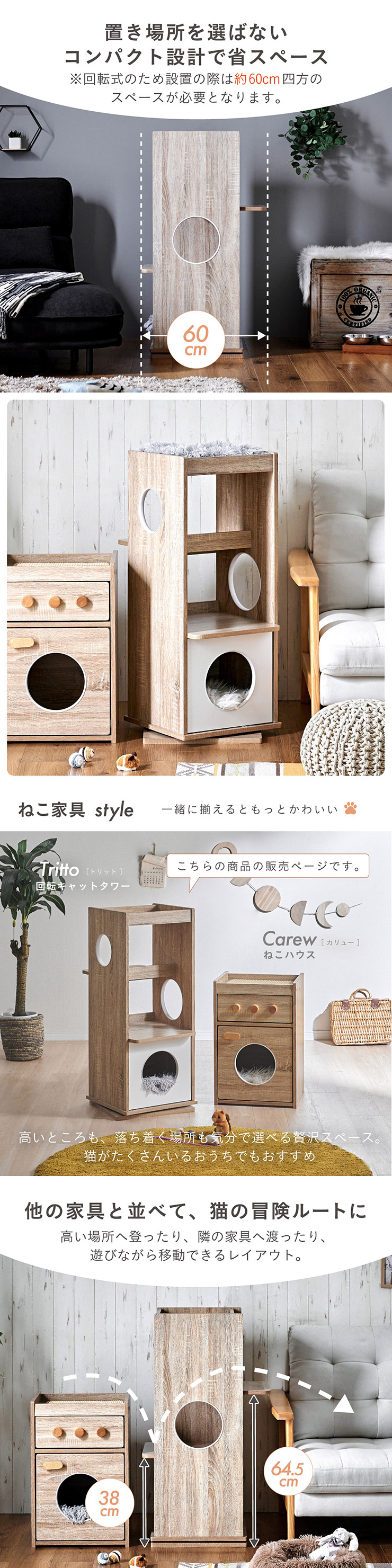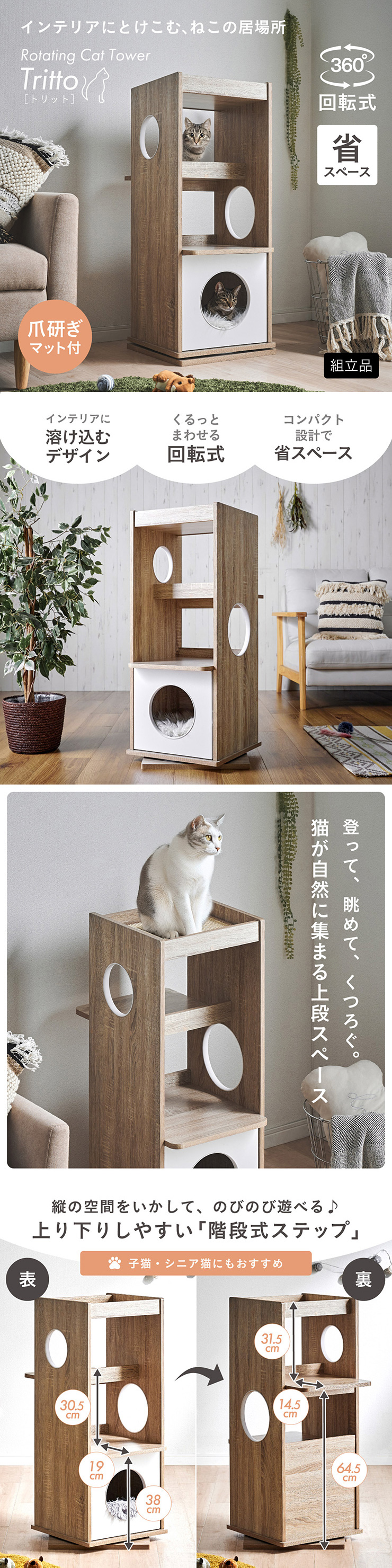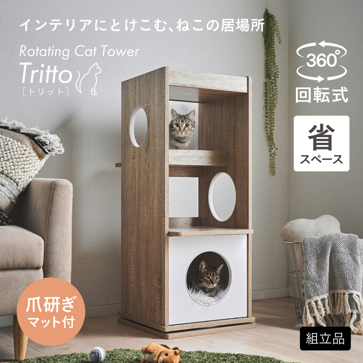 | インテリアにとけこむ、ねこの居場所 Tritto(トリット) 登って、眺めて、くつろぐ。 猫が自然に集まる上段スペース ■縦の空間をいかして、のびのび遊べる♪上り下りしやすい「階段式ステップ」 子猫・シニア猫にもおすすめ ■くるっと回して、いつでも模様替え お部屋のインテリアに合わせやすく、“ペット用品だけ浮いてしまう”という悩みを解消します。 ■回転構造の新発想 スムーズに回る360°回転 ■置き場所を選ばない コンパクト設計で省スペース ※回転式のため設置の際は約60cm四方のスペースが必要となります。 ■他の家具と並べて、猫の冒険ルートに 高い場所へ登ったり、隣の家具へ渡ったり、遊びながら移動できるレイアウト ■お手入れラクなキャットタワー 布製に比べて毛やホコリが付きにくく、毛が絡まないから、毎日の掃除がぐっとラクに ■天板には麻製の爪とぎマット付き 丈夫なためゴミが出にくく、耐久性があり長くご利用いただけます マットは付属の木ネジで固定も可能(※ネジ止めをするとネジ穴が残ります) ■detail ・3ヵ所の丸い出入り口は樹脂製テープでペットが傷つきにくいエッジ加工 ・やさしい角丸加工 ・ネジ穴隠しシール付き ※こちらの商品はお客様組み立てとなります。 ※壁際に設置する場合は壁から8cm以上離してご使用ください。 ※組み立て方や若干の個体差によって、表記サイズと完成系のサイズに多少の誤差が生じる場合がございます。 ※リアルな木目調シートを採用しております。木目や節・傷に見えるダメージ加工・ヴィンテージ加工などは全てシートデザインとなります。これらを理由とした返品・交換は行っておりませんので、予めご了承ください。 | |