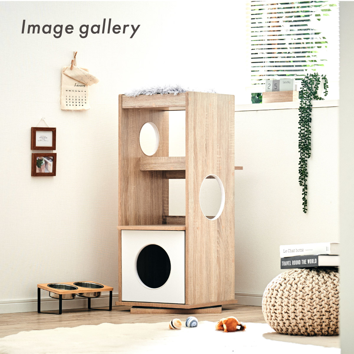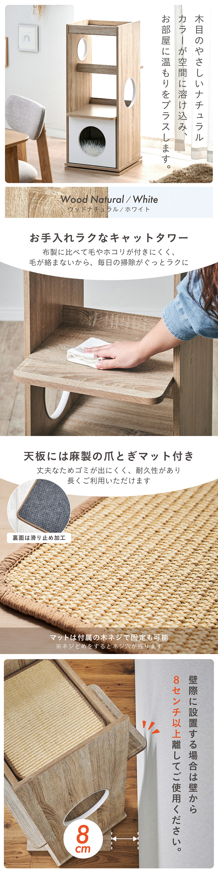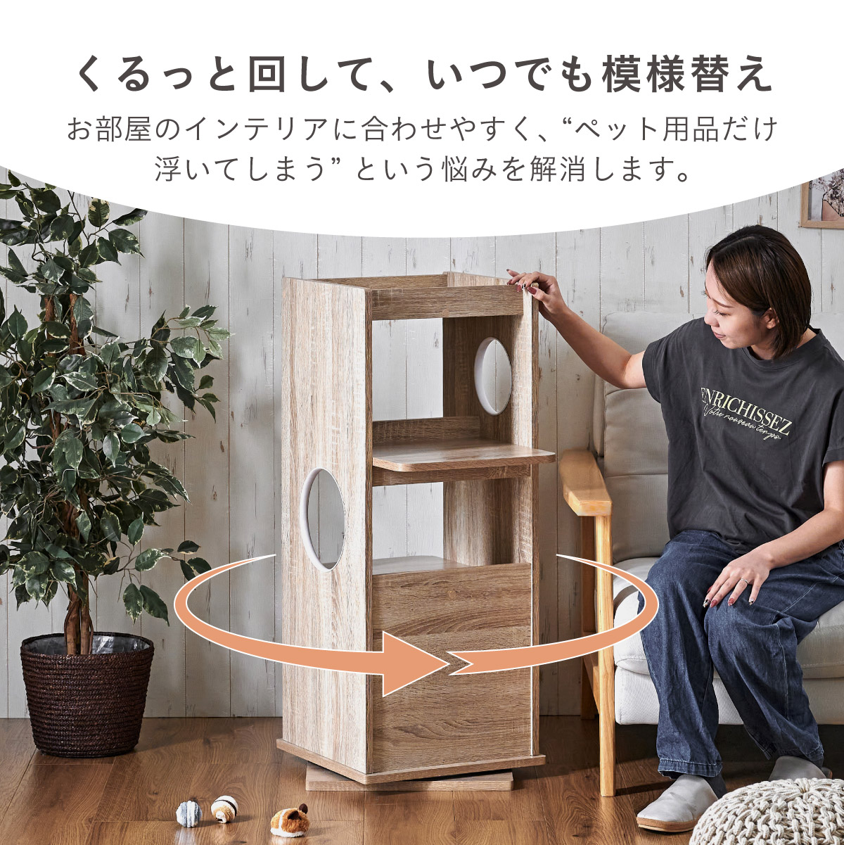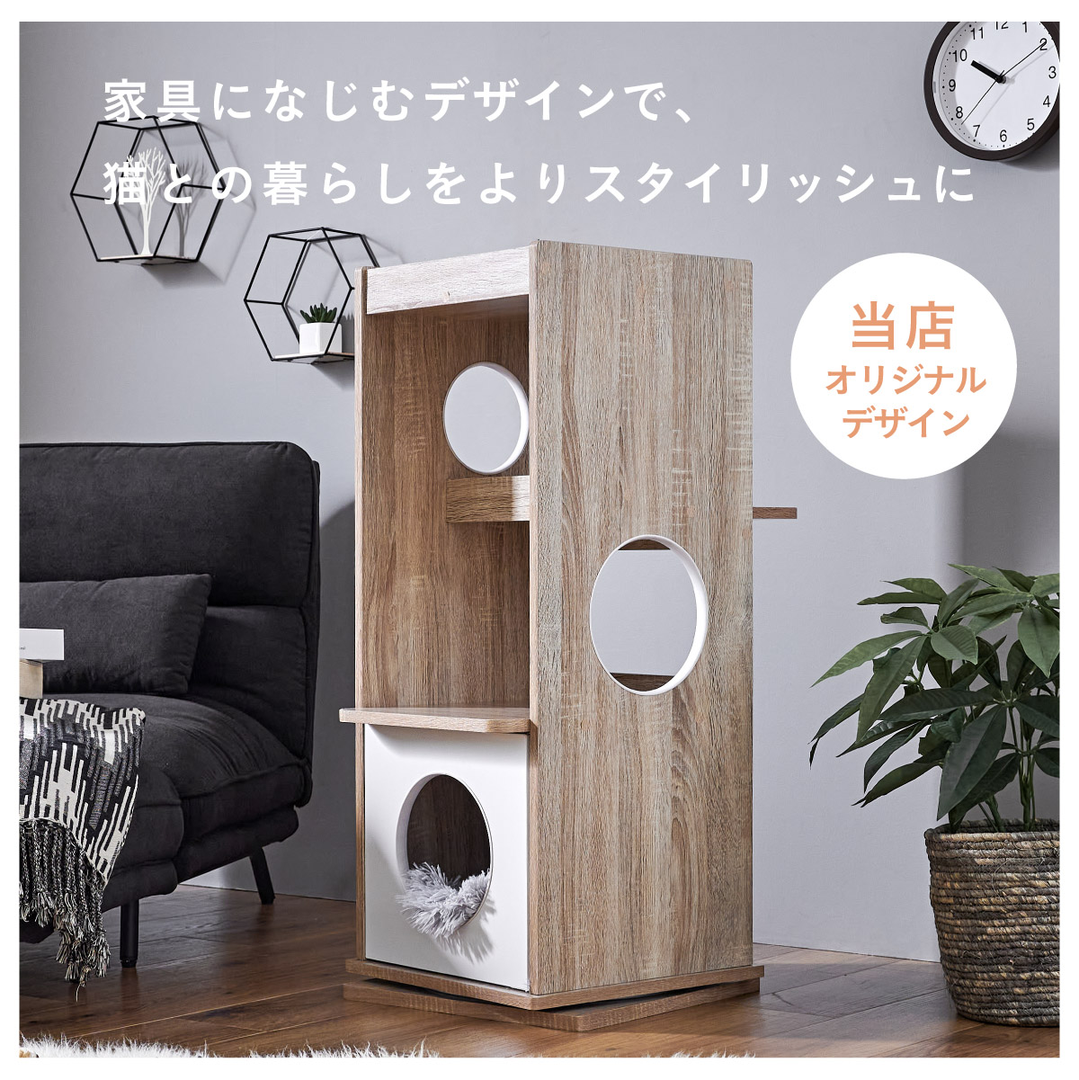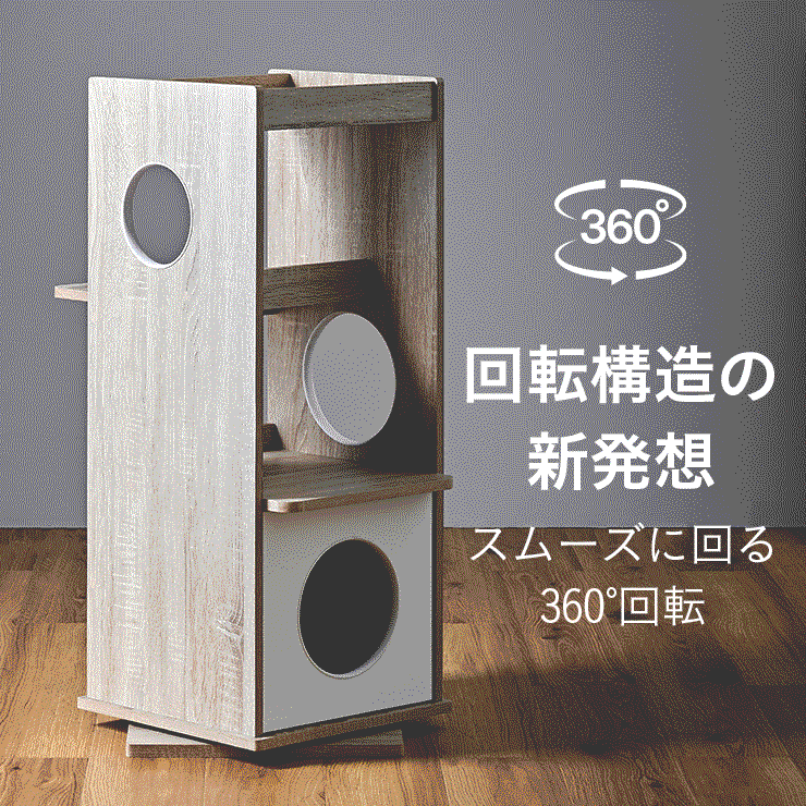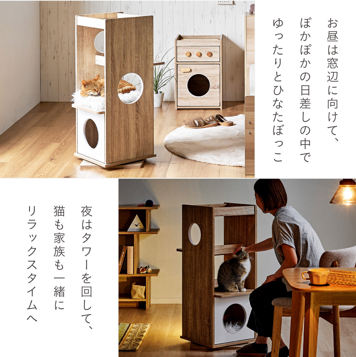 | インテリアにとけこむ、ねこの居場所 Tritto(トリット) 登って、眺めて、くつろぐ。 猫が自然に集まる上段スペース ■縦の空間をいかして、のびのび遊べる♪上り下りしやすい「階段式ステップ」 子猫・シニア猫にもおすすめ ■くるっと回して、いつでも模様替え お部屋のインテリアに合わせやすく、“ペット用品だけ浮いてしまう”という悩みを解消します。 ■回転構造の新発想 スムーズに回る360°回転 ■置き場所を選ばない コンパクト設計で省スペース ※回転式のため設置の際は約60cm四方のスペースが必要となります。 ■他の家具と並べて、猫の冒険ルートに 高い場所へ登ったり、隣の家具へ渡ったり、遊びながら移動できるレイアウト ■お手入れラクなキャットタワー 布製に比べて毛やホコリが付きにくく、毛が絡まないから、毎日の掃除がぐっとラクに ■天板には麻製の爪とぎマット付き 丈夫なためゴミが出にくく、耐久性があり長くご利用いただけます マットは付属の木ネジで固定も可能(※ネジ止めをするとネジ穴が残ります) ■detail ・3ヵ所の丸い出入り口は樹脂製テープでペットが傷つきにくいエッジ加工 ・やさしい角丸加工 ・ネジ穴隠しシール付き ※こちらの商品はお客様組み立てとなります。 ※壁際に設置する場合は壁から8cm以上離してご使用ください。 ※組み立て方や若干の個体差によって、表記サイズと完成系のサイズに多少の誤差が生じる場合がございます。 ※リアルな木目調シートを採用しております。木目や節・傷に見えるダメージ加工・ヴィンテージ加工などは全てシートデザインとなります。これらを理由とした返品・交換は行っておりませんので、予めご了承ください。 | |