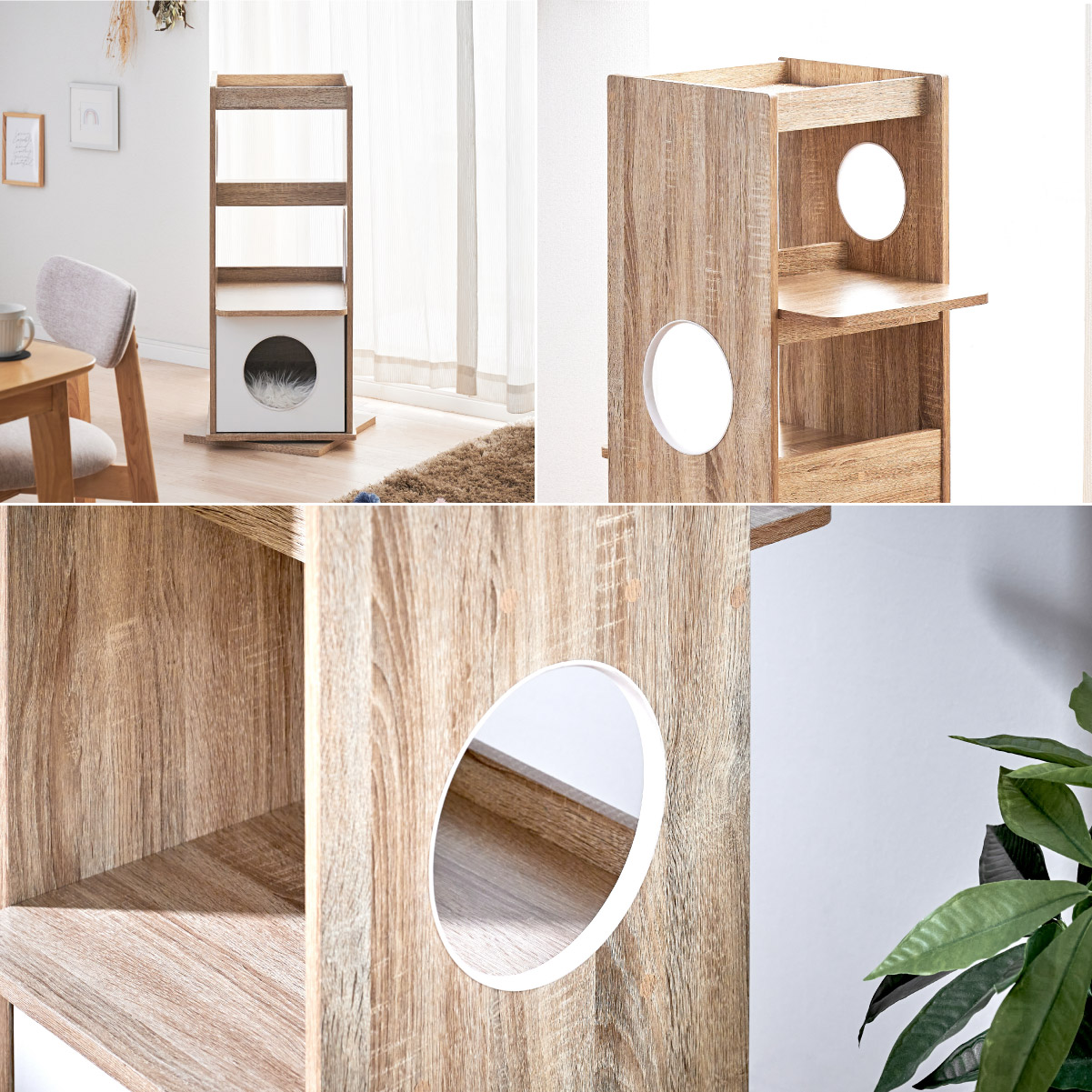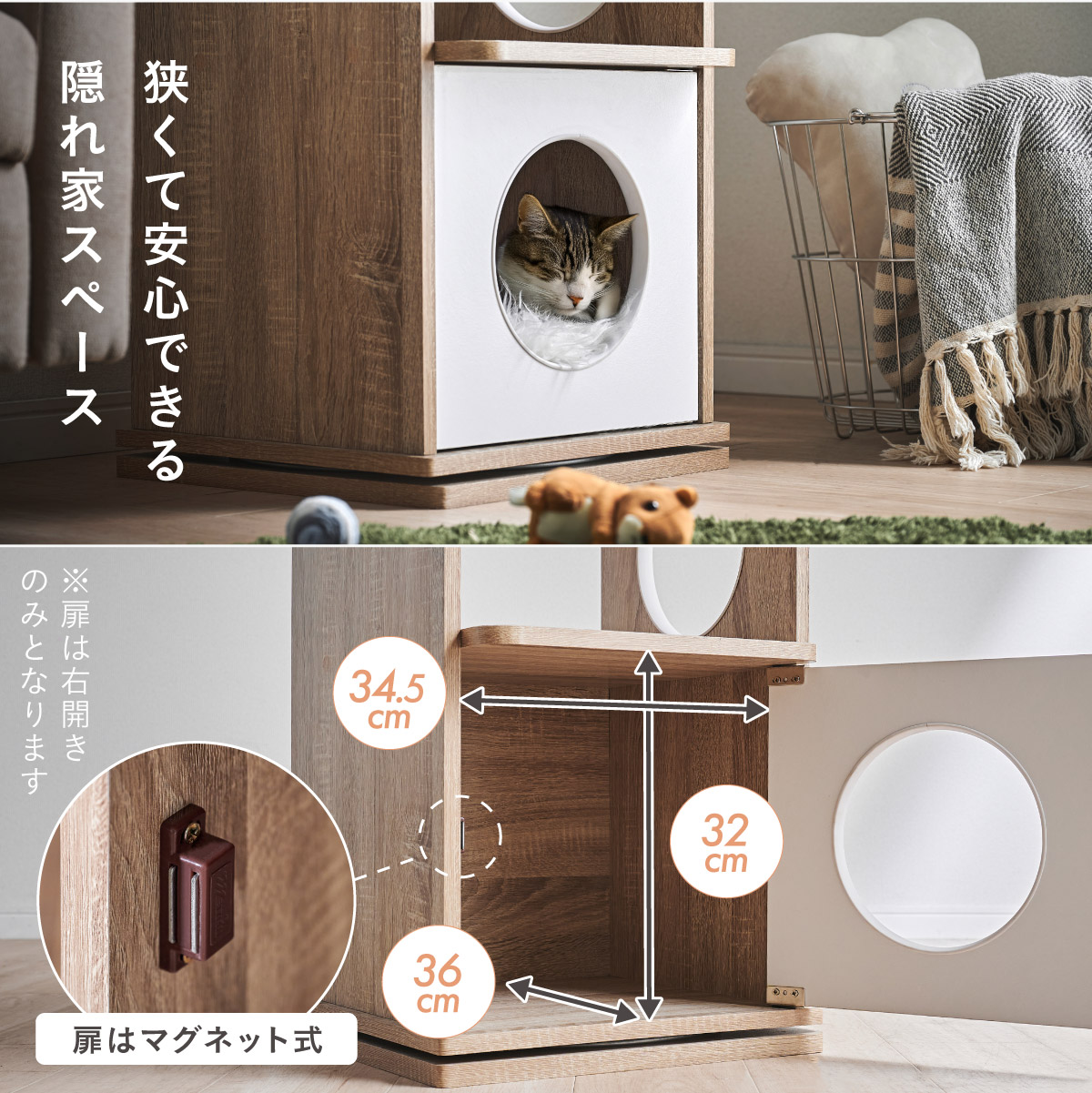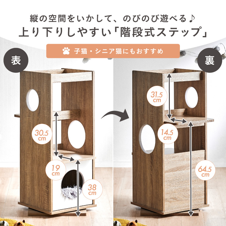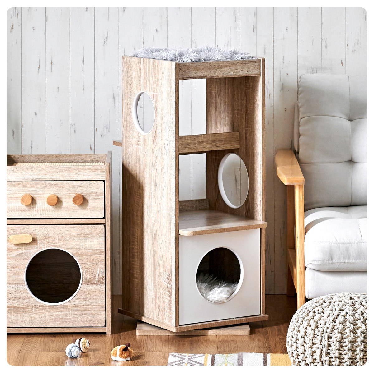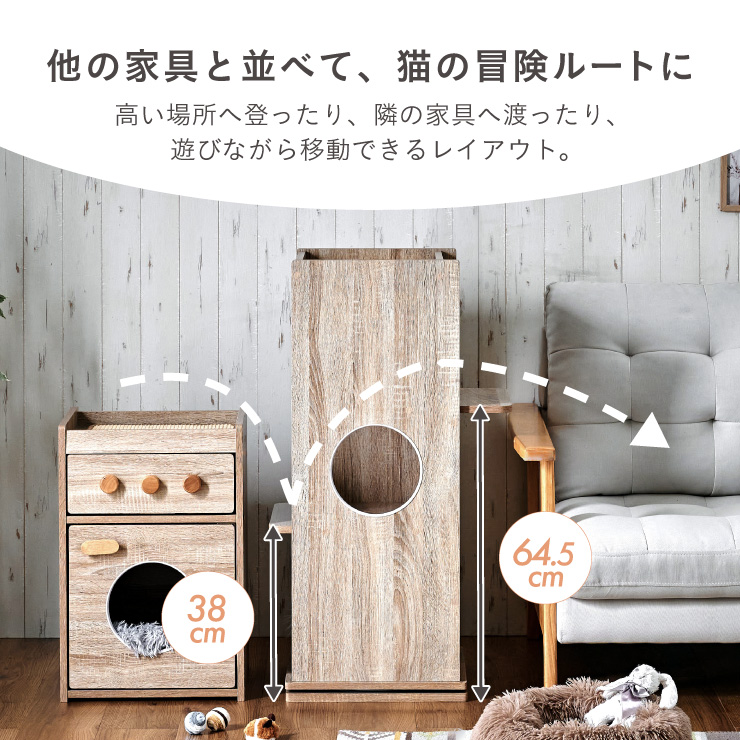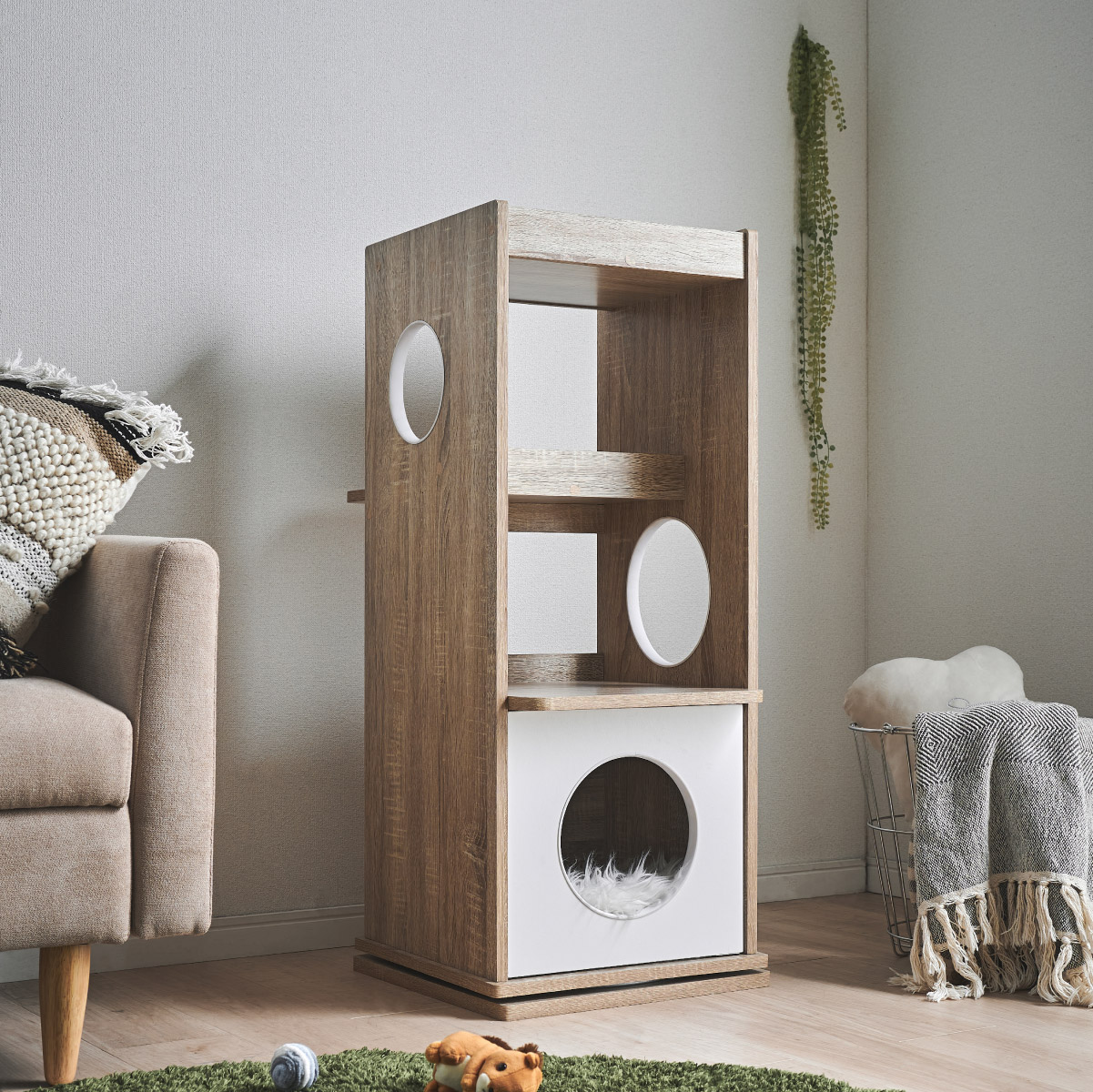 | インテリアにとけこむ、ねこの居場所 Tritto(トリット) 登って、眺めて、くつろぐ。 猫が自然に集まる上段スペース ■縦の空間をいかして、のびのび遊べる♪上り下りしやすい「階段式ステップ」 子猫・シニア猫にもおすすめ ■くるっと回して、いつでも模様替え お部屋のインテリアに合わせやすく、“ペット用品だけ浮いてしまう”という悩みを解消します。 ■回転構造の新発想 スムーズに回る360°回転 ■置き場所を選ばない コンパクト設計で省スペース ※回転式のため設置の際は約60cm四方のスペースが必要となります。 ■他の家具と並べて、猫の冒険ルートに 高い場所へ登ったり、隣の家具へ渡ったり、遊びながら移動できるレイアウト ■お手入れラクなキャットタワー 布製に比べて毛やホコリが付きにくく、毛が絡まないから、毎日の掃除がぐっとラクに ■天板には麻製の爪とぎマット付き 丈夫なためゴミが出にくく、耐久性があり長くご利用いただけます マットは付属の木ネジで固定も可能(※ネジ止めをするとネジ穴が残ります) ■detail ・3ヵ所の丸い出入り口は樹脂製テープでペットが傷つきにくいエッジ加工 ・やさしい角丸加工 ・ネジ穴隠しシール付き ※こちらの商品はお客様組み立てとなります。 ※壁際に設置する場合は壁から8cm以上離してご使用ください。 ※組み立て方や若干の個体差によって、表記サイズと完成系のサイズに多少の誤差が生じる場合がございます。 ※リアルな木目調シートを採用しております。木目や節・傷に見えるダメージ加工・ヴィンテージ加工などは全てシートデザインとなります。これらを理由とした返品・交換は行っておりませんので、予めご了承ください。 | |