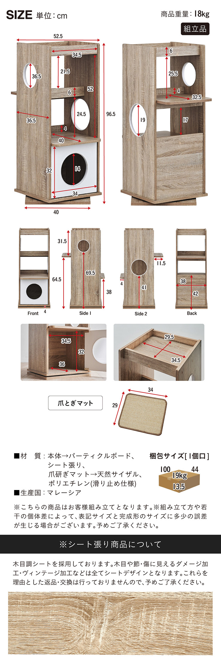 | 商品サイズ | 約W40 x D40 x H96.5cm(重量:約18kg) 爪とぎマット:約34 x 29cm |